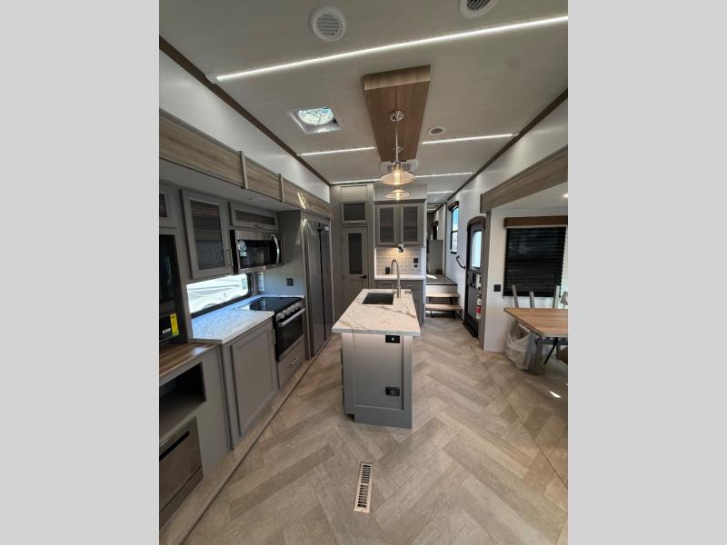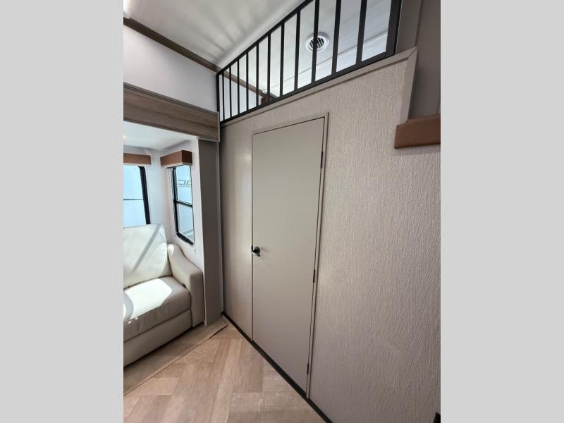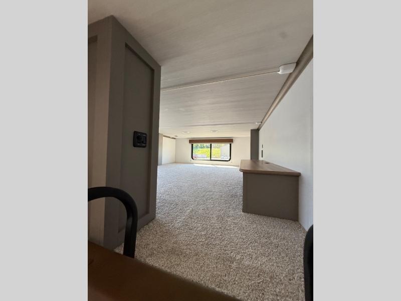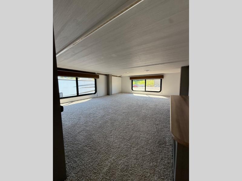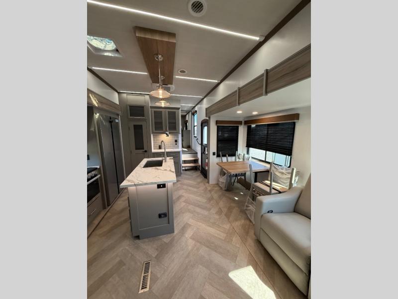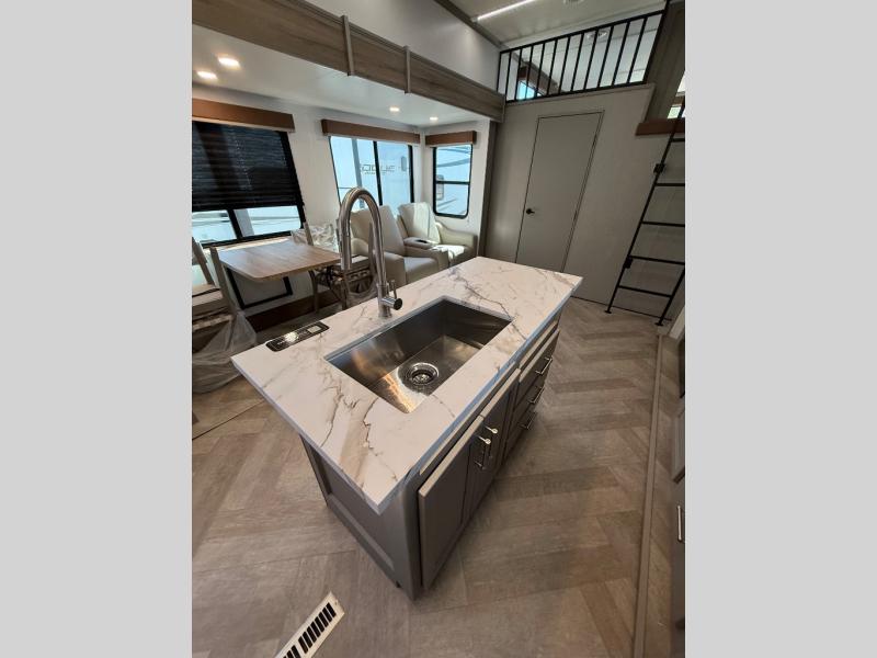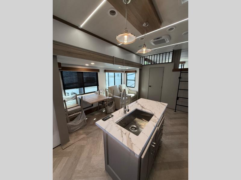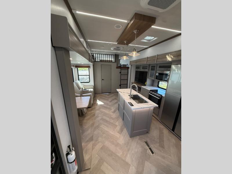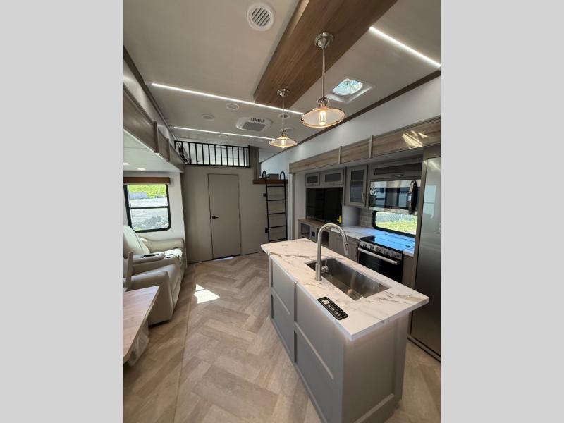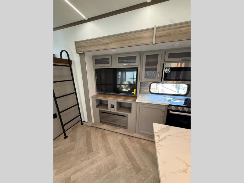 Two bedrooms and two full baths make this fifth wheel perfect for camping with friends and family! The front bedroom includes a king bed slide out with storage underneath, a wardrobe with a shelf, plus a closet with washer and dryer prep if you want to add these appliances. The master suite includes a second king bed slide out, dual wardrobes and a dresser, plus a full rear bath with one of the dual entry doors. There is also a loft area above this room with plenty of space, an entertainment/gaming center, and a ladder. Everyone can meet in the main living area to relax on the theater seating or dine at the booth dinette. And a full kitchen is complete with an island, pantry, 16 cu. ft. 12V refrigerator, and a hutch to name a few convenient features!