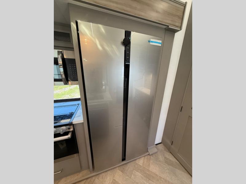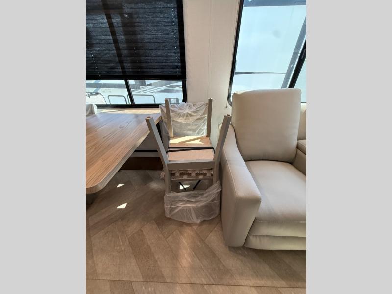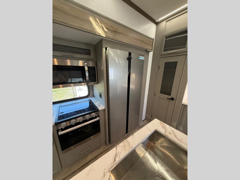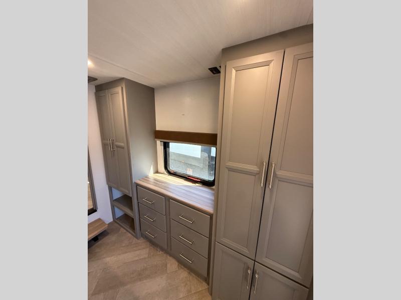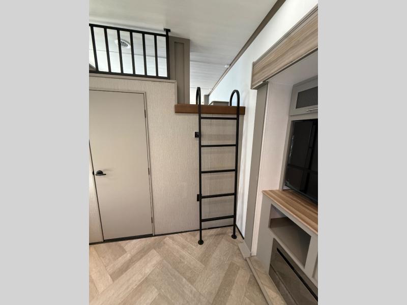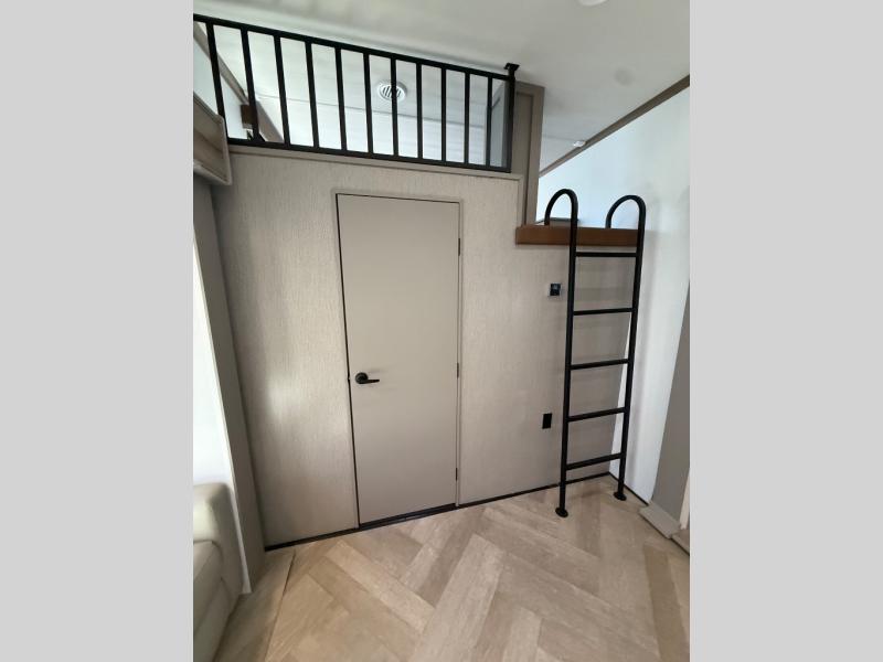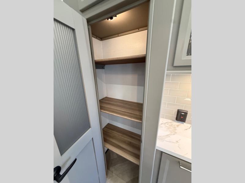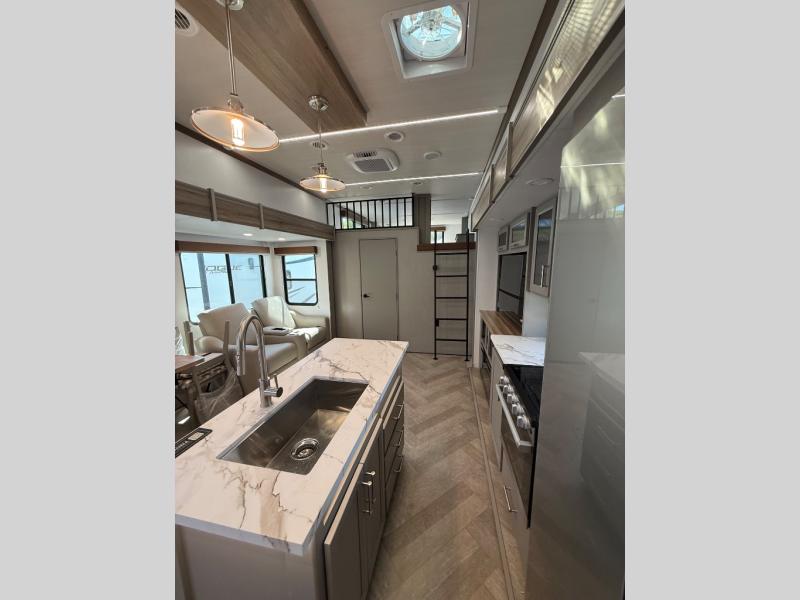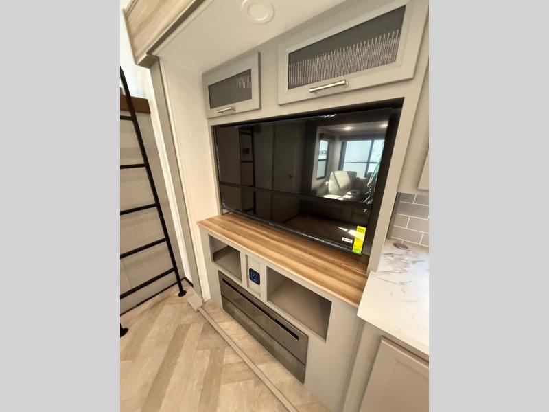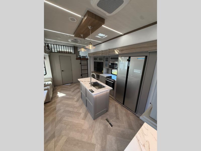 Two bedrooms and two full baths make this fifth wheel perfect for camping with friends and family! The front bedroom includes a king bed slide out with storage underneath, a wardrobe with a shelf, plus a closet with washer and dryer prep if you want to add these appliances. The master suite includes a second king bed slide out, dual wardrobes and a dresser, plus a full rear bath with one of the dual entry doors. There is also a loft area above this room with plenty of space, an entertainment/gaming center, and a ladder. Everyone can meet in the main living area to relax on the theater seating or dine at the booth dinette. And a full kitchen is complete with an island, pantry, 16 cu. ft. 12V refrigerator, and a hutch to name a few convenient features!