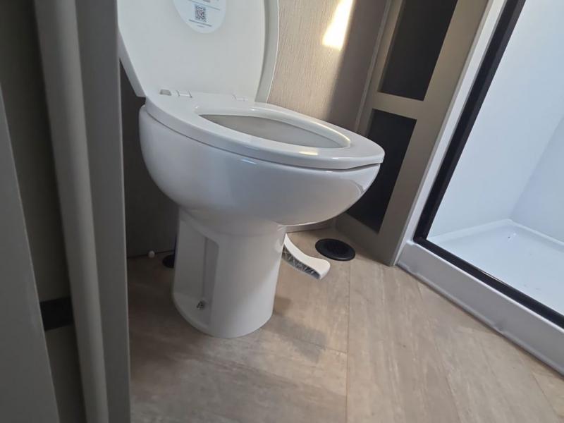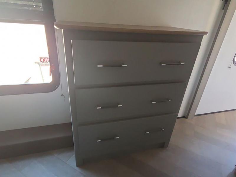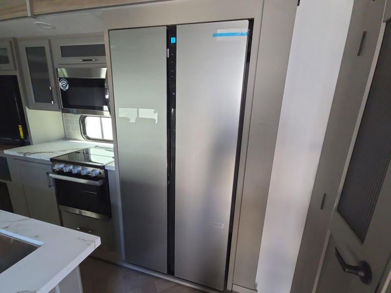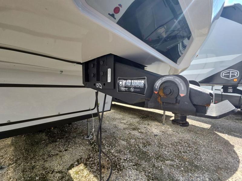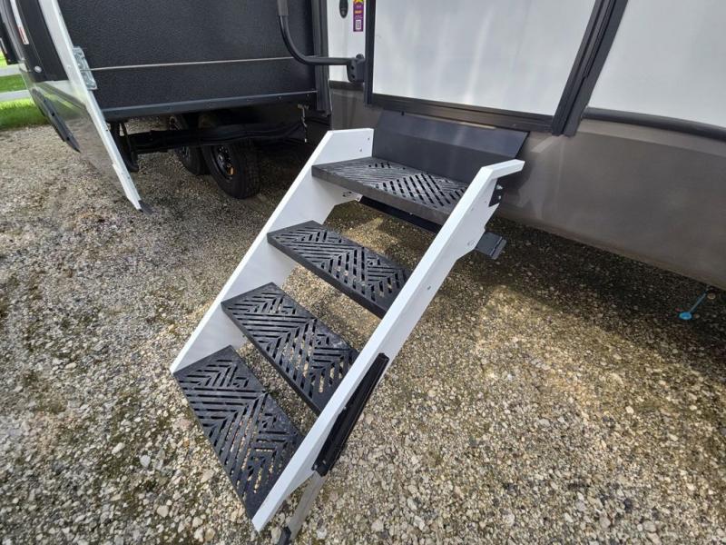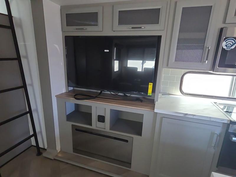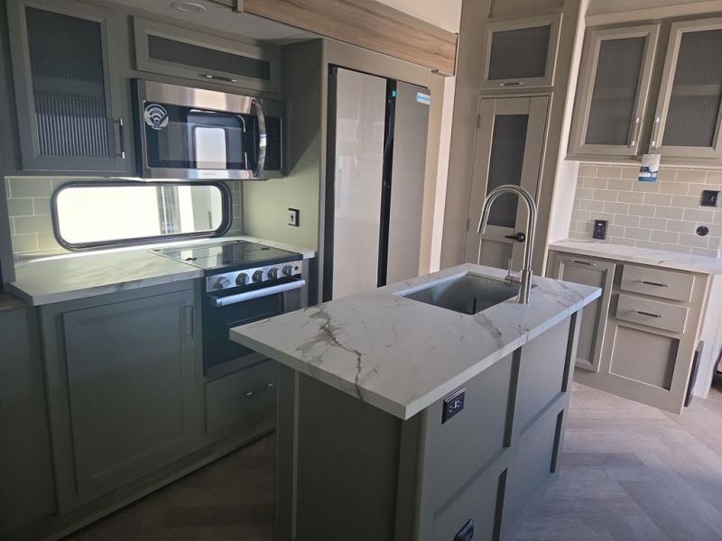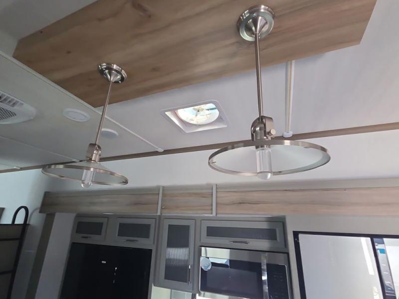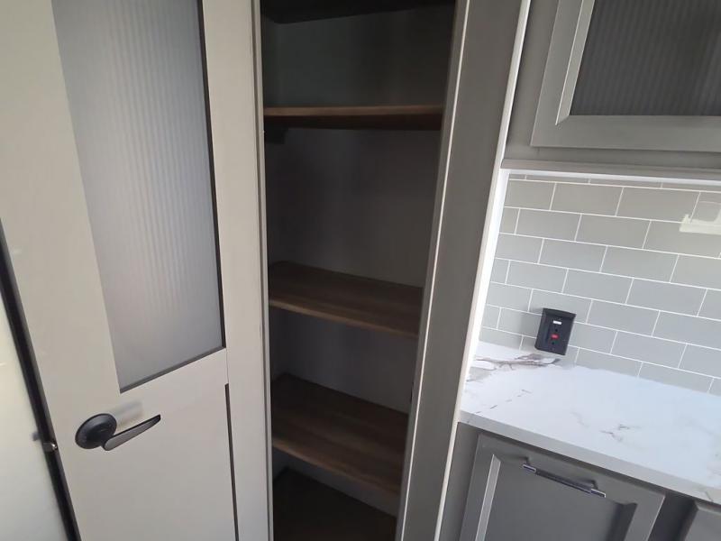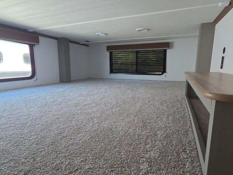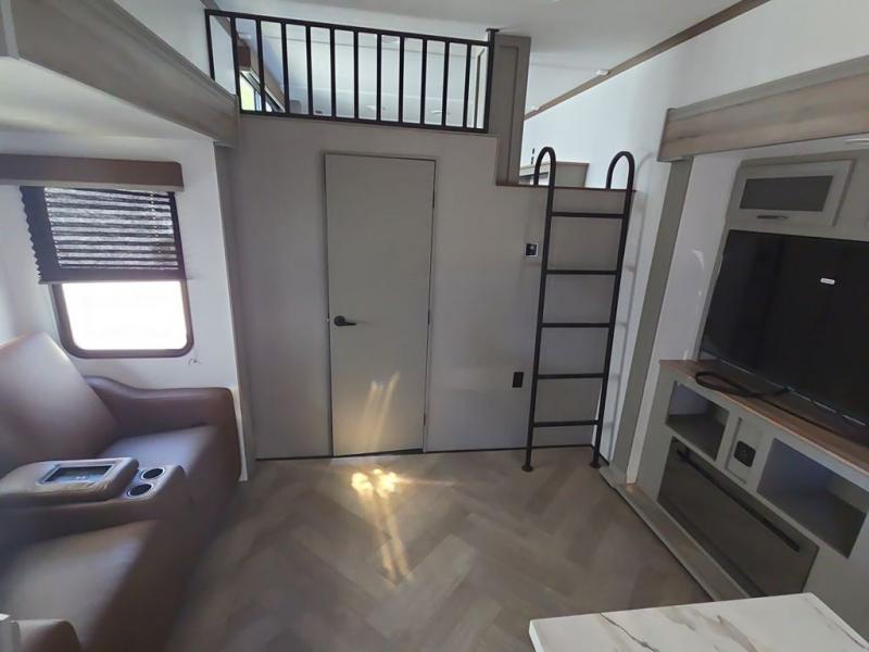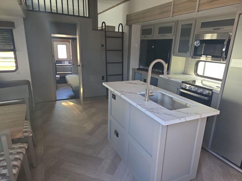 Two bedrooms and two full baths make this fifth wheel perfect for camping with friends and family! The front bedroom includes a king bed slide out with storage underneath, a wardrobe with a shelf, plus a closet with washer and dryer prep if you want to add these appliances. The master suite includes a second king bed slide out, dual wardrobes and a dresser, plus a full rear bath with one of the dual entry doors. There is also a loft area above this room with plenty of space, an entertainment/gaming center, and a ladder. Everyone can meet in the main living area to relax on the theater seating or dine at the booth dinette. And a full kitchen is complete with an island, pantry, 16 cu. ft. 12V refrigerator, and a hutch to name a few convenient features!