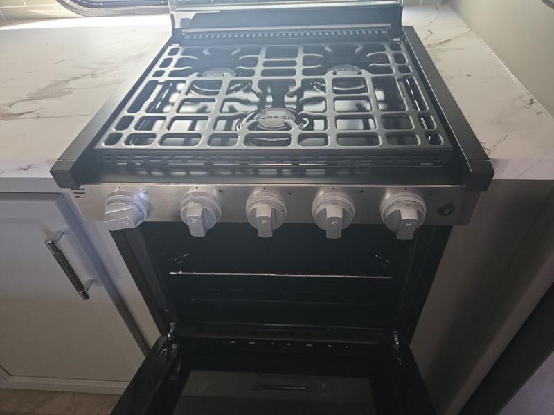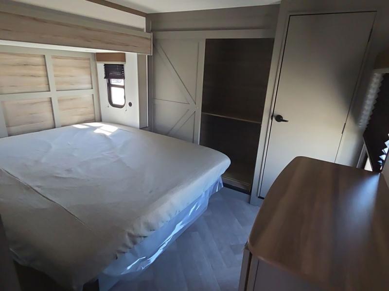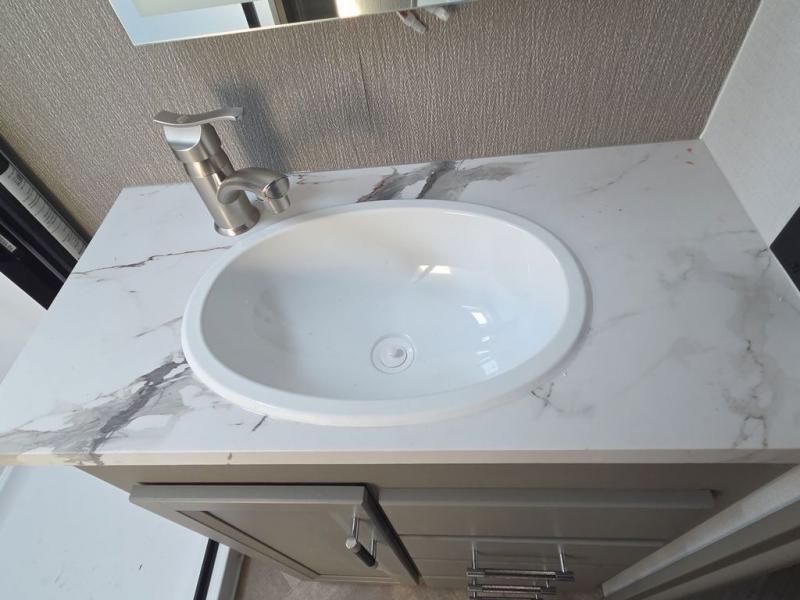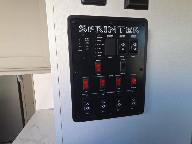 The Sprinter fifth wheels by Keystone feature spacious living areas, plenty of storage, and outstanding towability. Each unit is constructed with 2" aluminum framed and laminated sidewalls, a fully walkable roof, and dual layer insulation to help extend your camping season. The heated pass-through storage includes lockable slam latch baggage doors so you can easily pack your gear, and the one-touch 4-point leveling system features return hookup memory to have you set up in no-time. Head inside to find Congoleum vinyl flooring, Thomas Payne luxury collection furniture, residential style seamless marbled countertops, and an upgraded bedspread to name a few comforts. The Sprinter also includes a Girard tankless on-demand water heater, a central command center, plus a 30k BTU furnace and two A/C units to ensure your comfort!