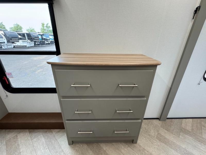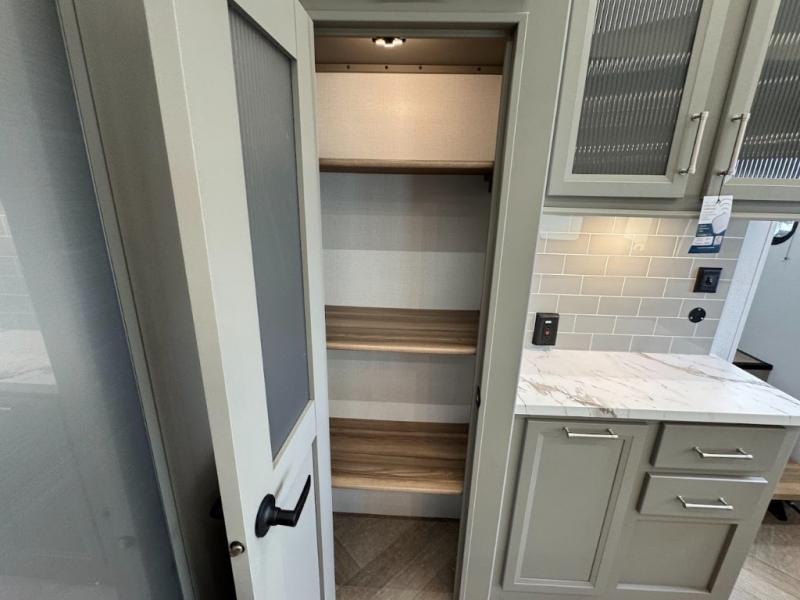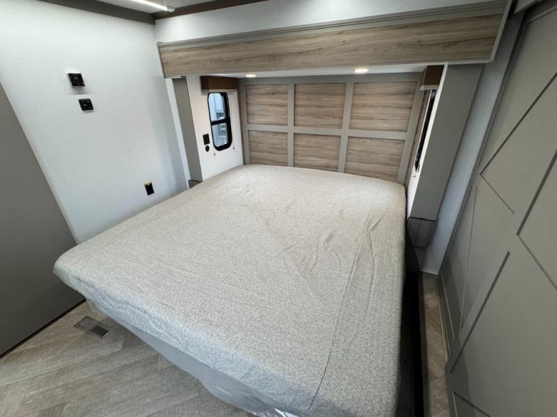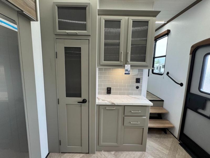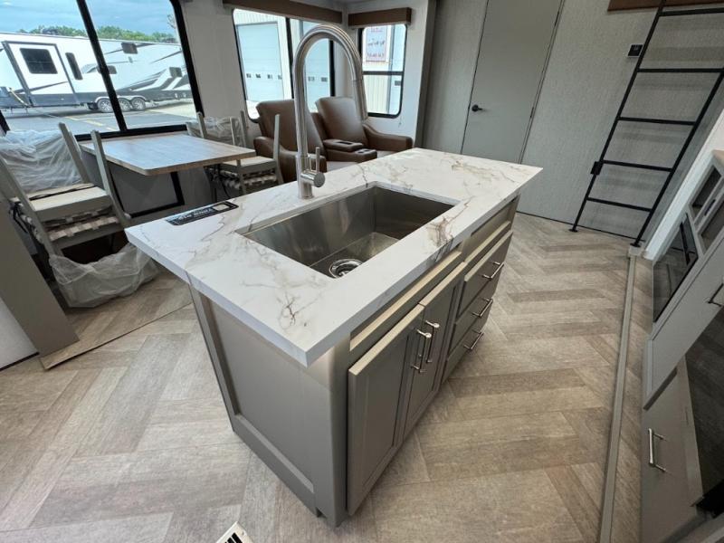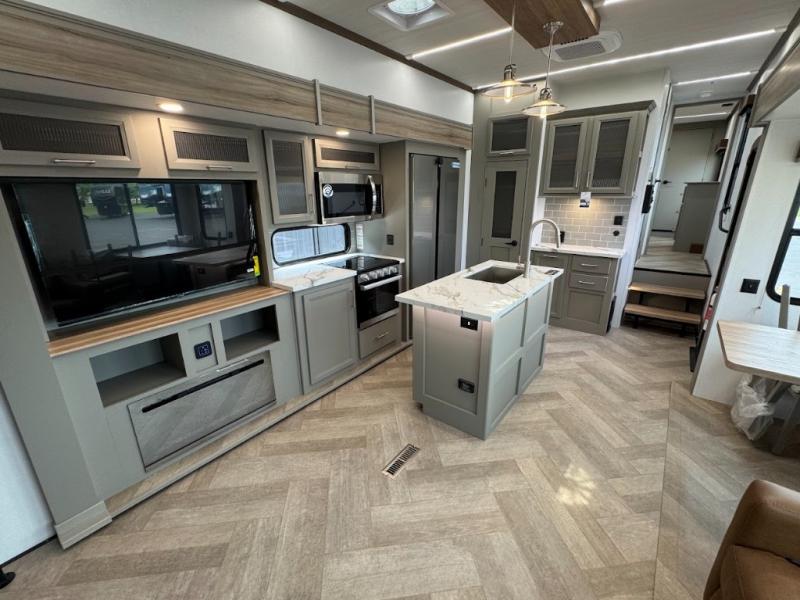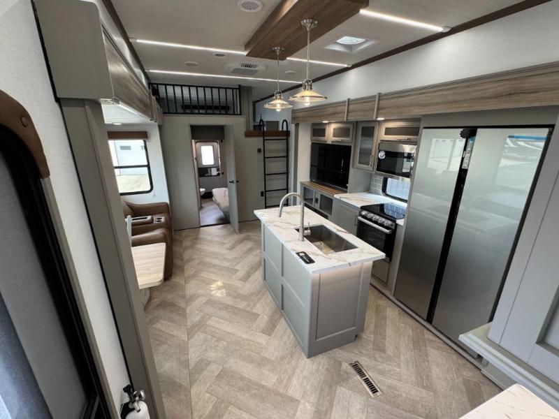 Two bedrooms and two full baths make this fifth wheel perfect for camping with friends and family! The front bedroom includes a king bed slide out with storage underneath, a wardrobe with a shelf, plus a closet with washer and dryer prep if you want to add these appliances. The master suite includes a second king bed slide out, dual wardrobes and a dresser, plus a full rear bath with one of the dual entry doors. There is also a loft area above this room with plenty of space, an entertainment/gaming center, and a ladder. Everyone can meet in the main living area to relax on the theater seating or dine at the booth dinette. And a full kitchen is complete with an island, pantry, 16 cu. ft. 12V refrigerator, and a hutch to name a few convenient features!