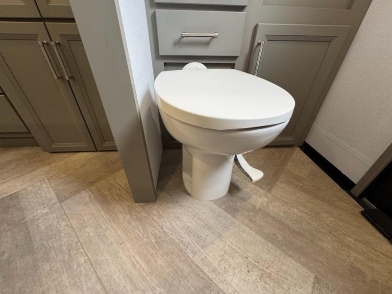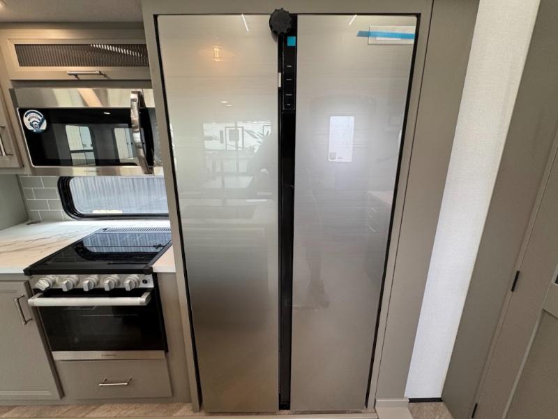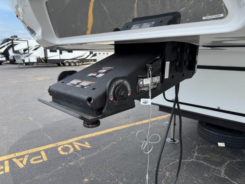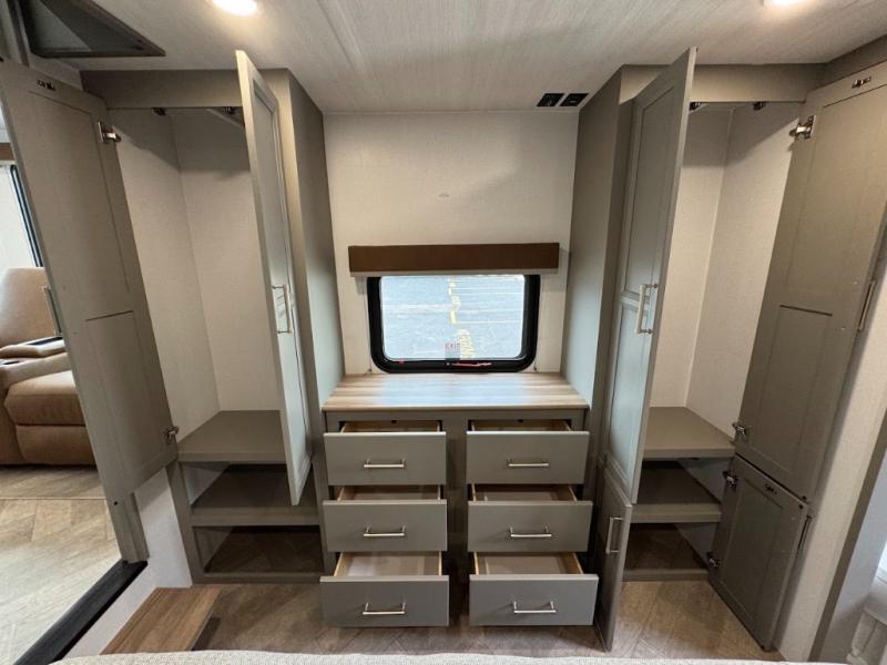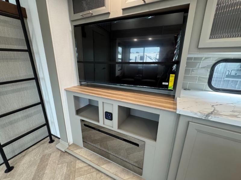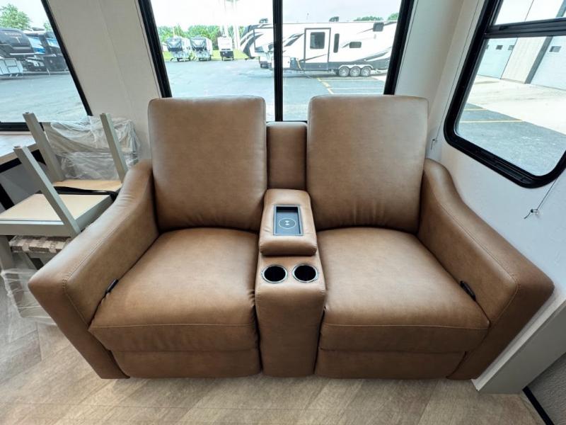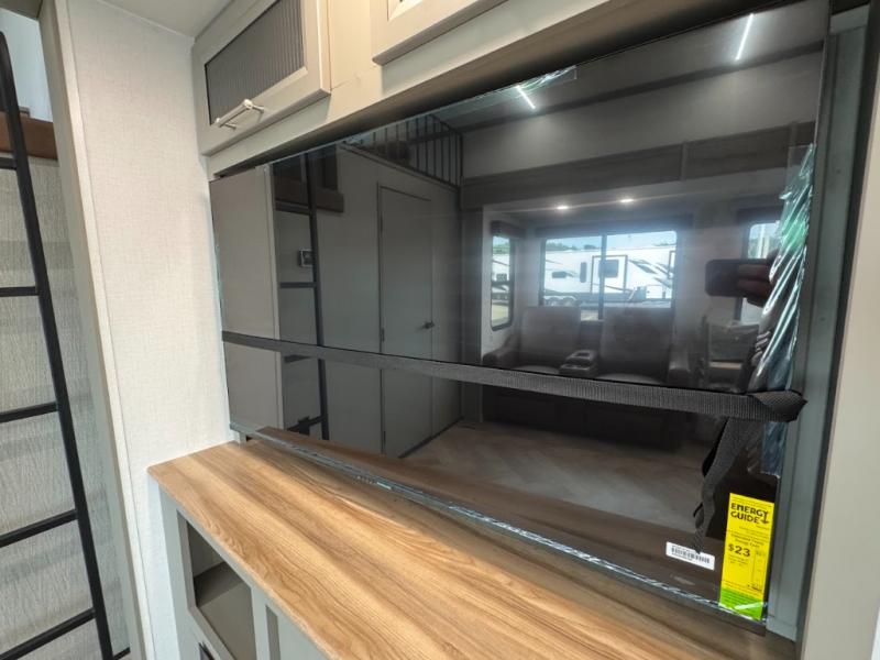 Two bedrooms and two full baths make this fifth wheel perfect for camping with friends and family! The front bedroom includes a king bed slide out with storage underneath, a wardrobe with a shelf, plus a closet with washer and dryer prep if you want to add these appliances. The master suite includes a second king bed slide out, dual wardrobes and a dresser, plus a full rear bath with one of the dual entry doors. There is also a loft area above this room with plenty of space, an entertainment/gaming center, and a ladder. Everyone can meet in the main living area to relax on the theater seating or dine at the booth dinette. And a full kitchen is complete with an island, pantry, 16 cu. ft. 12V refrigerator, and a hutch to name a few convenient features!