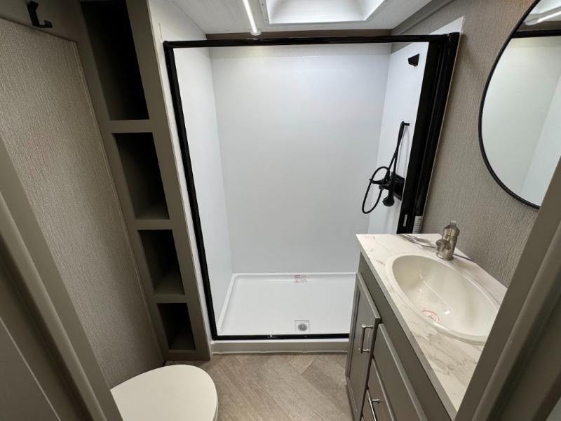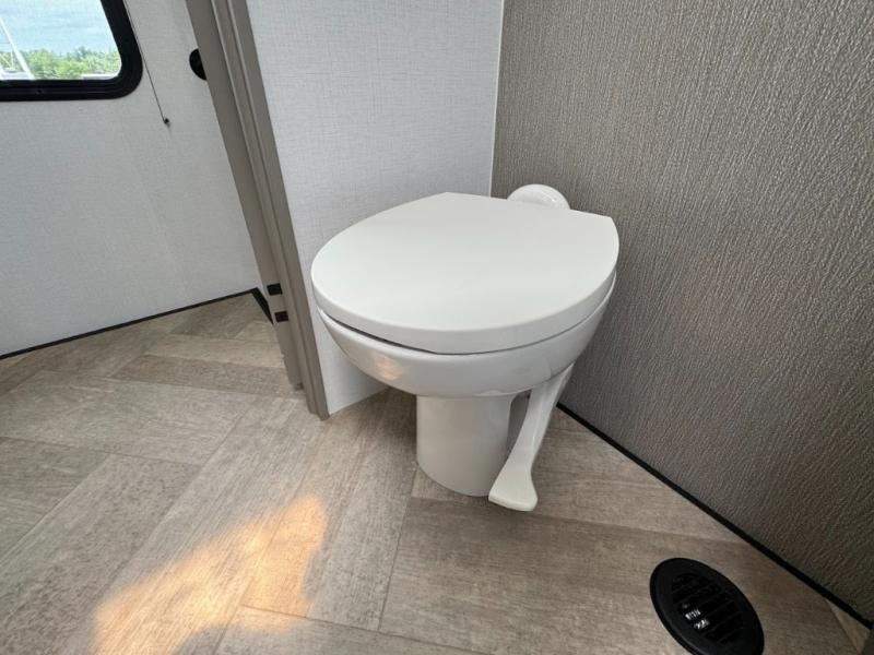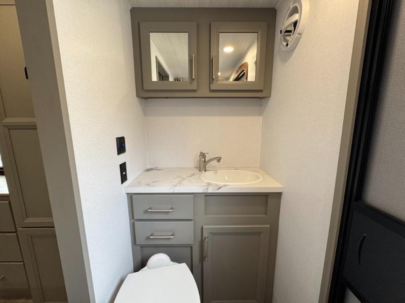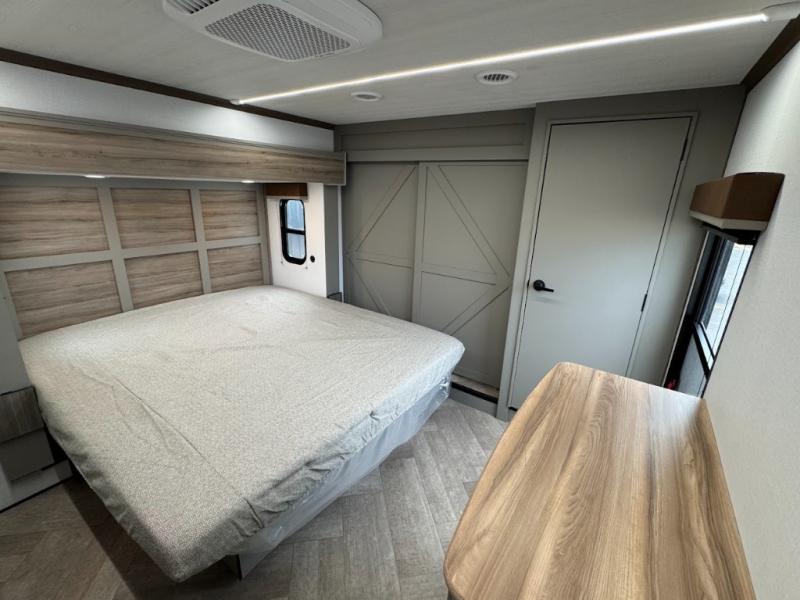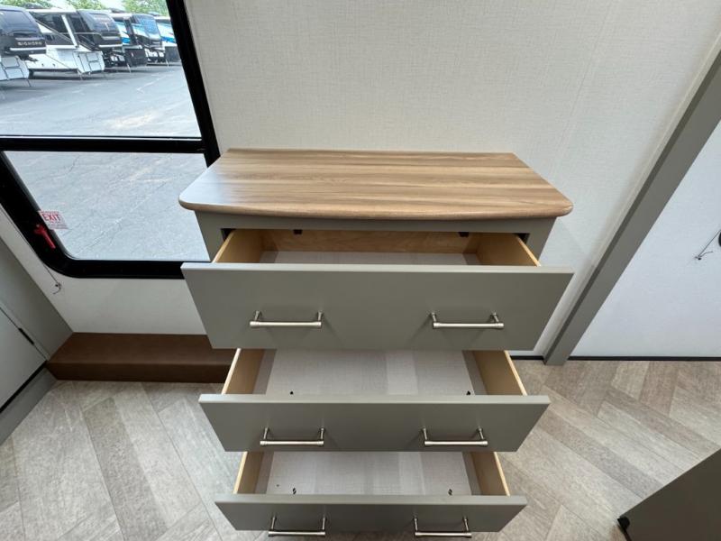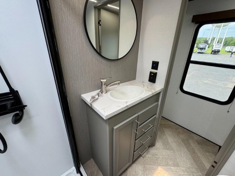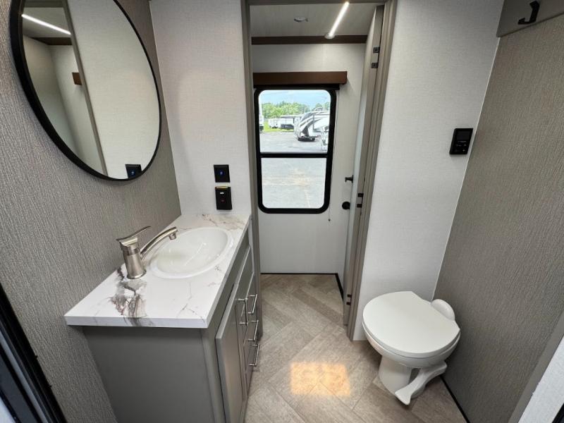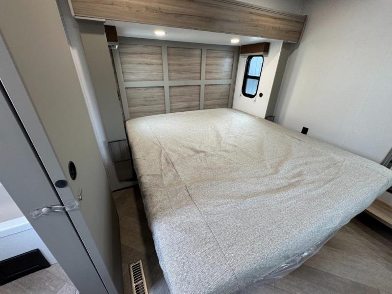 The Sprinter fifth wheels by Keystone feature spacious living areas, plenty of storage, and outstanding towability. Each unit is constructed with 2" aluminum framed and laminated sidewalls, a fully walkable roof, and dual layer insulation to help extend your camping season. The heated pass-through storage includes lockable slam latch baggage doors so you can easily pack your gear, and the one-touch 4-point leveling system features return hookup memory to have you set up in no-time. Head inside to find Congoleum vinyl flooring, Thomas Payne luxury collection furniture, residential style seamless marbled countertops, and an upgraded bedspread to name a few comforts. The Sprinter also includes a Girard tankless on-demand water heater, a central command center, plus a 30k BTU furnace and two A/C units to ensure your comfort!