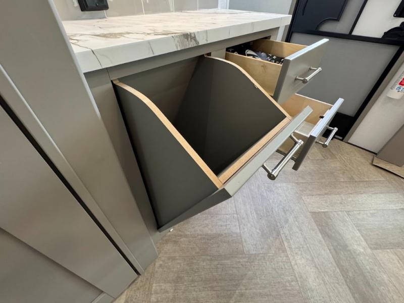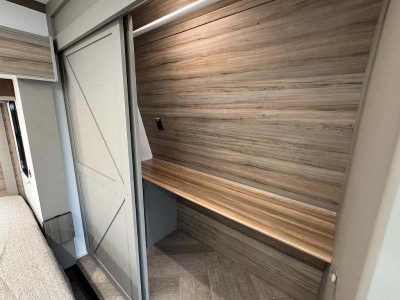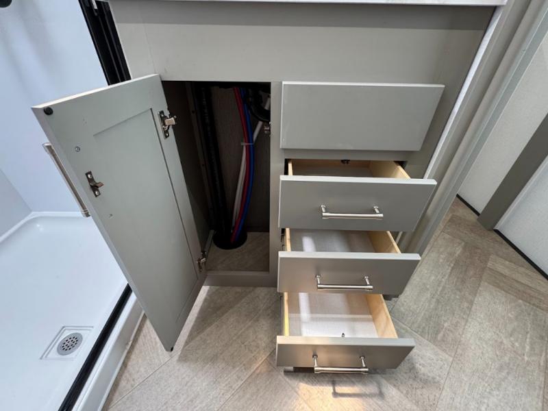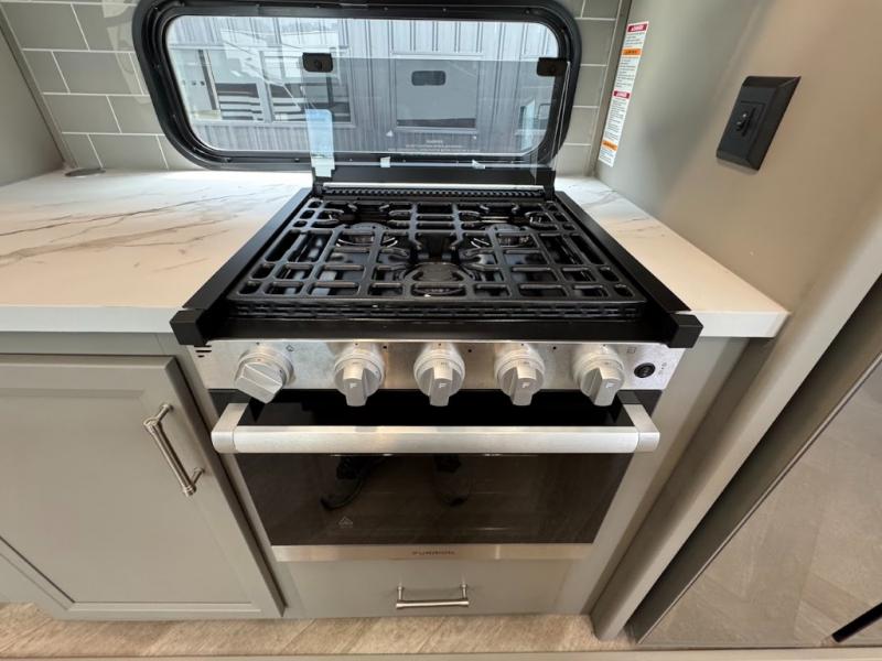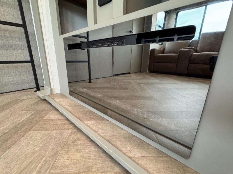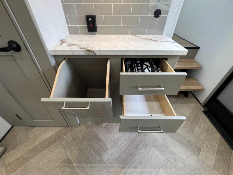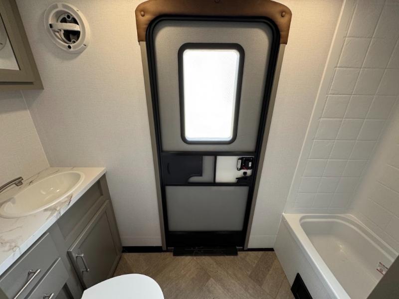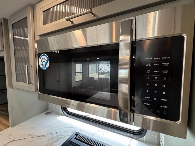 The Sprinter fifth wheels by Keystone feature spacious living areas, plenty of storage, and outstanding towability. Each unit is constructed with 2" aluminum framed and laminated sidewalls, a fully walkable roof, and dual layer insulation to help extend your camping season. The heated pass-through storage includes lockable slam latch baggage doors so you can easily pack your gear, and the one-touch 4-point leveling system features return hookup memory to have you set up in no-time. Head inside to find Congoleum vinyl flooring, Thomas Payne luxury collection furniture, residential style seamless marbled countertops, and an upgraded bedspread to name a few comforts. The Sprinter also includes a Girard tankless on-demand water heater, a central command center, plus a 30k BTU furnace and two A/C units to ensure your comfort!