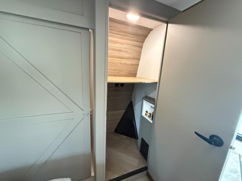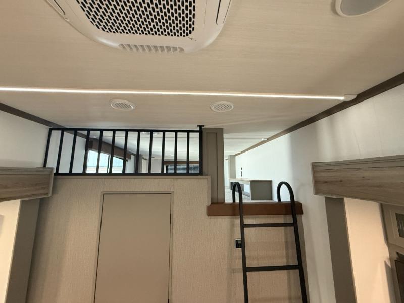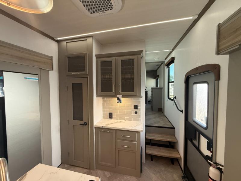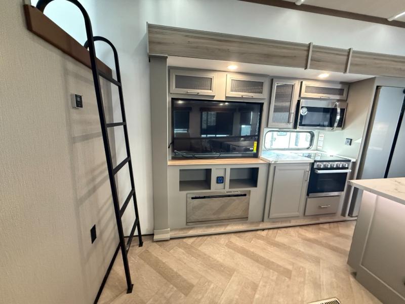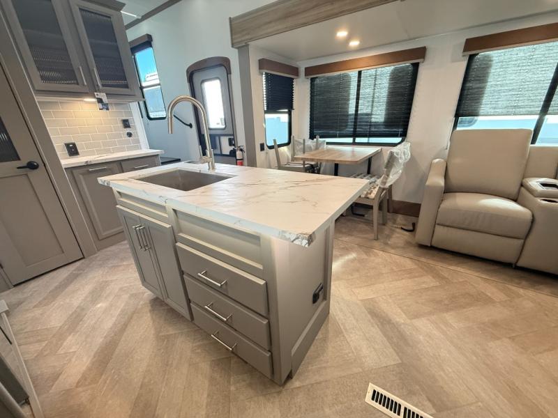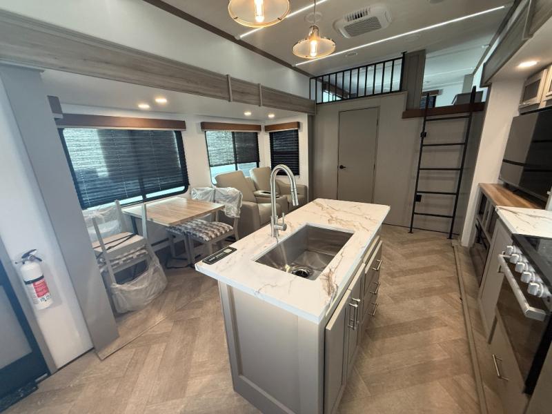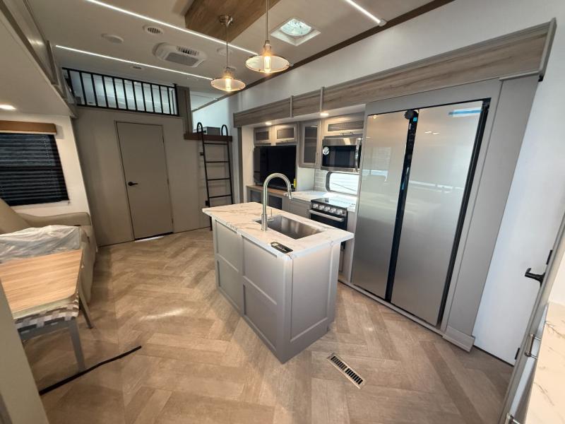 Two bedrooms and two full baths make this fifth wheel perfect for camping with friends and family! The front bedroom includes a king bed slide out with storage underneath, a wardrobe with a shelf, plus a closet with washer and dryer prep if you want to add these appliances. The master suite includes a second king bed slide out, dual wardrobes and a dresser, plus a full rear bath with one of the dual entry doors. There is also a loft area above this room with plenty of space, an entertainment/gaming center, and a ladder. Everyone can meet in the main living area to relax on the theater seating or dine at the booth dinette. And a full kitchen is complete with an island, pantry, 16 cu. ft. 12V refrigerator, and a hutch to name a few convenient features!