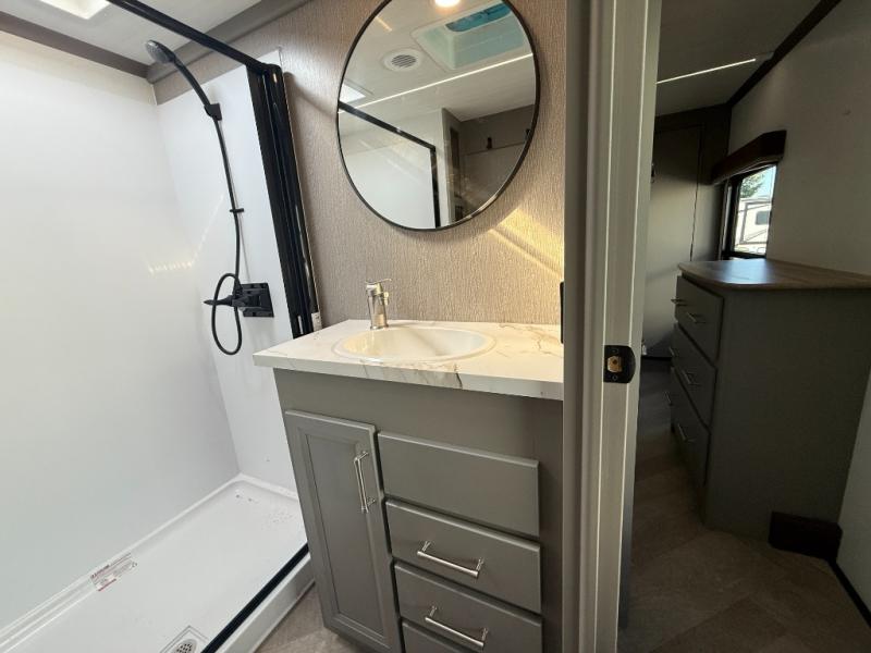The Sprinter fifth wheels by Keystone feature spacious living areas, plenty of storage, and outstanding towability. Each unit is constructed with 2" aluminum framed and laminated sidewalls, a fully walkable roof, and dual layer insulation to help extend your camping season. The heated pass-through storage includes lockable slam latch baggage doors so you can easily pack your gear, and the one-touch 4-point leveling system features return hookup memory to have you set up in no-time. Head inside to find Congoleum vinyl flooring, Thomas Payne luxury collection furniture, residential style seamless marbled countertops, and an upgraded bedspread to name a few comforts. The Sprinter also includes a Girard tankless on-demand water heater, a central command center, plus a 30k BTU furnace and two A/C units to ensure your comfort!