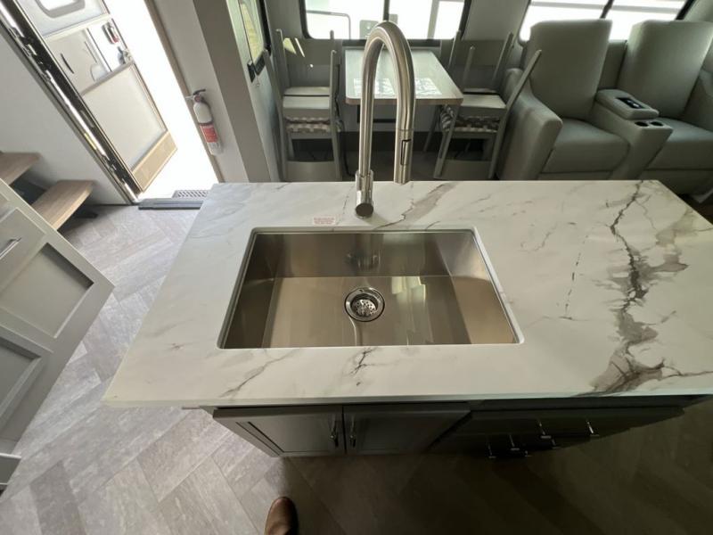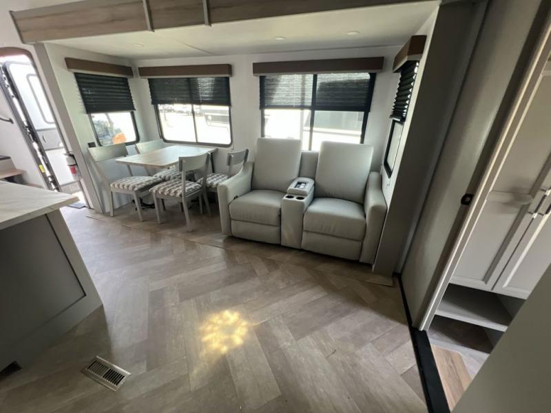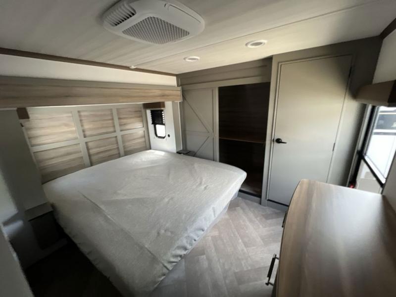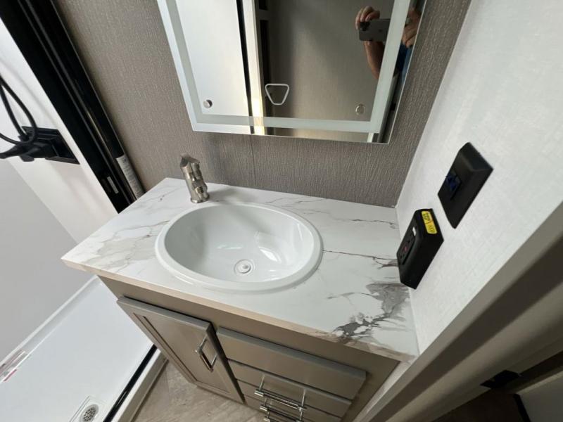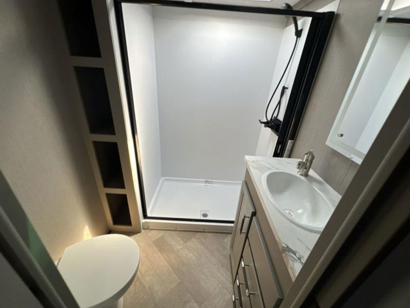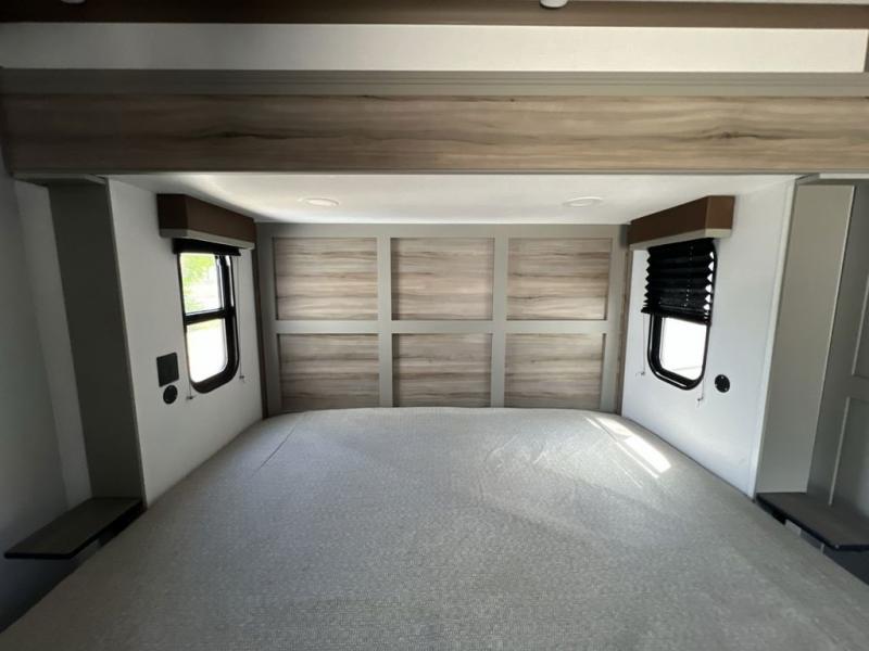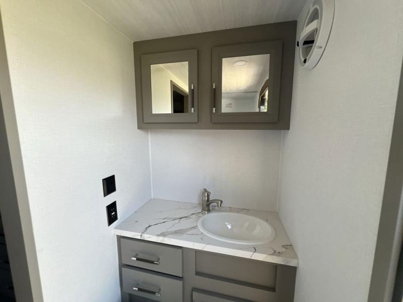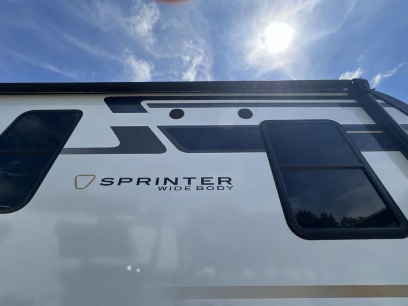 The Sprinter fifth wheels by Keystone feature spacious living areas, plenty of storage, and outstanding towability. Each unit is constructed with 2" aluminum framed and laminated sidewalls, a fully walkable roof, and dual layer insulation to help extend your camping season. The heated pass-through storage includes lockable slam latch baggage doors so you can easily pack your gear, and the one-touch 4-point leveling system features return hookup memory to have you set up in no-time. Head inside to find Congoleum vinyl flooring, Thomas Payne luxury collection furniture, residential style seamless marbled countertops, and an upgraded bedspread to name a few comforts. The Sprinter also includes a Girard tankless on-demand water heater, a central command center, plus a 30k BTU furnace and two A/C units to ensure your comfort!