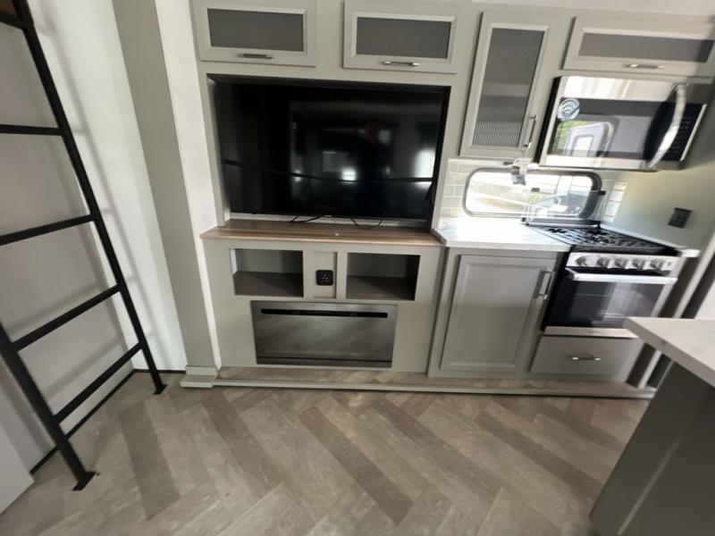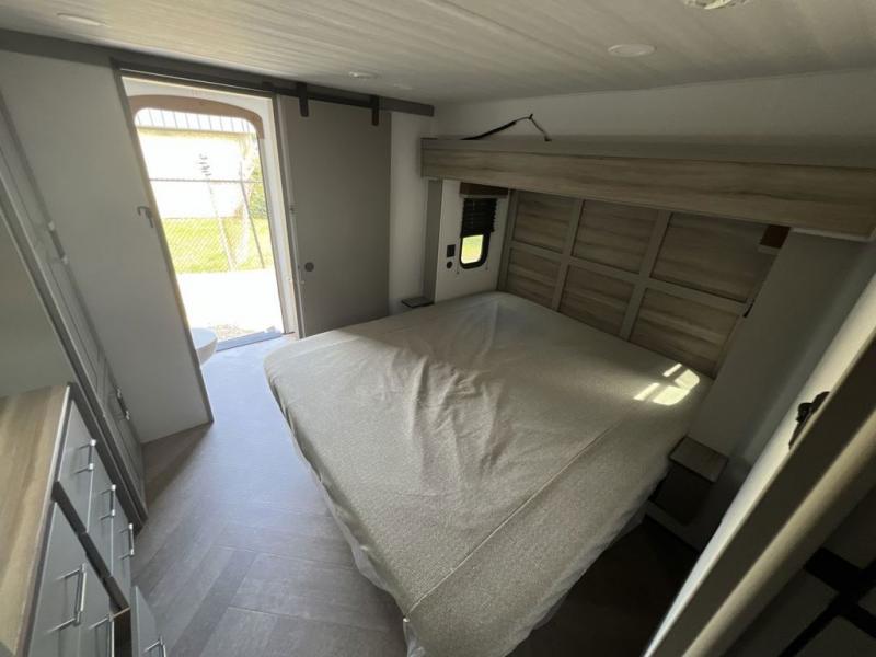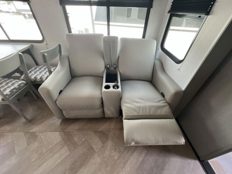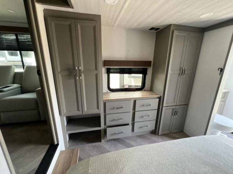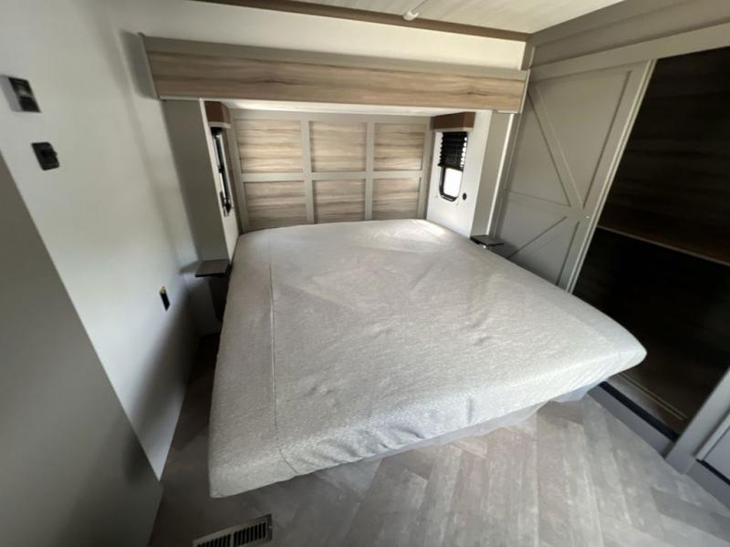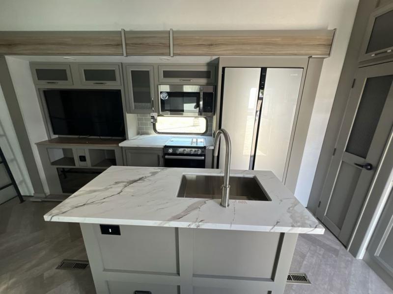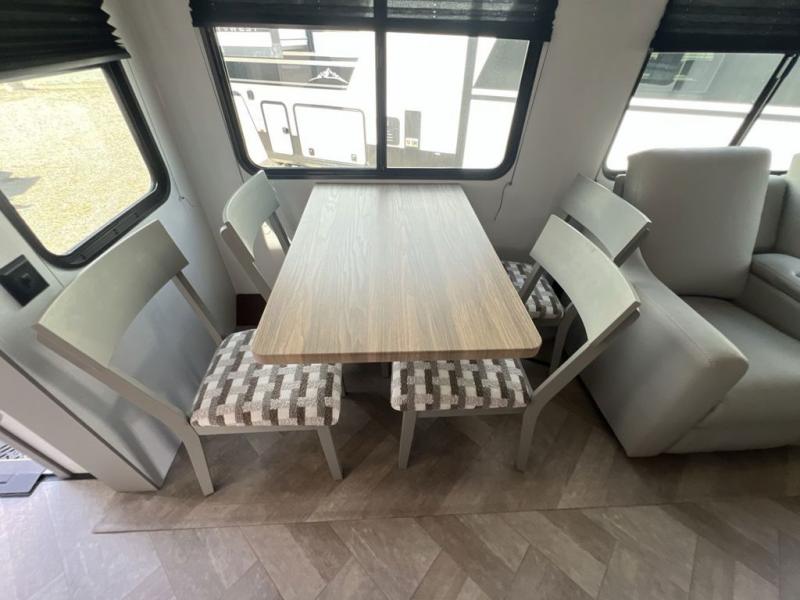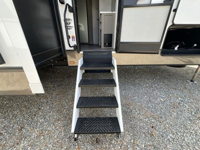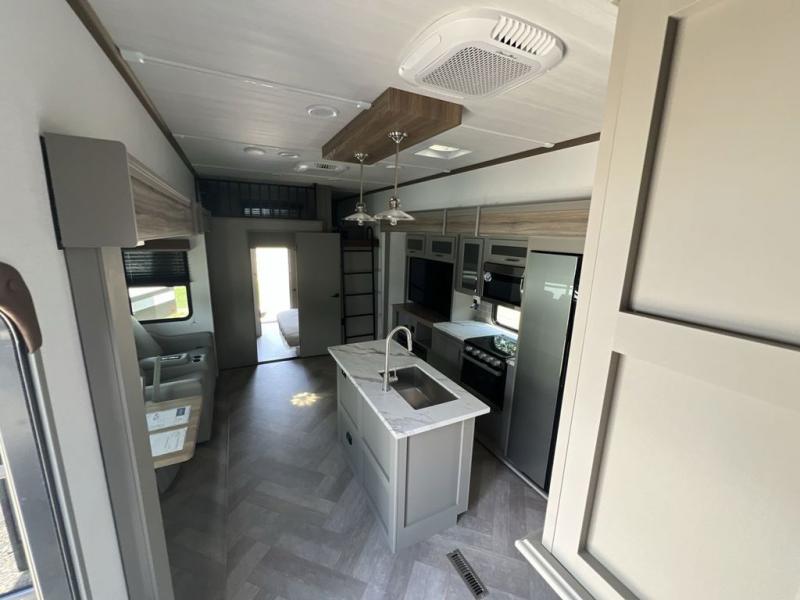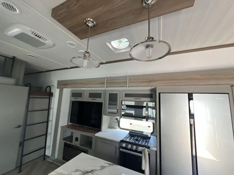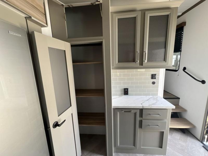 Two bedrooms and two full baths make this fifth wheel perfect for camping with friends and family! The front bedroom includes a king bed slide out with storage underneath, a wardrobe with a shelf, plus a closet with washer and dryer prep if you want to add these appliances. The master suite includes a second king bed slide out, dual wardrobes and a dresser, plus a full rear bath with one of the dual entry doors. There is also a loft area above this room with plenty of space, an entertainment/gaming center, and a ladder. Everyone can meet in the main living area to relax on the theater seating or dine at the booth dinette. And a full kitchen is complete with an island, pantry, 16 cu. ft. 12V refrigerator, and a hutch to name a few convenient features!