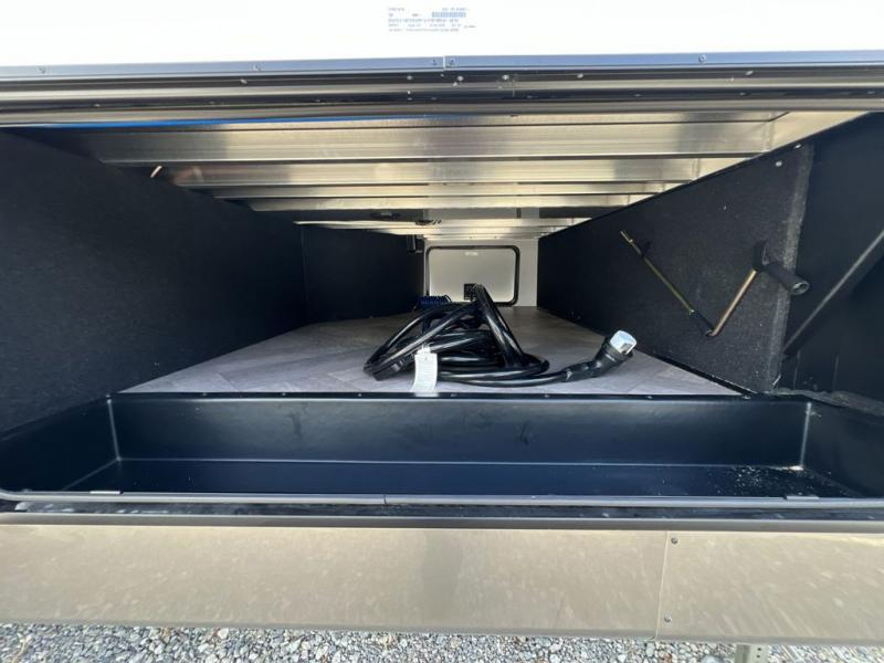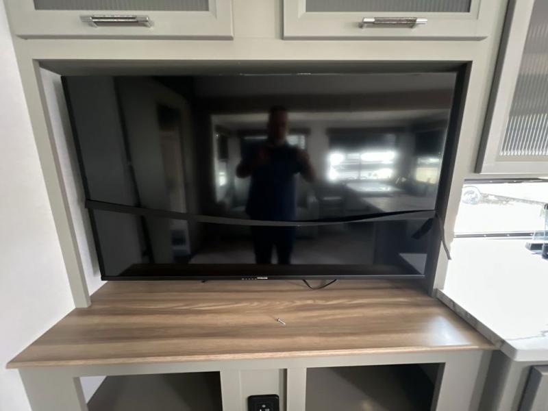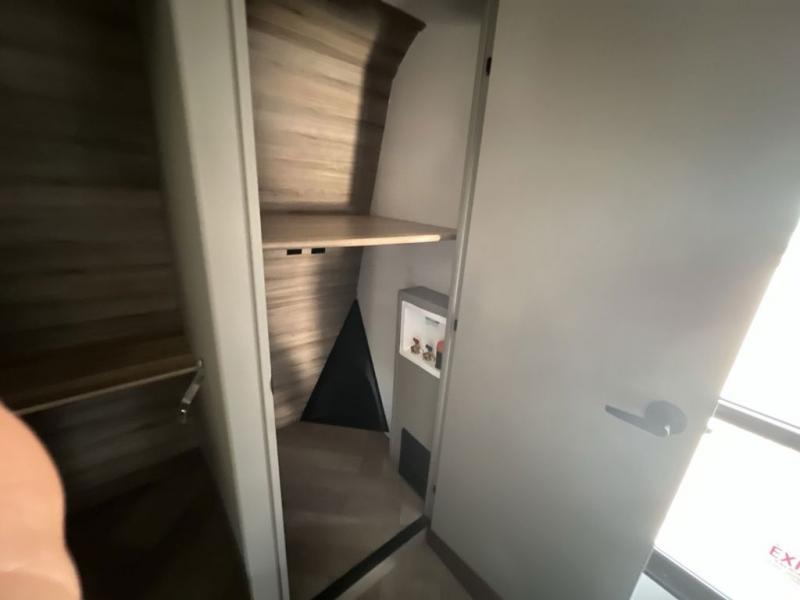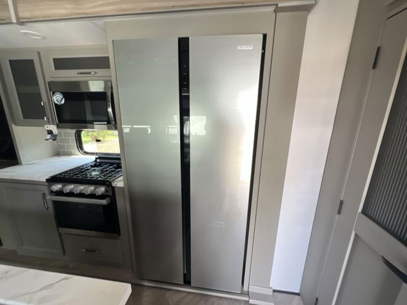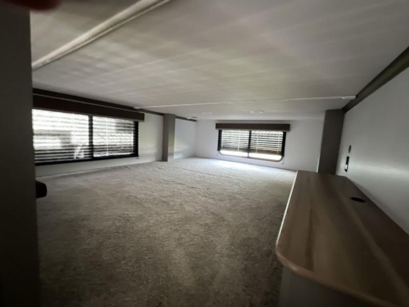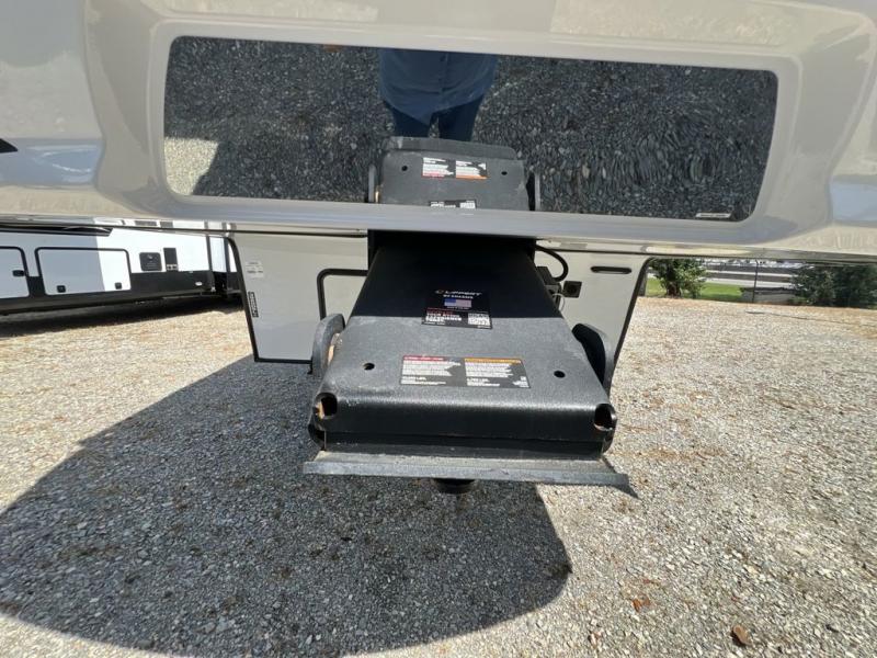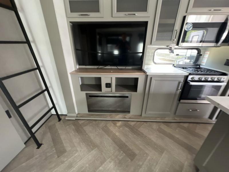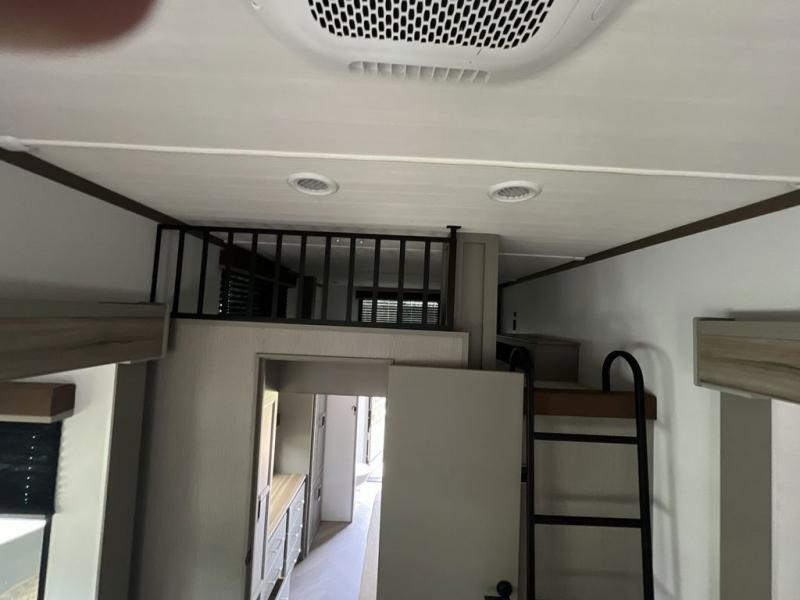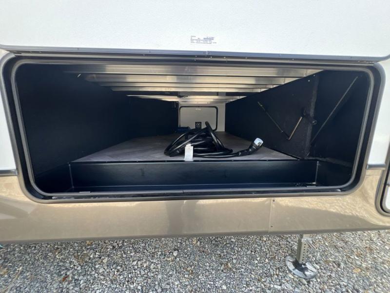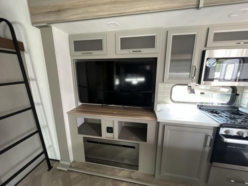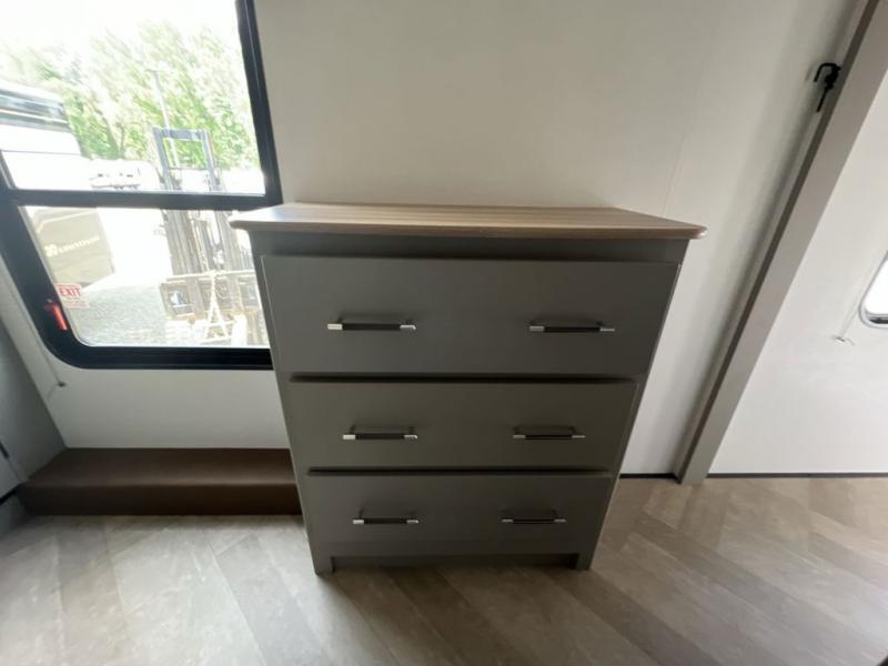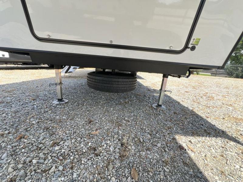 Two bedrooms and two full baths make this fifth wheel perfect for camping with friends and family! The front bedroom includes a king bed slide out with storage underneath, a wardrobe with a shelf, plus a closet with washer and dryer prep if you want to add these appliances. The master suite includes a second king bed slide out, dual wardrobes and a dresser, plus a full rear bath with one of the dual entry doors. There is also a loft area above this room with plenty of space, an entertainment/gaming center, and a ladder. Everyone can meet in the main living area to relax on the theater seating or dine at the booth dinette. And a full kitchen is complete with an island, pantry, 16 cu. ft. 12V refrigerator, and a hutch to name a few convenient features!