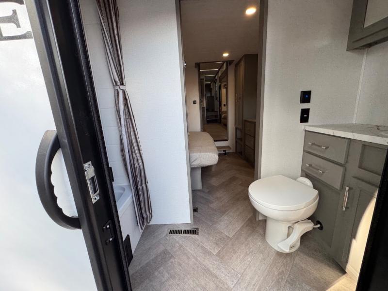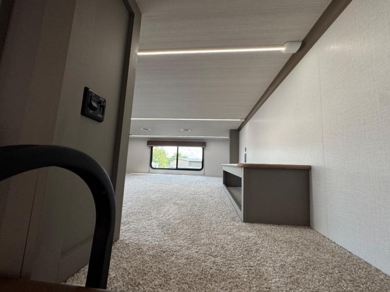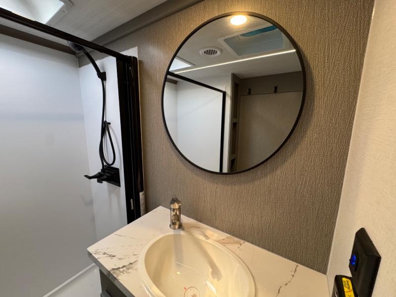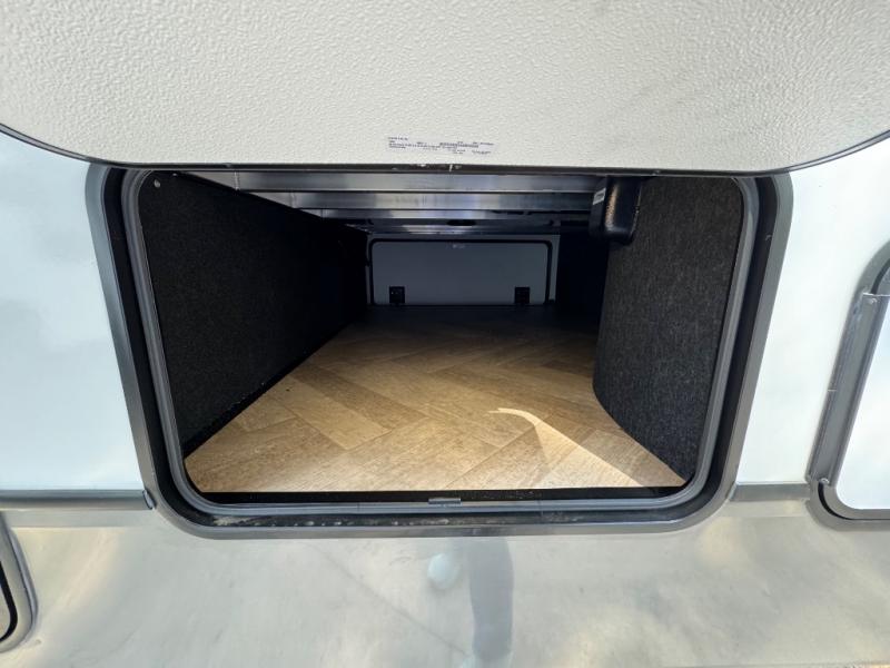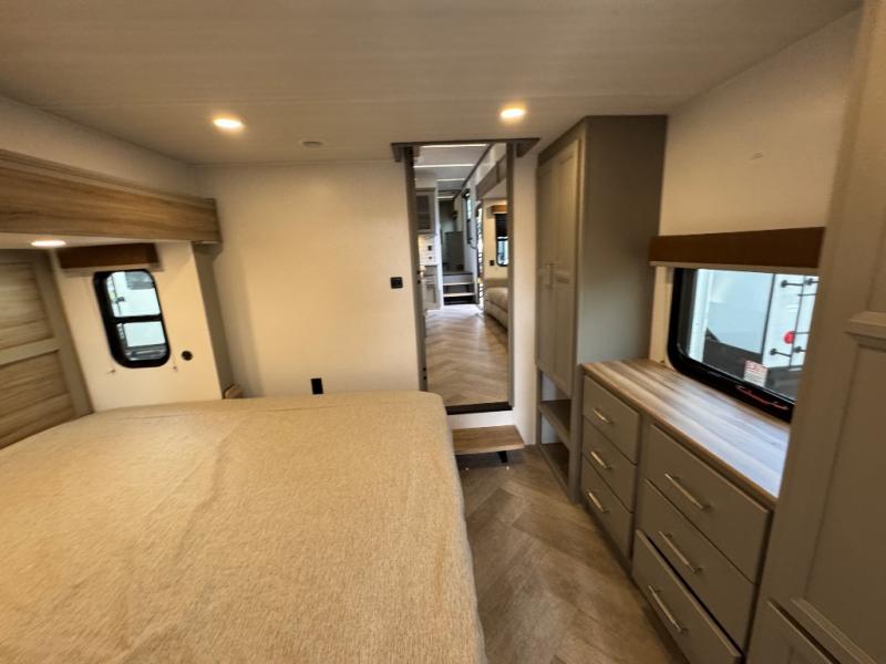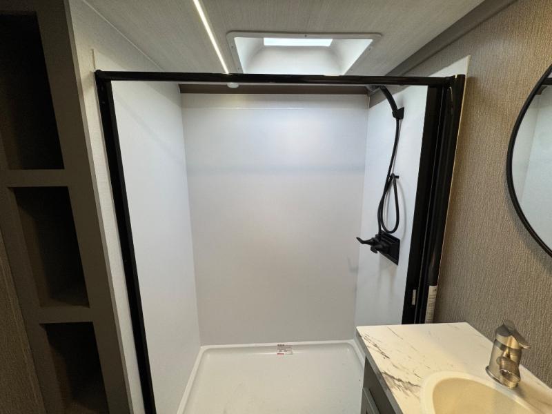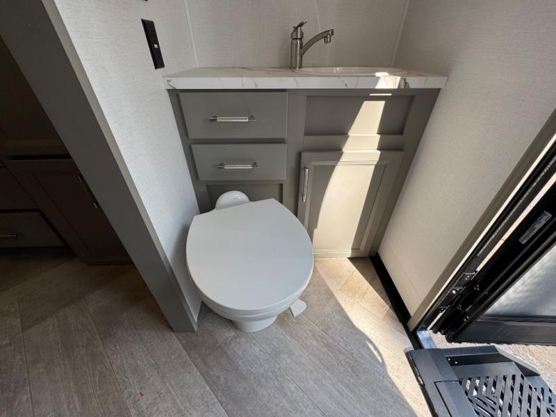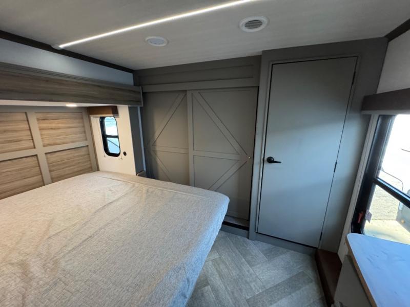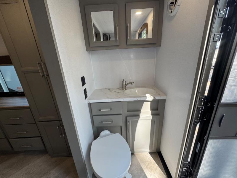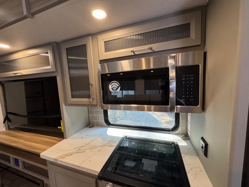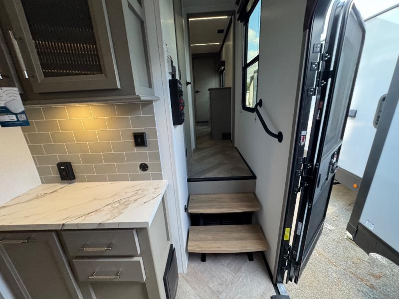 The Sprinter fifth wheels by Keystone feature spacious living areas, plenty of storage, and outstanding towability. Each unit is constructed with 2" aluminum framed and laminated sidewalls, a fully walkable roof, and dual layer insulation to help extend your camping season. The heated pass-through storage includes lockable slam latch baggage doors so you can easily pack your gear, and the one-touch 4-point leveling system features return hookup memory to have you set up in no-time. Head inside to find Congoleum vinyl flooring, Thomas Payne luxury collection furniture, residential style seamless marbled countertops, and an upgraded bedspread to name a few comforts. The Sprinter also includes a Girard tankless on-demand water heater, a central command center, plus a 30k BTU furnace and two A/C units to ensure your comfort!