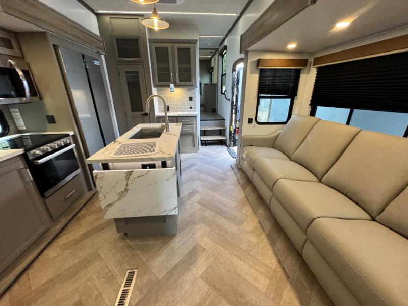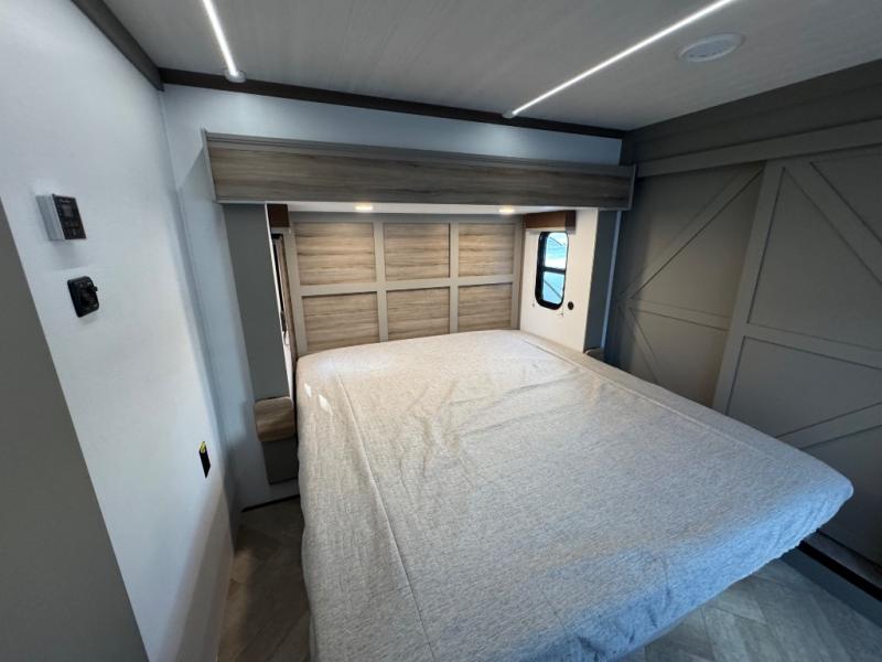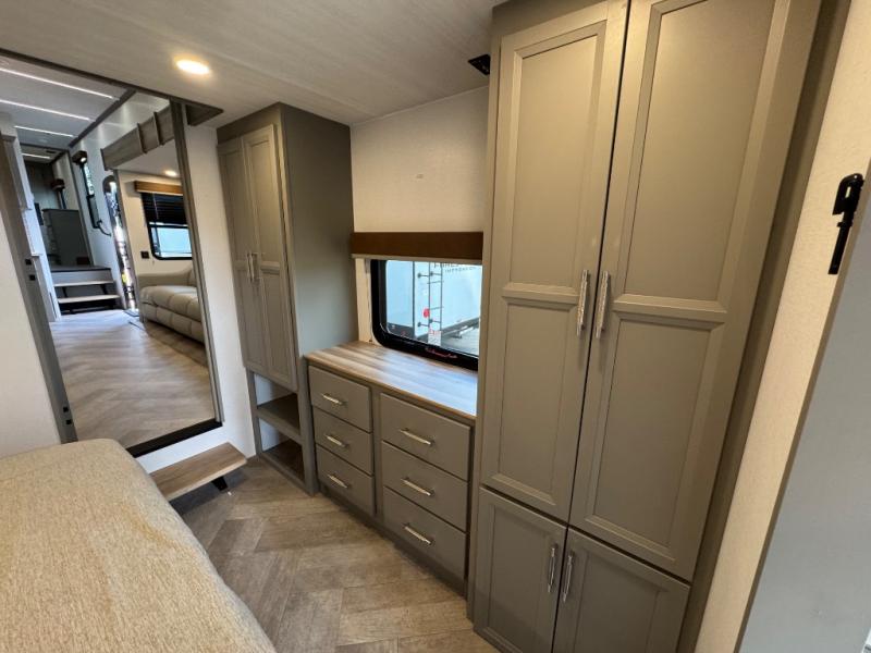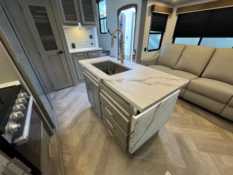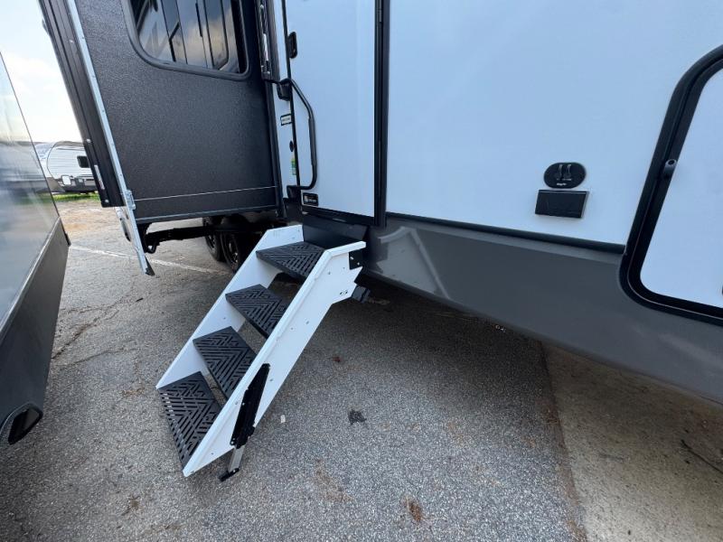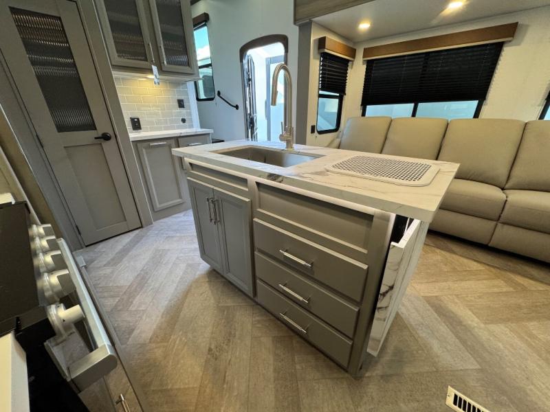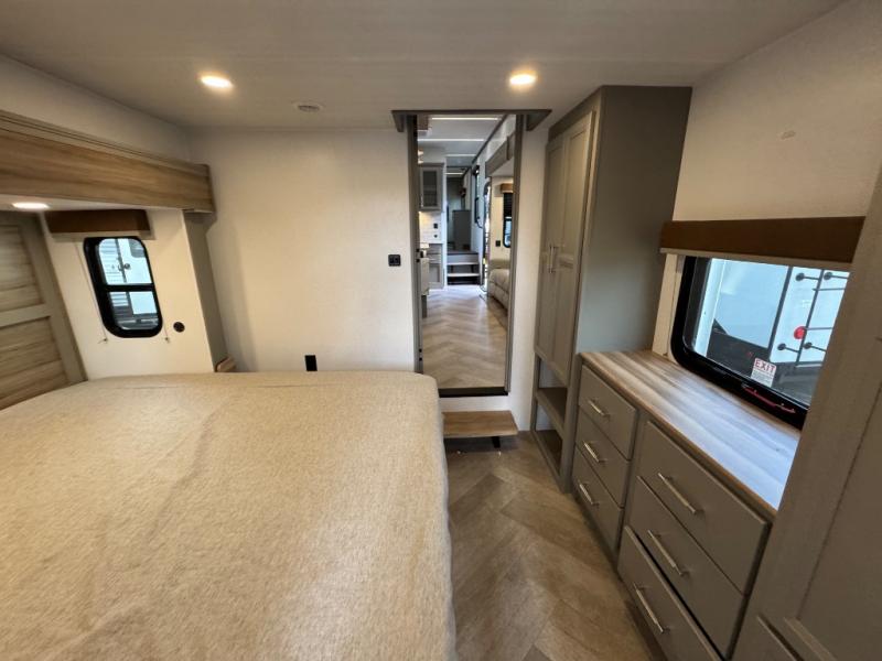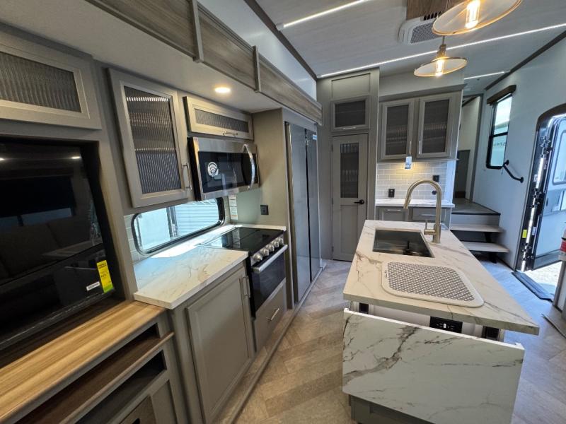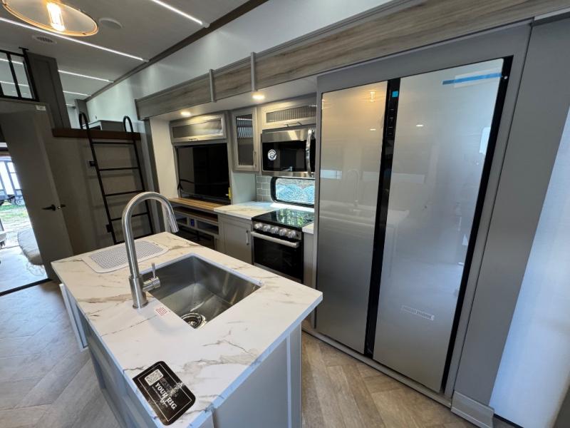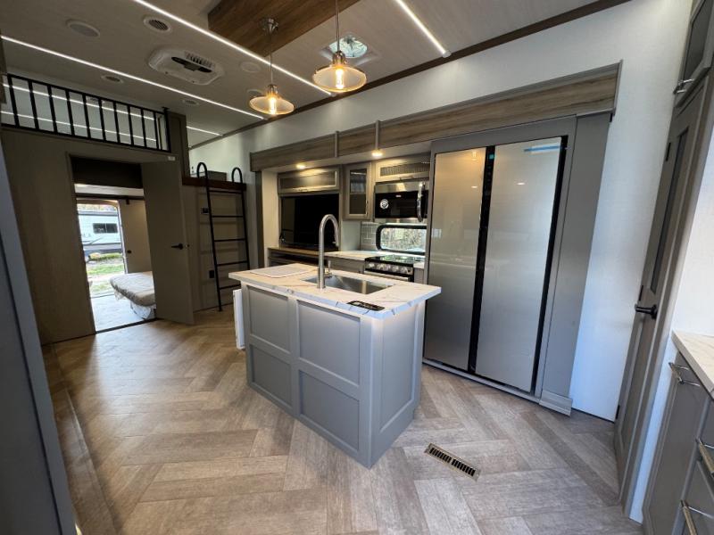 Two bedrooms and two full baths make this fifth wheel perfect for camping with friends and family! The front bedroom includes a king bed slide out with storage underneath, a wardrobe with a shelf, plus a closet with washer and dryer prep if you want to add these appliances. The master suite includes a second king bed slide out, dual wardrobes and a dresser, plus a full rear bath with one of the dual entry doors. There is also a loft area above this room with plenty of space, an entertainment/gaming center, and a ladder. Everyone can meet in the main living area to relax on the theater seating or dine at the booth dinette. And a full kitchen is complete with an island, pantry, 16 cu. ft. 12V refrigerator, and a hutch to name a few convenient features!