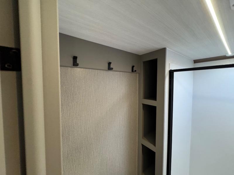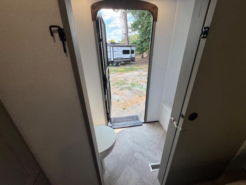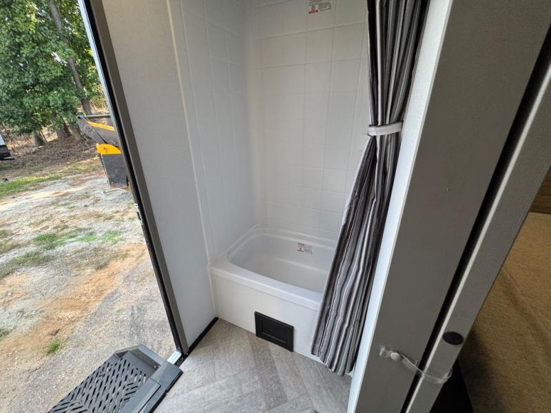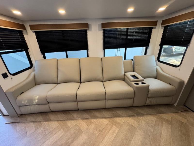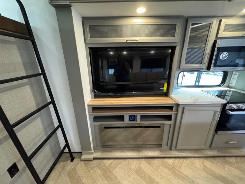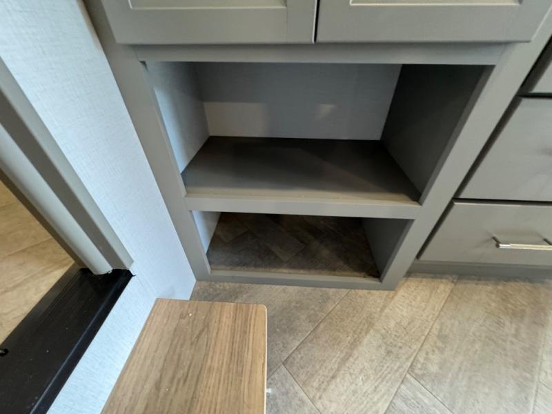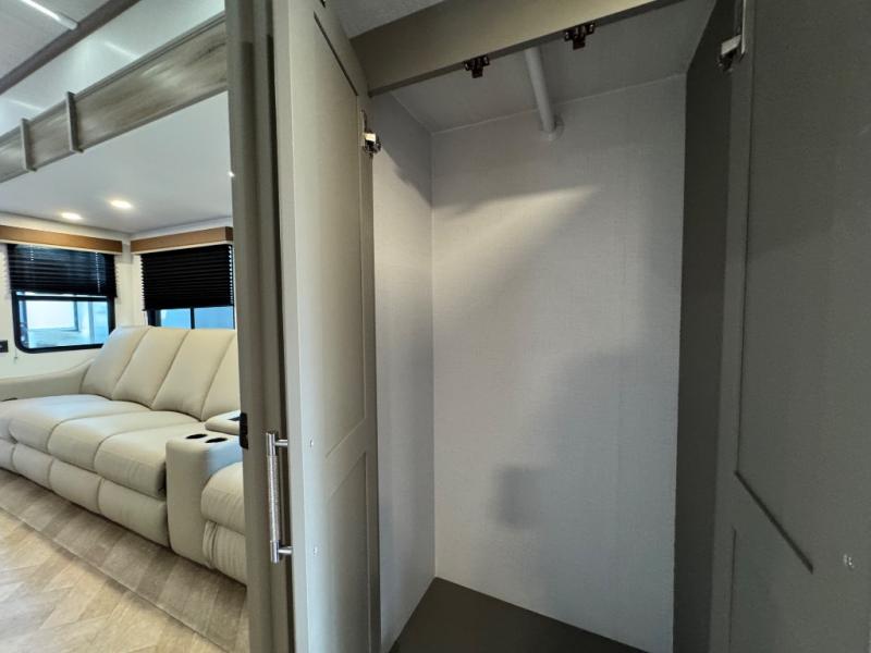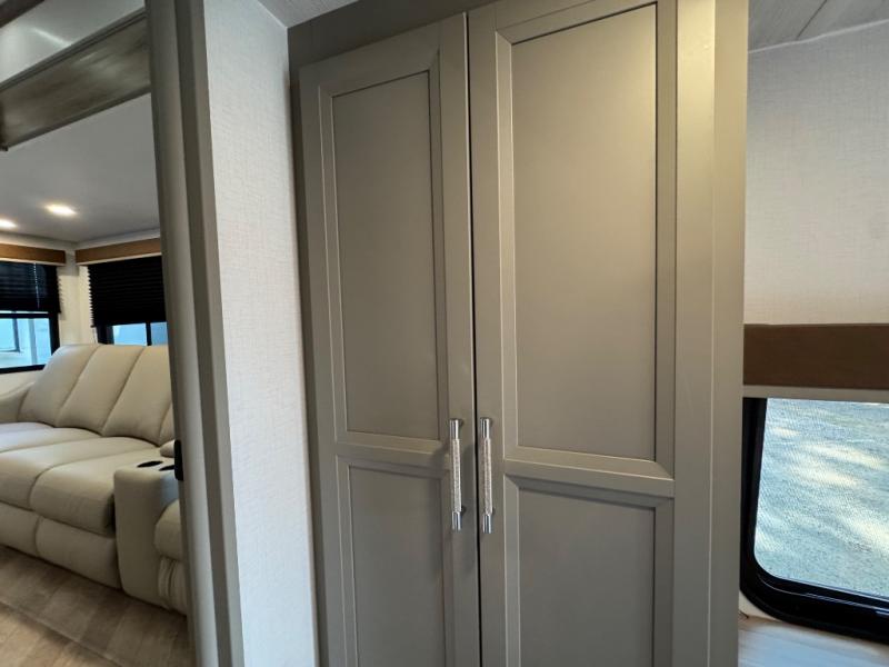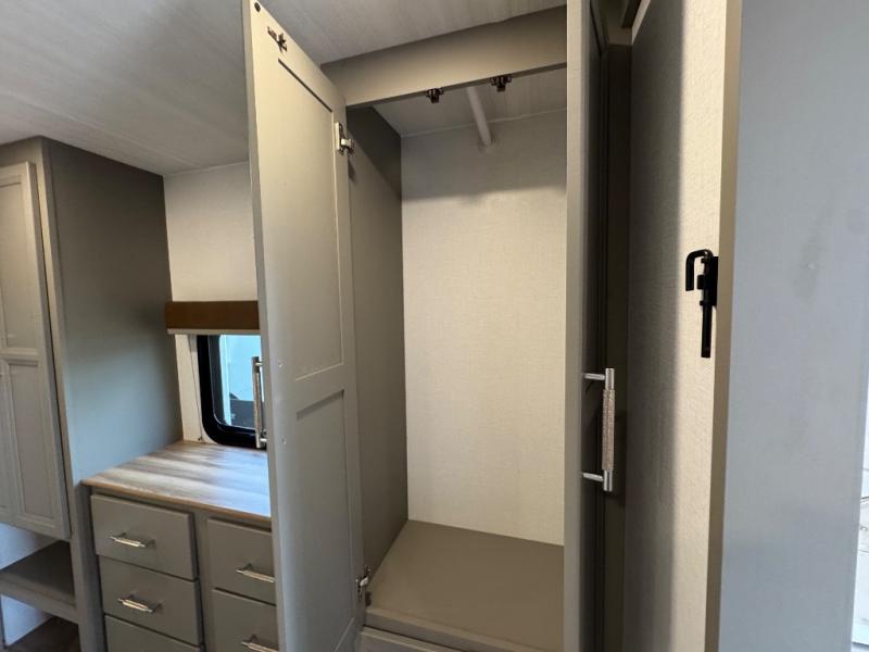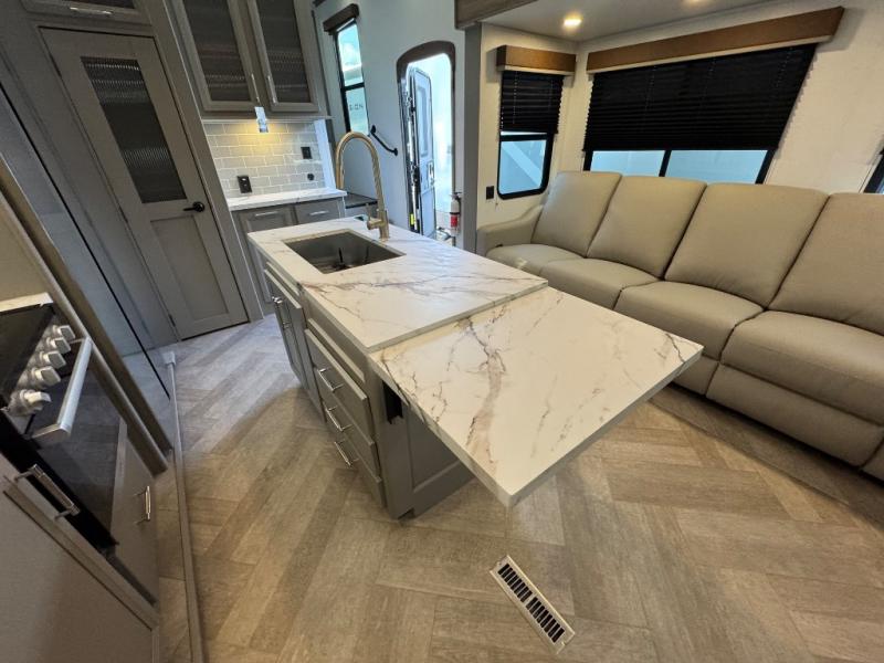 Two bedrooms and two full baths make this fifth wheel perfect for camping with friends and family! The front bedroom includes a king bed slide out with storage underneath, a wardrobe with a shelf, plus a closet with washer and dryer prep if you want to add these appliances. The master suite includes a second king bed slide out, dual wardrobes and a dresser, plus a full rear bath with one of the dual entry doors. There is also a loft area above this room with plenty of space, an entertainment/gaming center, and a ladder. Everyone can meet in the main living area to relax on the theater seating or dine at the booth dinette. And a full kitchen is complete with an island, pantry, 16 cu. ft. 12V refrigerator, and a hutch to name a few convenient features!