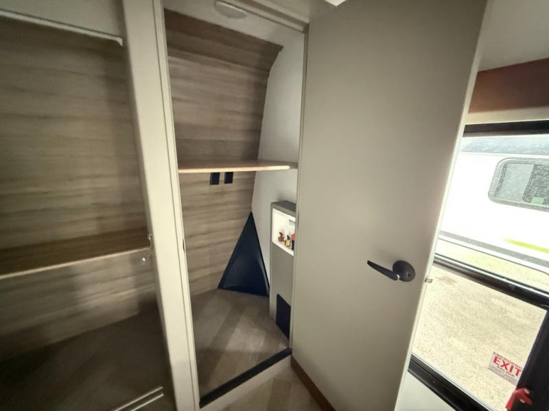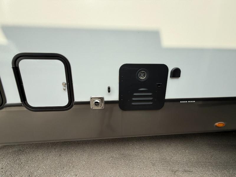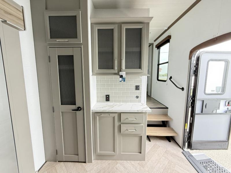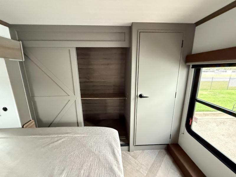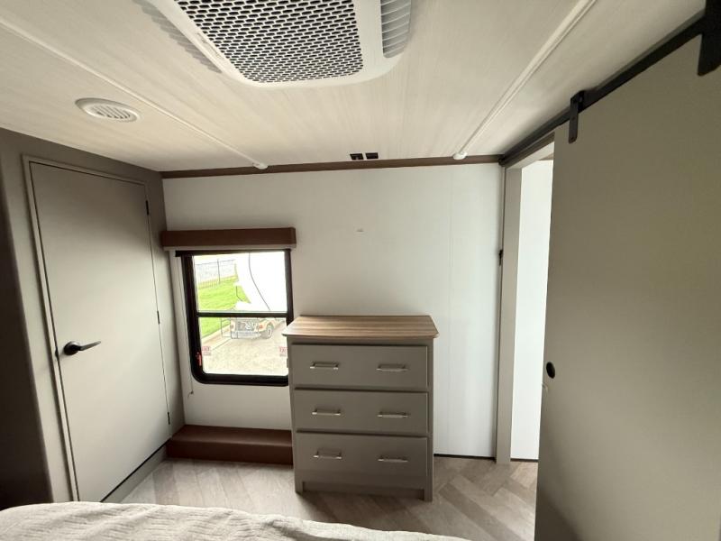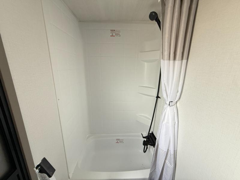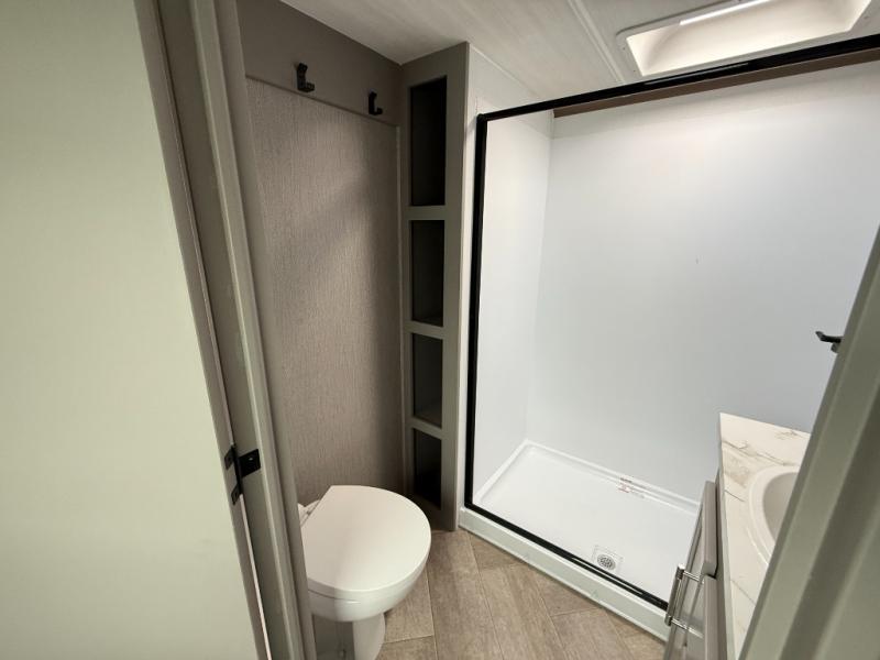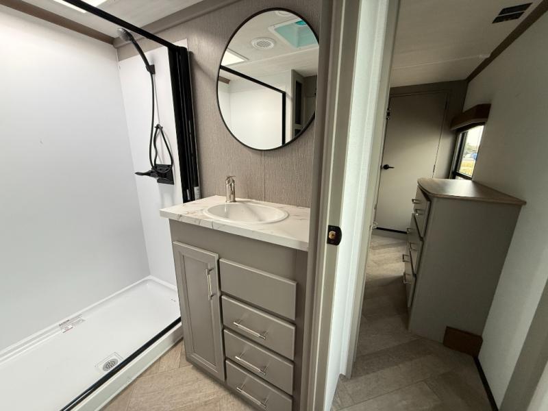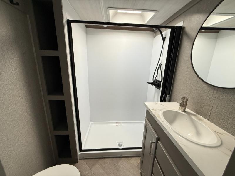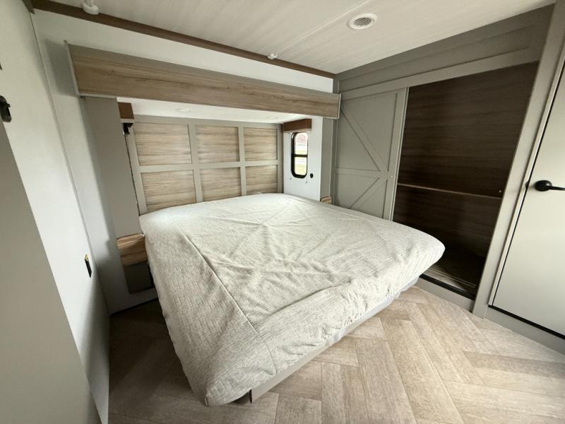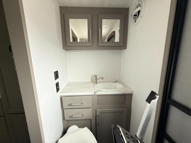The Sprinter fifth wheels by Keystone feature spacious living areas, plenty of storage, and outstanding towability. Each unit is constructed with 2" aluminum framed and laminated sidewalls, a fully walkable roof, and dual layer insulation to help extend your camping season. The heated pass-through storage includes lockable slam latch baggage doors so you can easily pack your gear, and the one-touch 4-point leveling system features return hookup memory to have you set up in no-time. Head inside to find Congoleum vinyl flooring, Thomas Payne luxury collection furniture, residential style seamless marbled countertops, and an upgraded bedspread to name a few comforts. The Sprinter also includes a Girard tankless on-demand water heater, a central command center, plus a 30k BTU furnace and two A/C units to ensure your comfort!