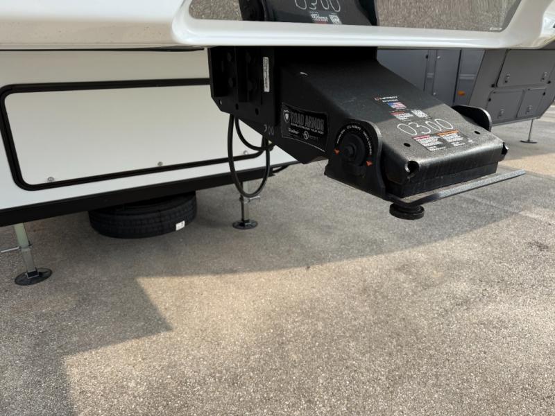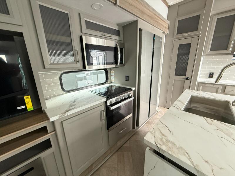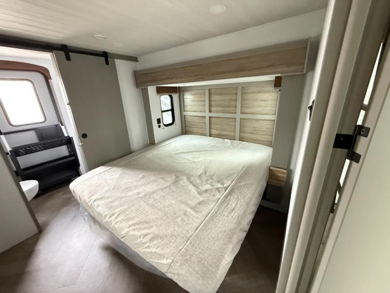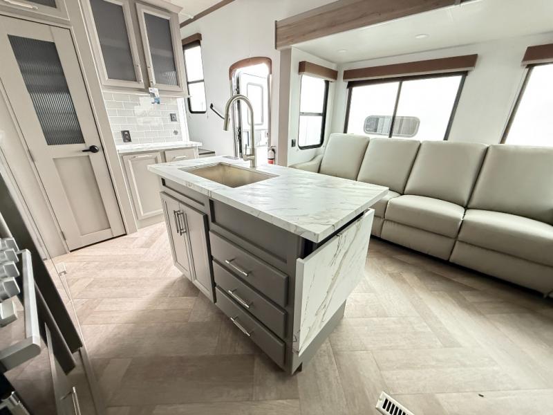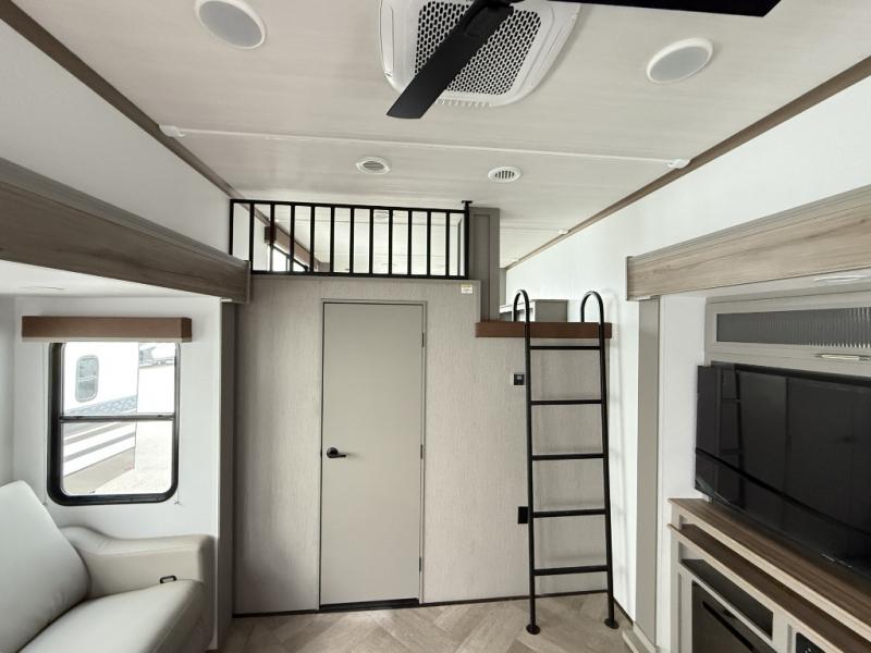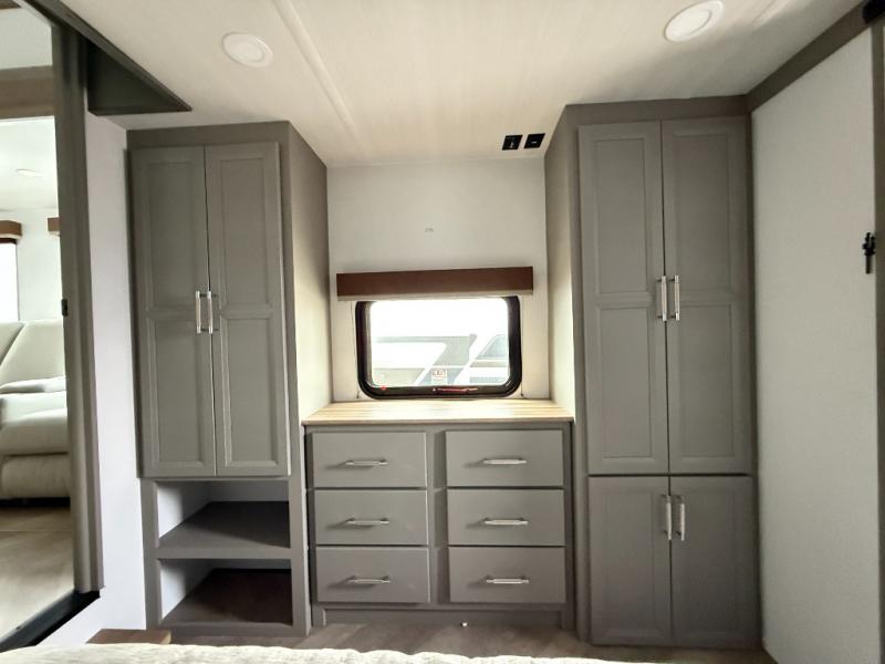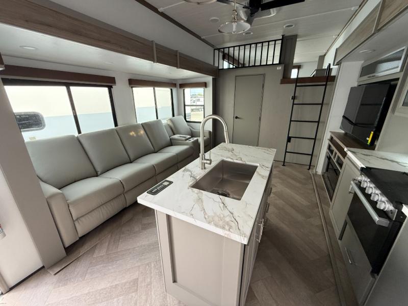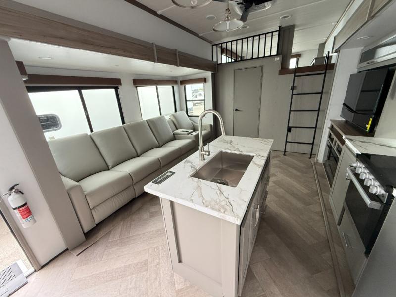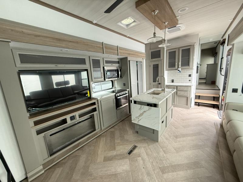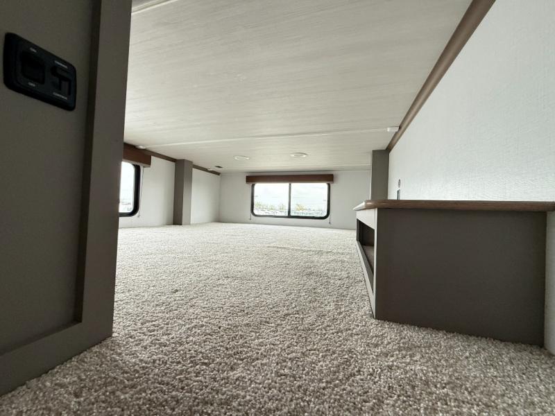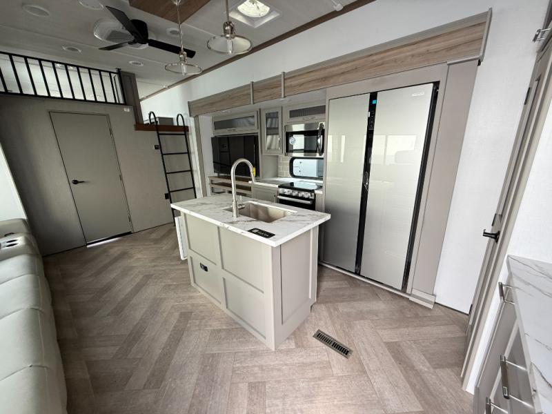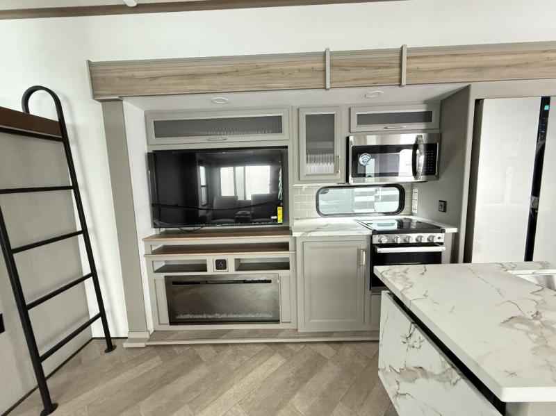Two bedrooms and two full baths make this fifth wheel perfect for camping with friends and family! The front bedroom includes a king bed slide out with storage underneath, a wardrobe with a shelf, plus a closet with washer and dryer prep if you want to add these appliances. The master suite includes a second king bed slide out, dual wardrobes and a dresser, plus a full rear bath with one of the dual entry doors. There is also a loft area above this room with plenty of space, an entertainment/gaming center, and a ladder. Everyone can meet in the main living area to relax on the theater seating or dine at the booth dinette. And a full kitchen is complete with an island, pantry, 16 cu. ft. 12V refrigerator, and a hutch to name a few convenient features!
