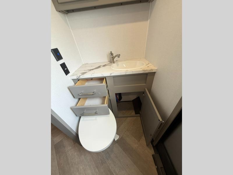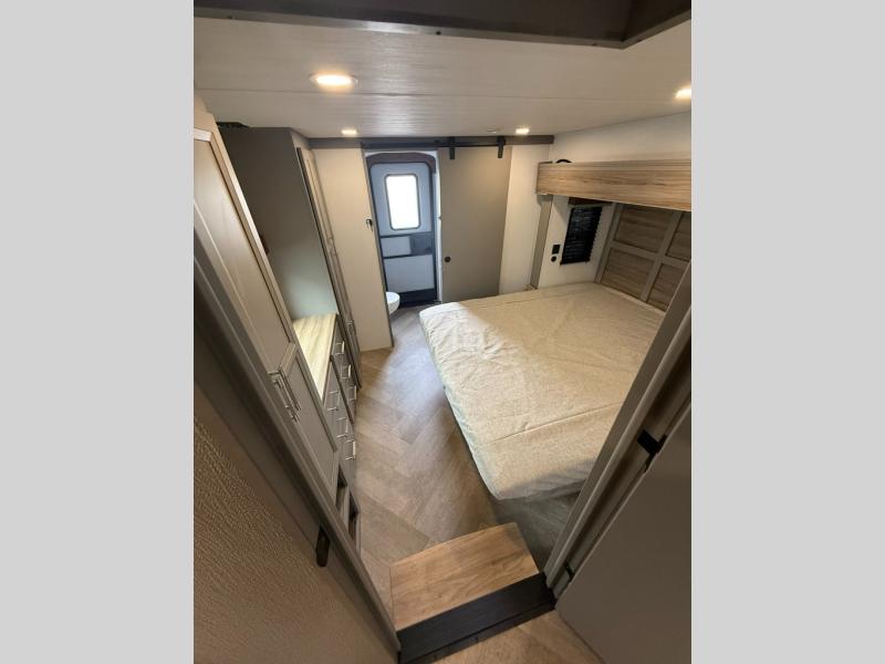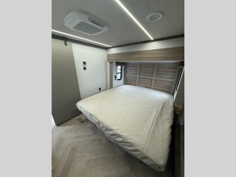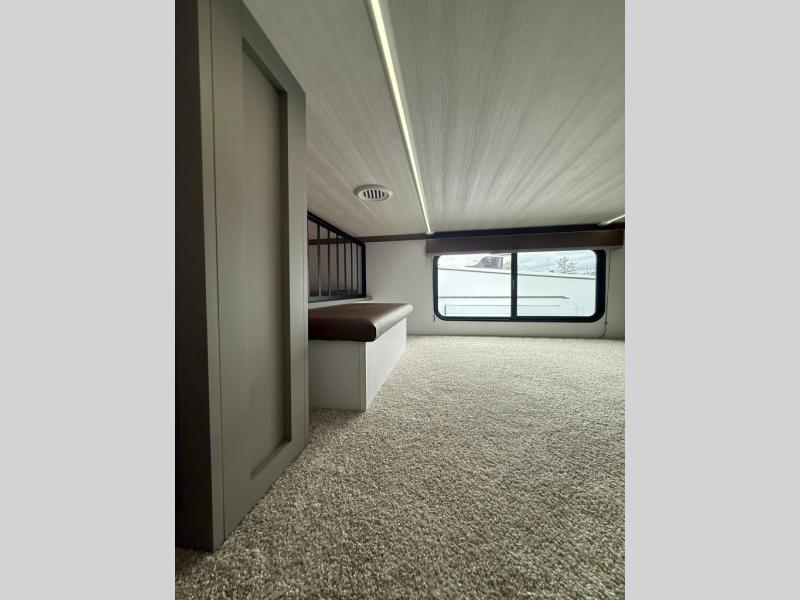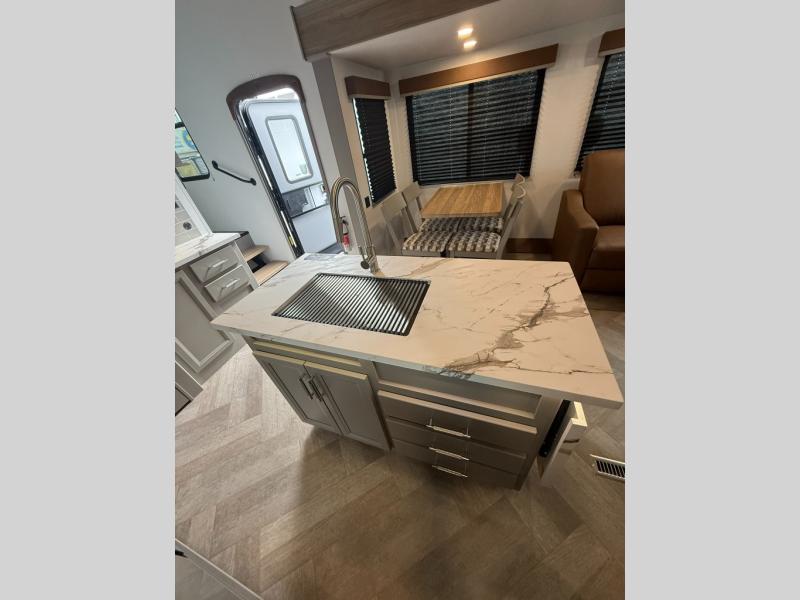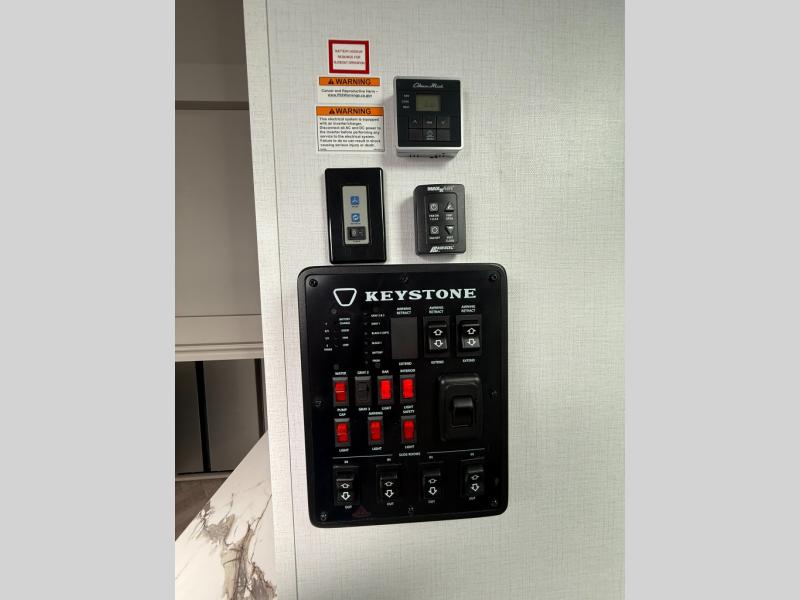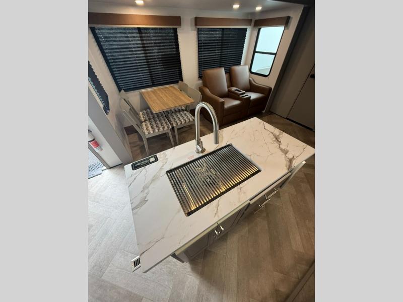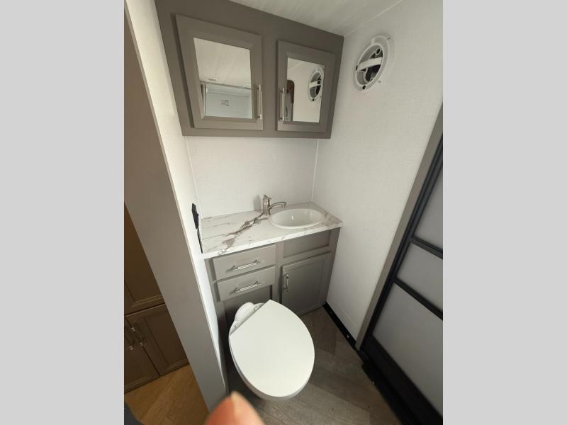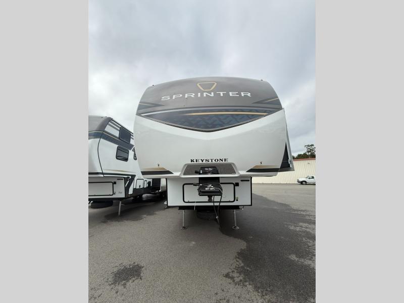 The Sprinter fifth wheels by Keystone feature spacious living areas, plenty of storage, and outstanding towability. Each unit is constructed with 2" aluminum framed and laminated sidewalls, a fully walkable roof, and dual layer insulation to help extend your camping season. The heated pass-through storage includes lockable slam latch baggage doors so you can easily pack your gear, and the one-touch 4-point leveling system features return hookup memory to have you set up in no-time. Head inside to find Congoleum vinyl flooring, Thomas Payne luxury collection furniture, residential style seamless marbled countertops, and an upgraded bedspread to name a few comforts. The Sprinter also includes a Girard tankless on-demand water heater, a central command center, plus a 30k BTU furnace and two A/C units to ensure your comfort!