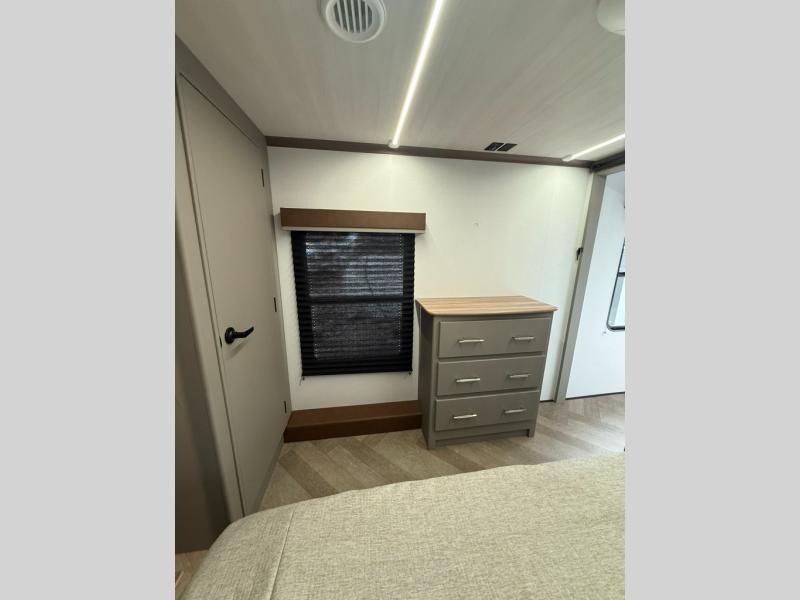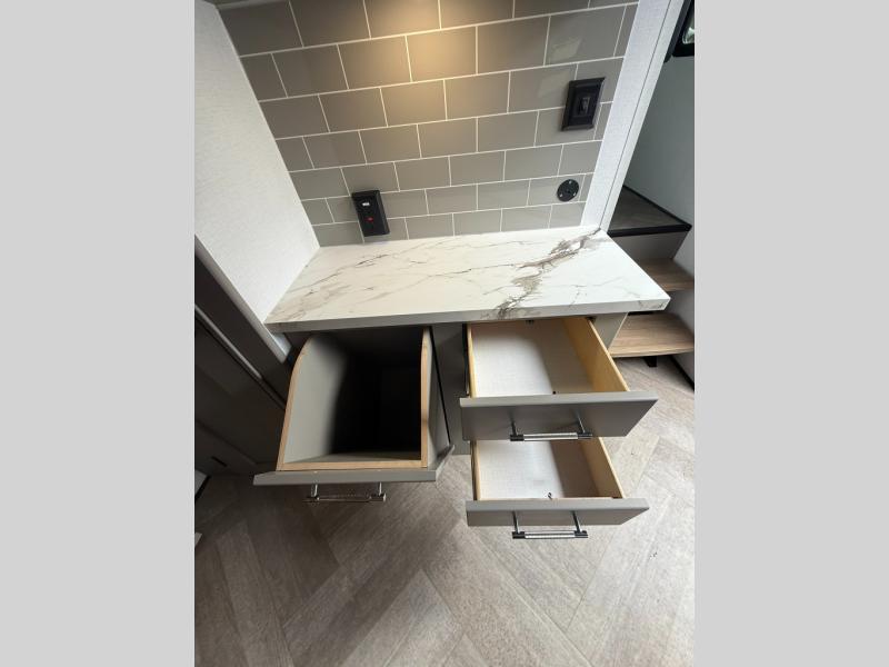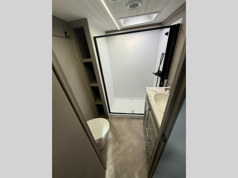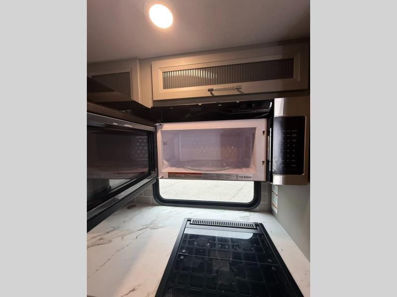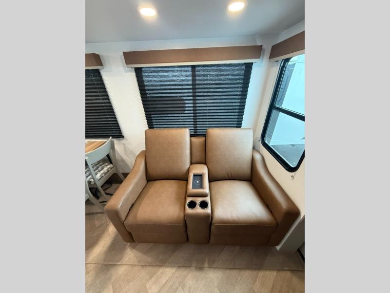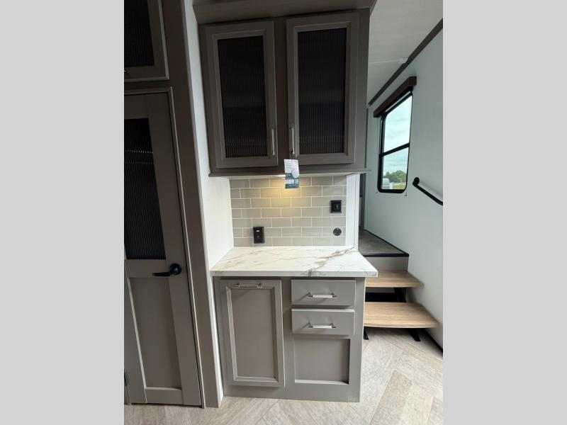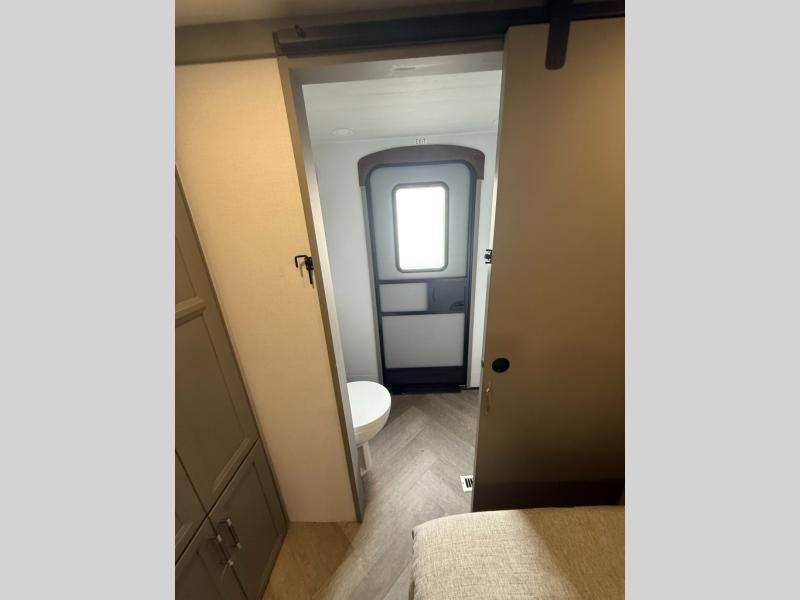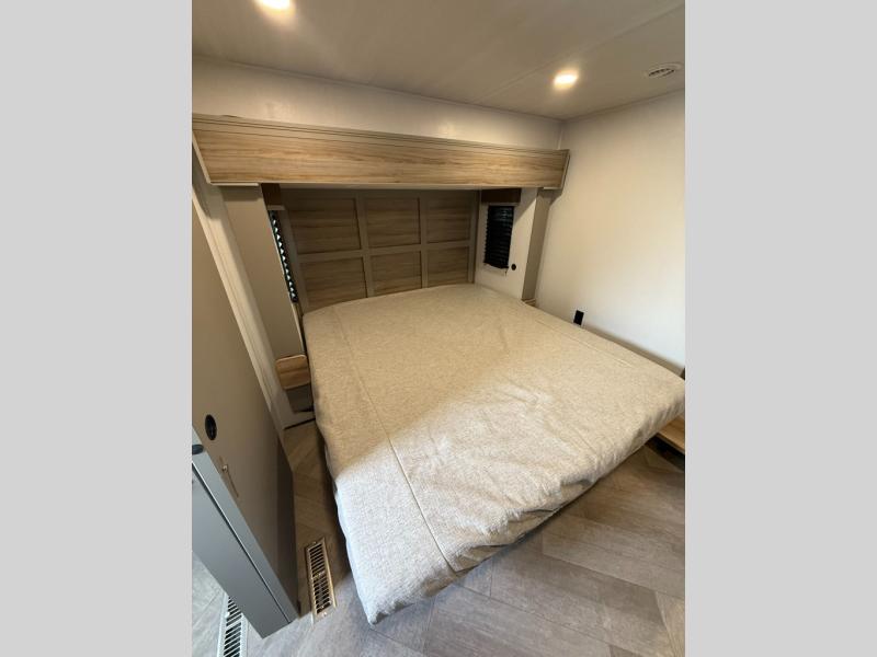 The Sprinter fifth wheels by Keystone feature spacious living areas, plenty of storage, and outstanding towability. Each unit is constructed with 2" aluminum framed and laminated sidewalls, a fully walkable roof, and dual layer insulation to help extend your camping season. The heated pass-through storage includes lockable slam latch baggage doors so you can easily pack your gear, and the one-touch 4-point leveling system features return hookup memory to have you set up in no-time. Head inside to find Congoleum vinyl flooring, Thomas Payne luxury collection furniture, residential style seamless marbled countertops, and an upgraded bedspread to name a few comforts. The Sprinter also includes a Girard tankless on-demand water heater, a central command center, plus a 30k BTU furnace and two A/C units to ensure your comfort!