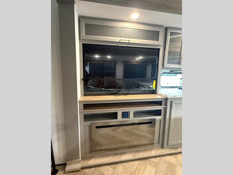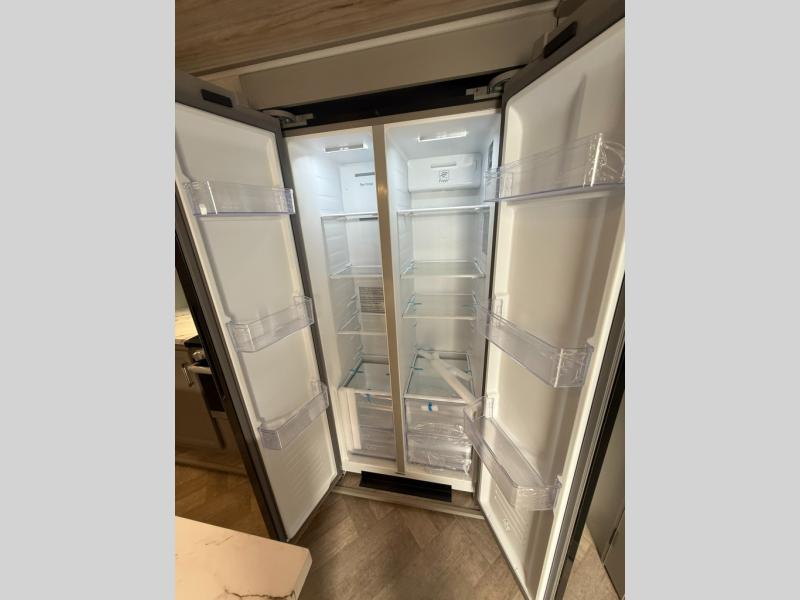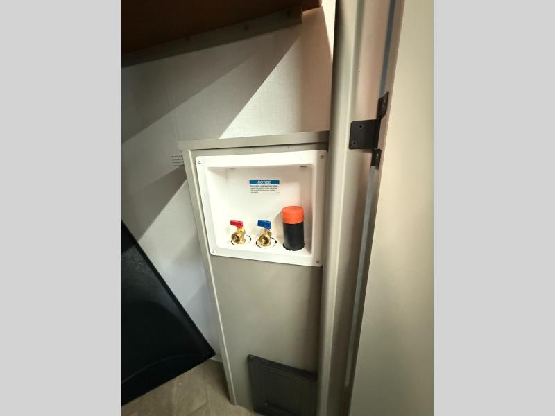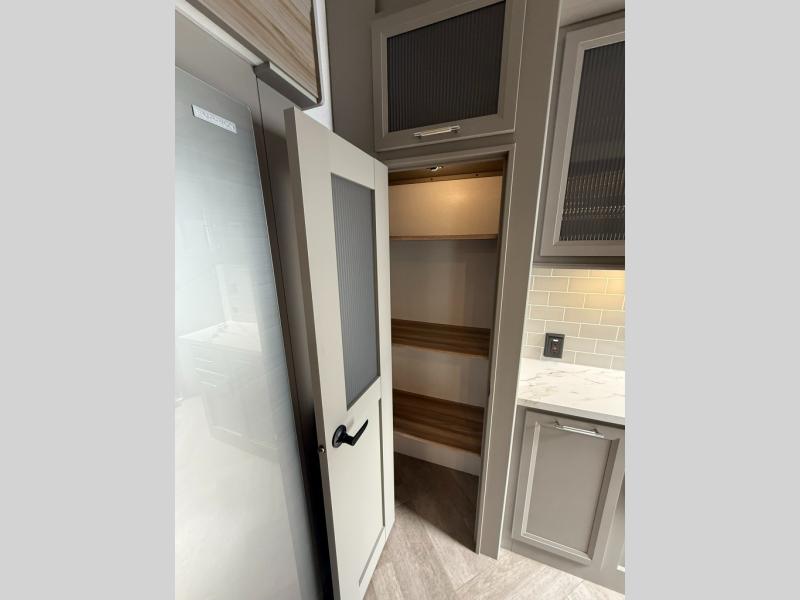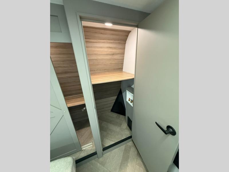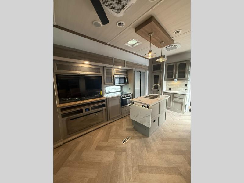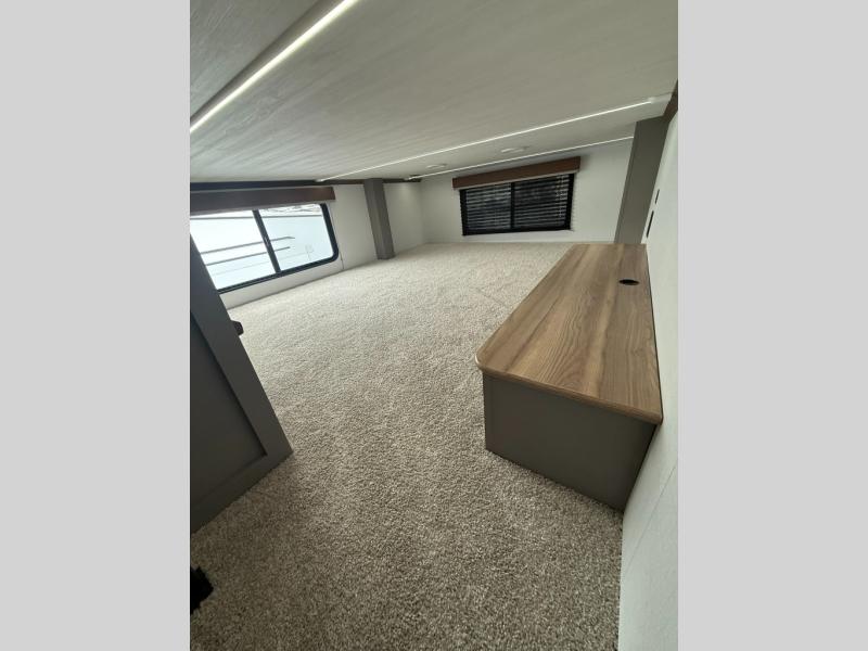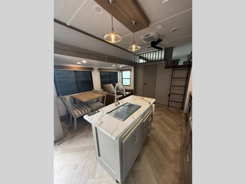 Two bedrooms and two full baths make this fifth wheel perfect for camping with friends and family! The front bedroom includes a king bed slide out with storage underneath, a wardrobe with a shelf, plus a closet with washer and dryer prep if you want to add these appliances. The master suite includes a second king bed slide out, dual wardrobes and a dresser, plus a full rear bath with one of the dual entry doors. There is also a loft area above this room with plenty of space, an entertainment/gaming center, and a ladder. Everyone can meet in the main living area to relax on the theater seating or dine at the booth dinette. And a full kitchen is complete with an island, pantry, 16 cu. ft. 12V refrigerator, and a hutch to name a few convenient features!