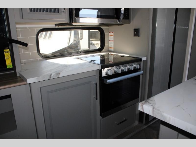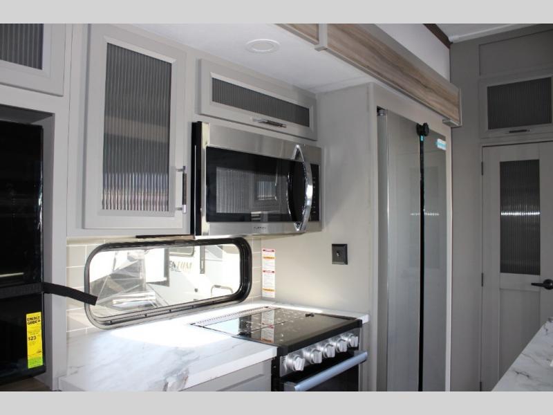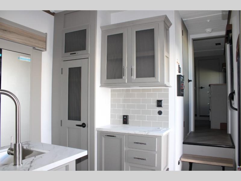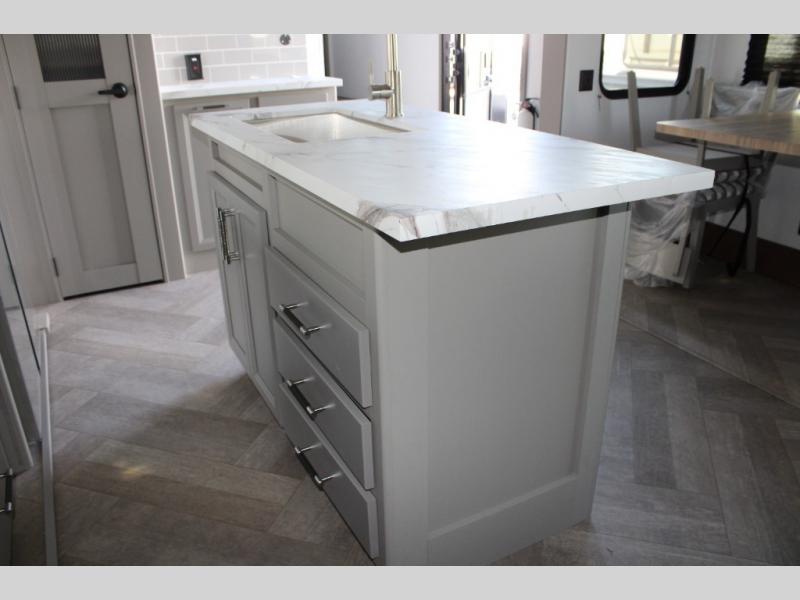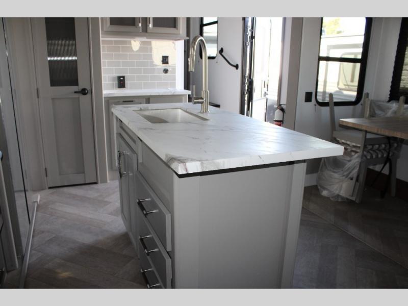 Includes solid-surface countertops, deep stainless sink, 16 cu. ft. 12V refrigerator, three-burner range, oven, microwave, pantry, and a dedicated hutch for dishes or coffee bar setups.