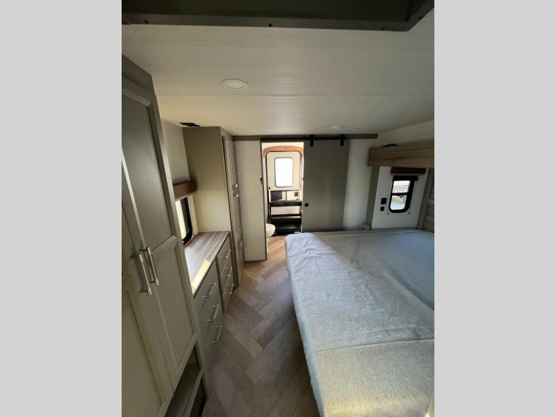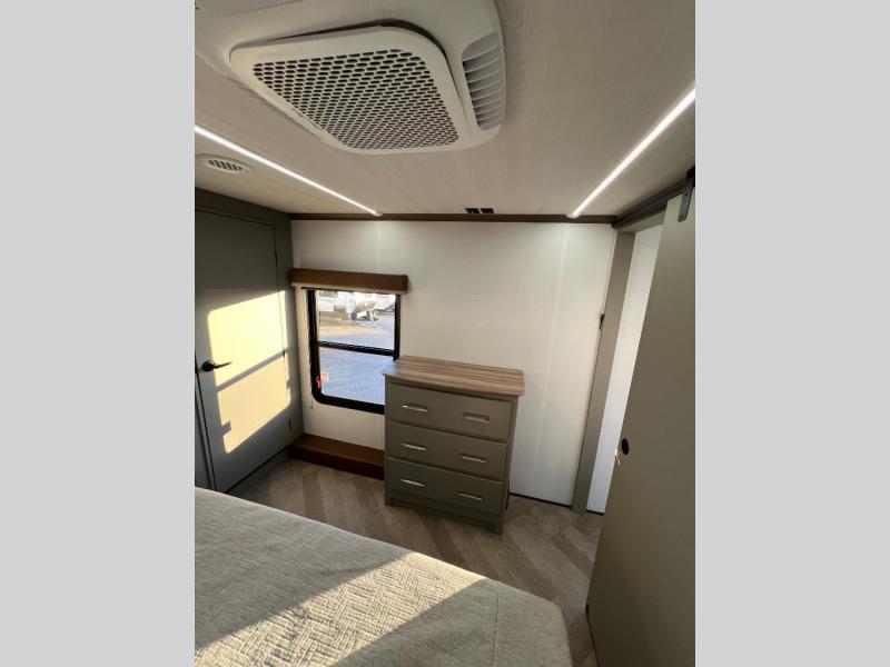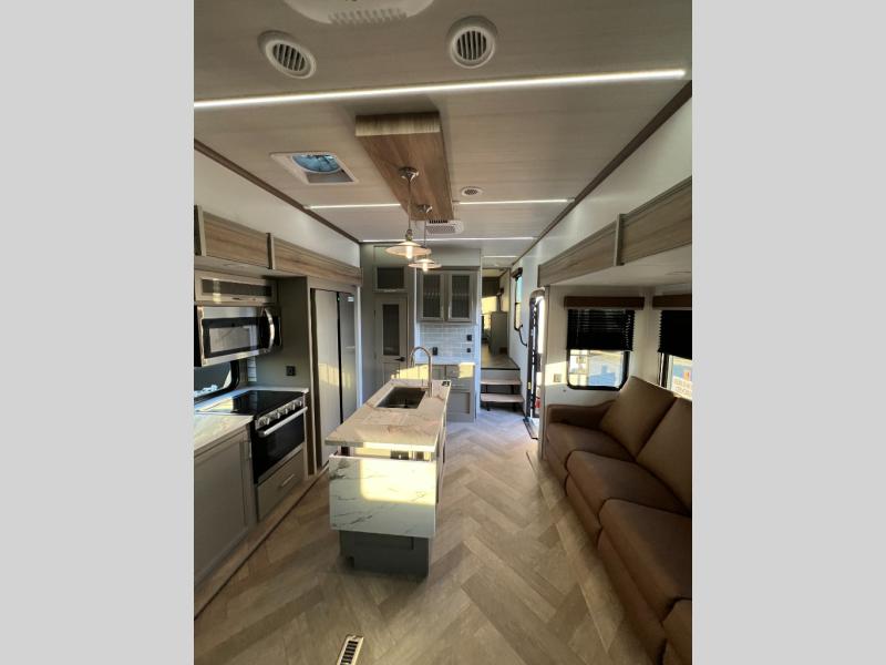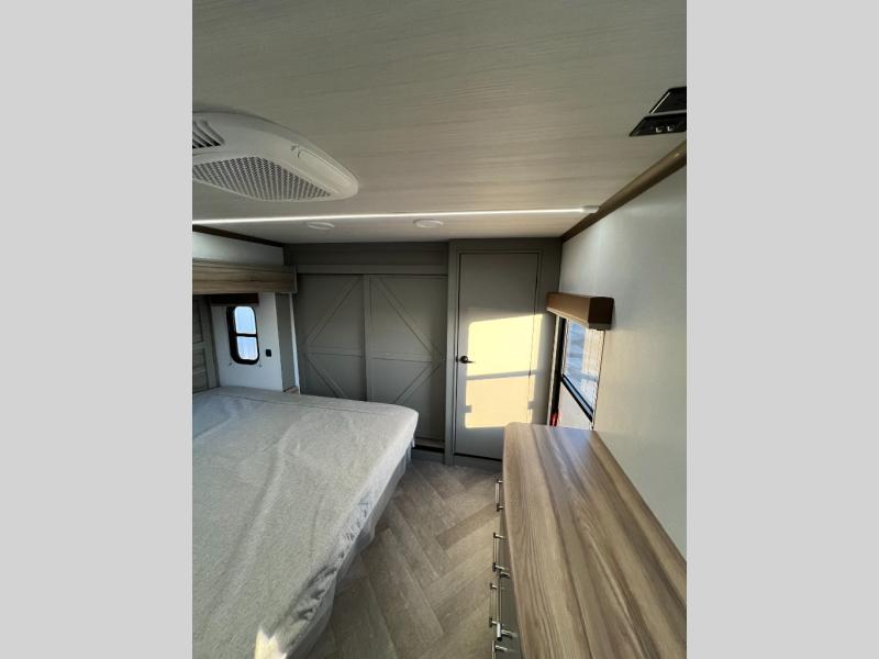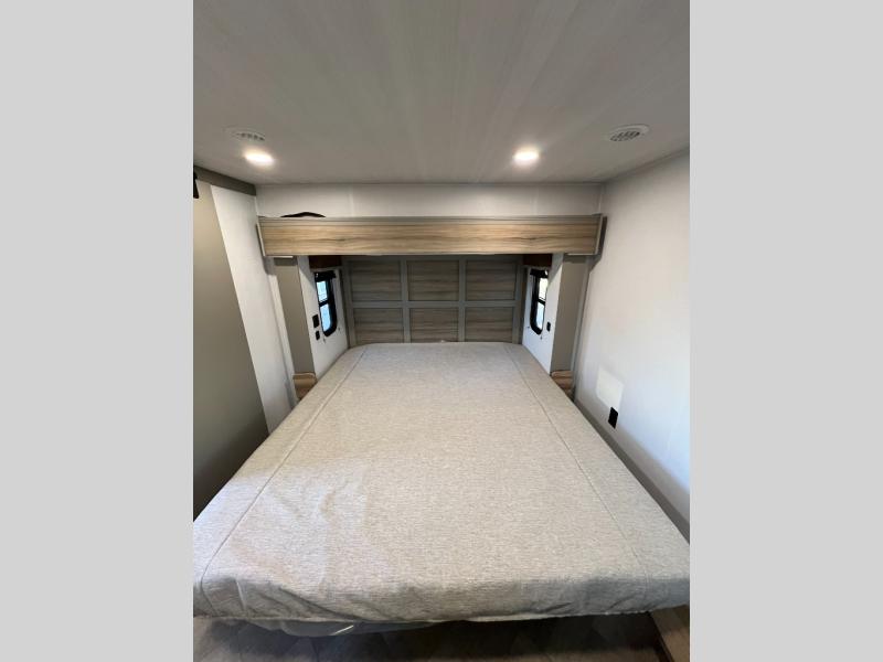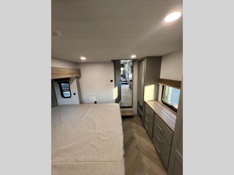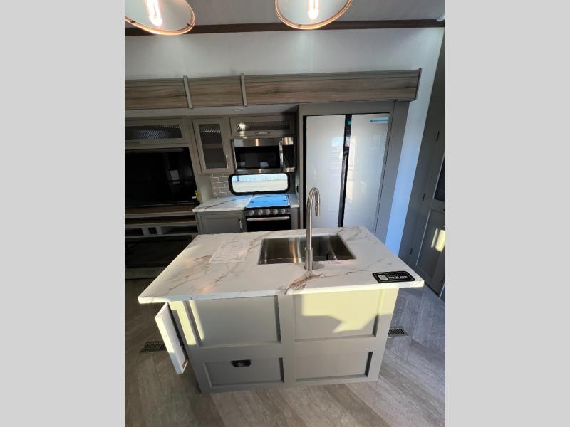 The Sprinter fifth wheels by Keystone feature spacious living areas, plenty of storage, and outstanding towability. Each unit is constructed with 2" aluminum framed and laminated sidewalls, a fully walkable roof, and dual layer insulation to help extend your camping season. The heated pass-through storage includes lockable slam latch baggage doors so you can easily pack your gear, and the one-touch 4-point leveling system features return hookup memory to have you set up in no-time. Head inside to find Congoleum vinyl flooring, Thomas Payne luxury collection furniture, residential style seamless marbled countertops, and an upgraded bedspread to name a few comforts. The Sprinter also includes a Girard tankless on-demand water heater, a central command center, plus a 30k BTU furnace and two A/C units to ensure your comfort!