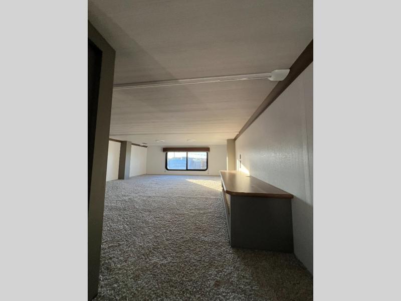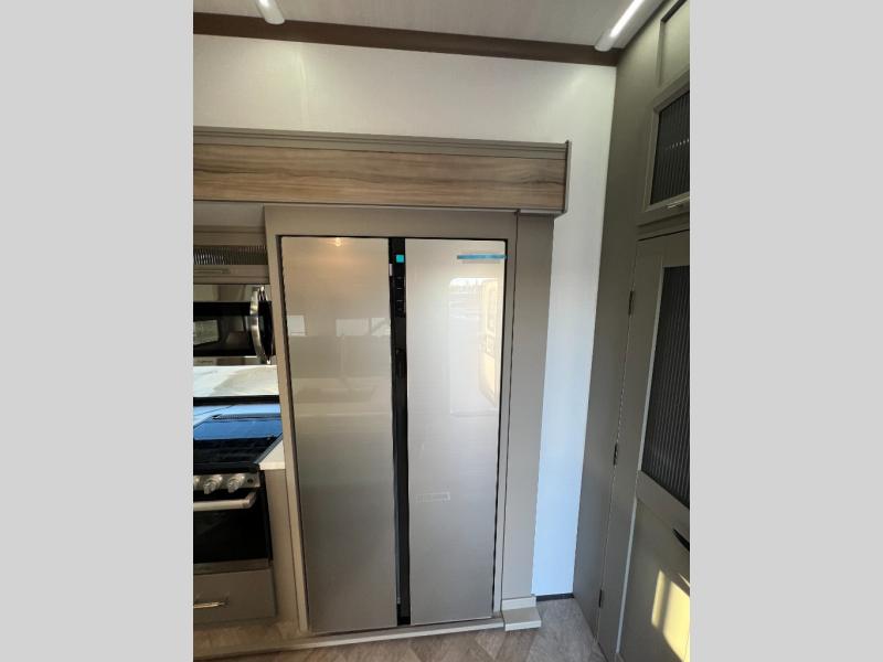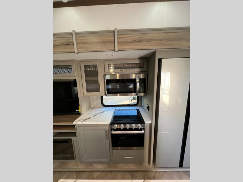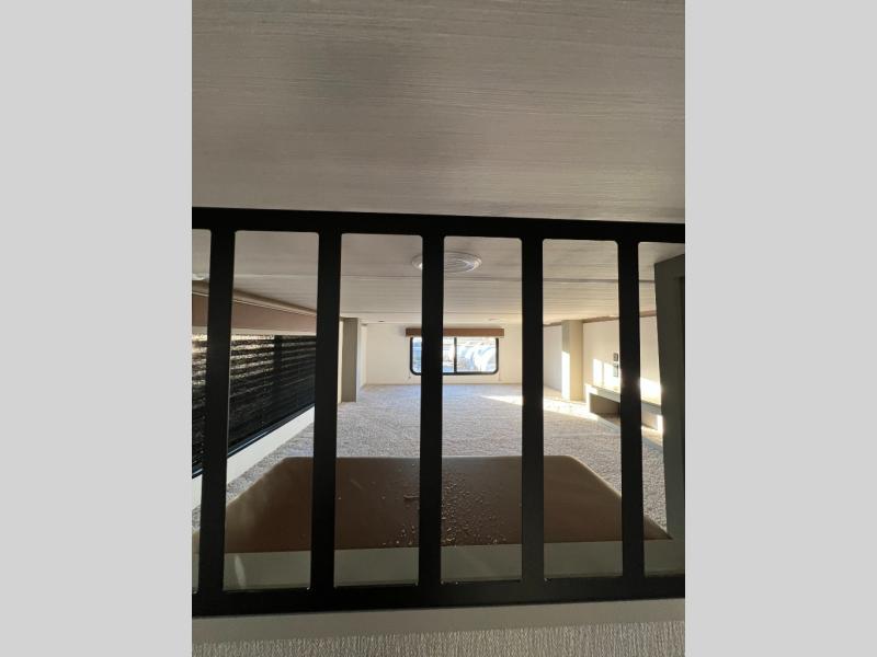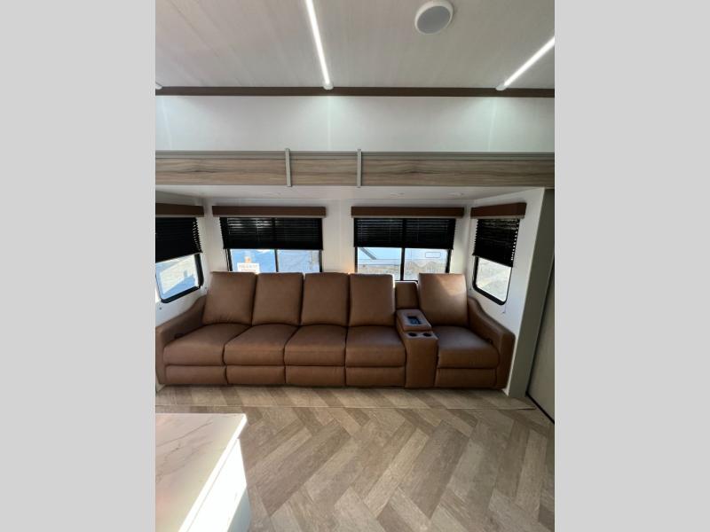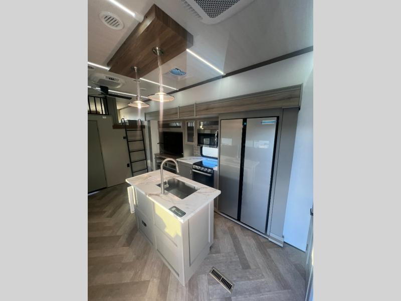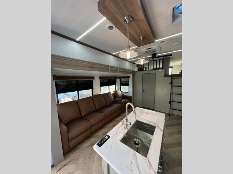 Two bedrooms and two full baths make this fifth wheel perfect for camping with friends and family! The front bedroom includes a king bed slide out with storage underneath, a wardrobe with a shelf, plus a closet with washer and dryer prep if you want to add these appliances. The master suite includes a second king bed slide out, dual wardrobes and a dresser, plus a full rear bath with one of the dual entry doors. There is also a loft area above this room with plenty of space, an entertainment/gaming center, and a ladder. Everyone can meet in the main living area to relax on the theater seating or dine at the booth dinette. And a full kitchen is complete with an island, pantry, 16 cu. ft. 12V refrigerator, and a hutch to name a few convenient features!