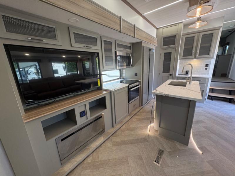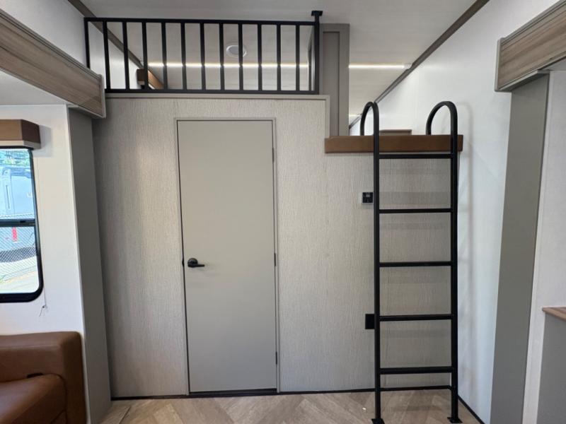 Two bedrooms and two full baths make this fifth wheel perfect for camping with friends and family! The front bedroom includes a king bed slide out with storage underneath, a wardrobe with a shelf, plus a closet with washer and dryer prep if you want to add these appliances. The master suite includes a second king bed slide out, dual wardrobes and a dresser, plus a full rear bath with one of the dual entry doors. There is also a loft area above this room with plenty of space, an entertainment/gaming center, and a ladder. Everyone can meet in the main living area to relax on the theater seating or dine at the booth dinette. And a full kitchen is complete with an island, pantry, 16 cu. ft. 12V refrigerator, and a hutch to name a few convenient features!