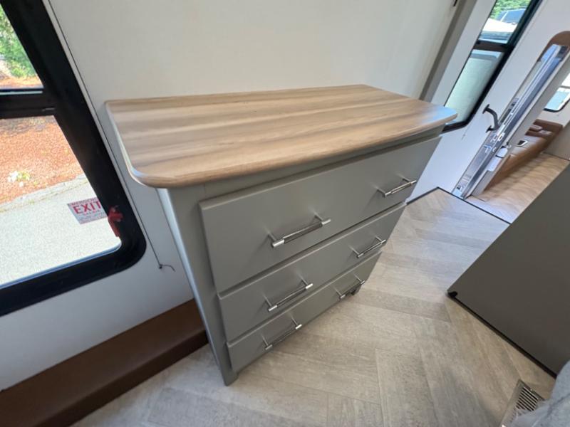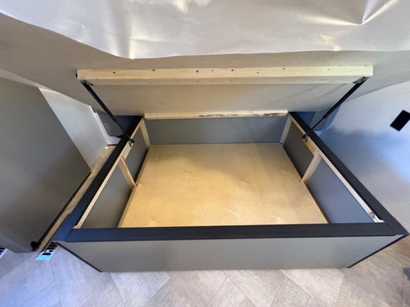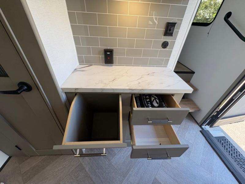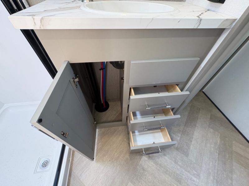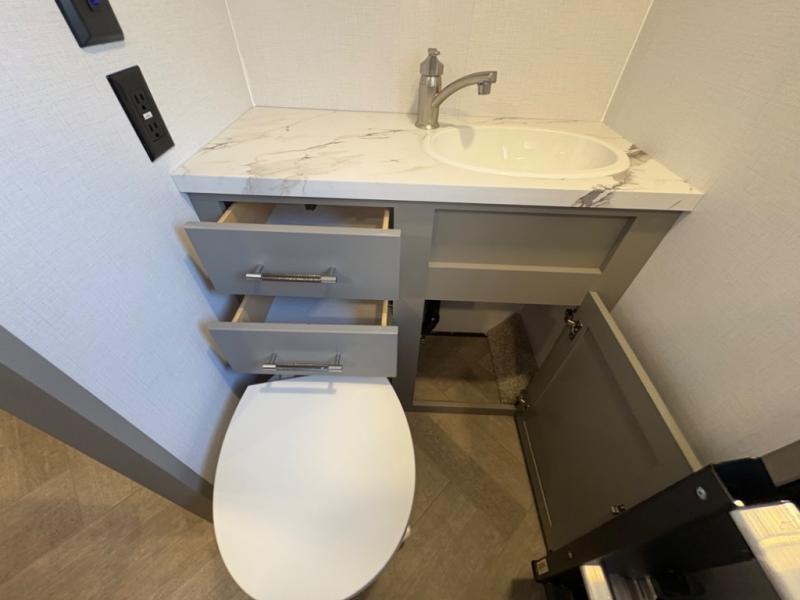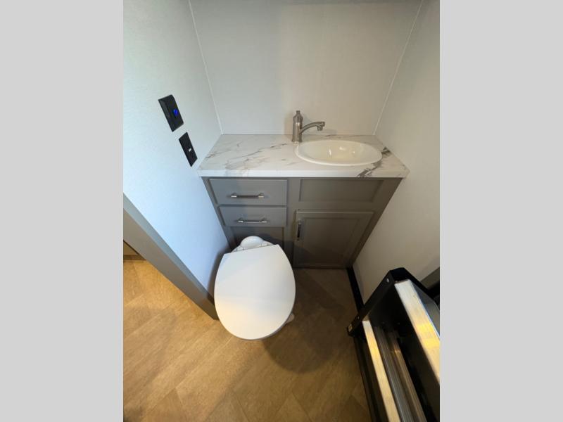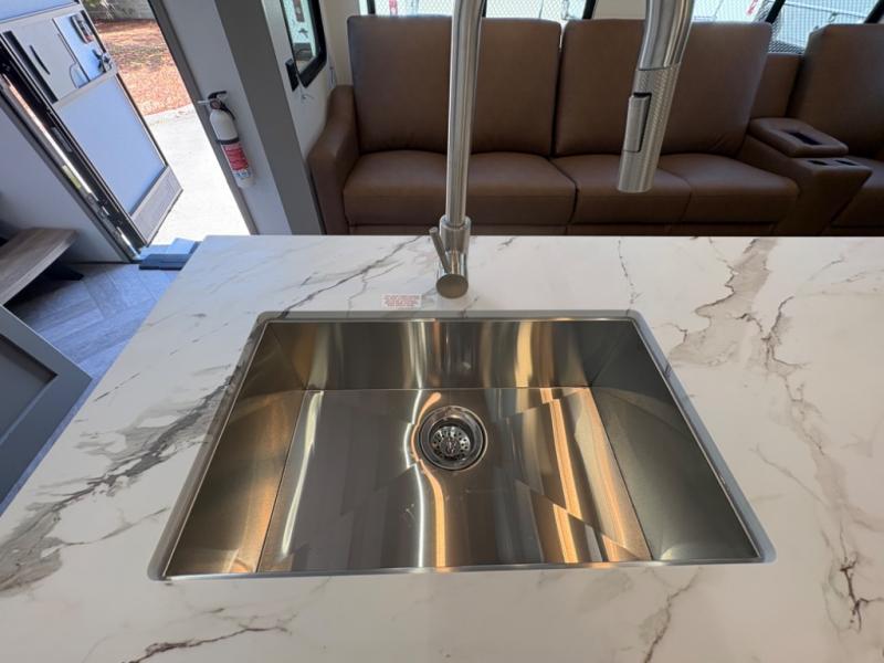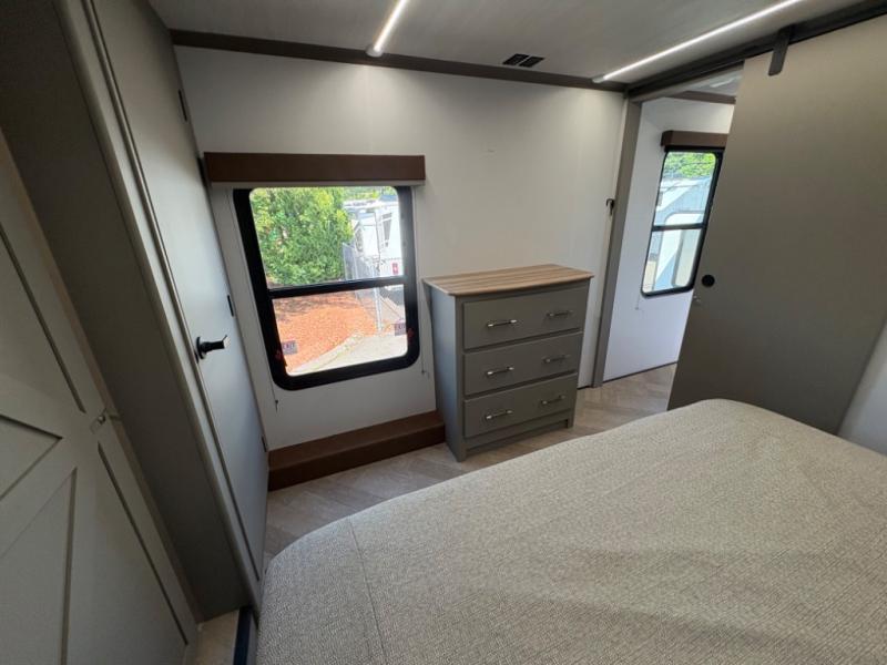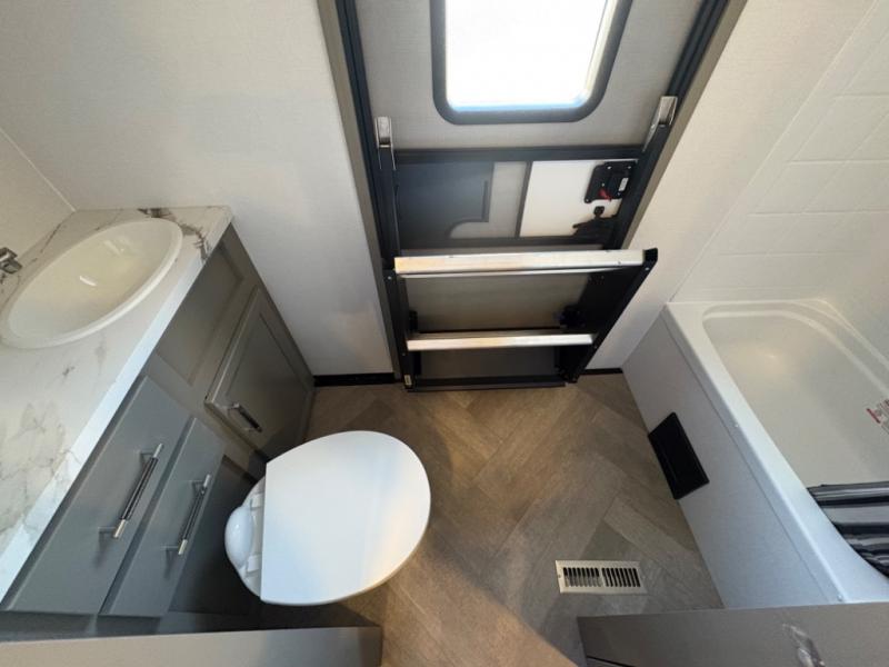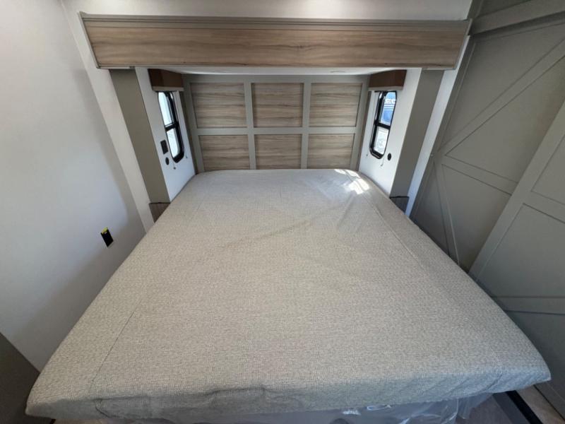 The Sprinter fifth wheels by Keystone feature spacious living areas, plenty of storage, and outstanding towability. Each unit is constructed with 2" aluminum framed and laminated sidewalls, a fully walkable roof, and dual layer insulation to help extend your camping season. The heated pass-through storage includes lockable slam latch baggage doors so you can easily pack your gear, and the one-touch 4-point leveling system features return hookup memory to have you set up in no-time. Head inside to find Congoleum vinyl flooring, Thomas Payne luxury collection furniture, residential style seamless marbled countertops, and an upgraded bedspread to name a few comforts. The Sprinter also includes a Girard tankless on-demand water heater, a central command center, plus a 30k BTU furnace and two A/C units to ensure your comfort!