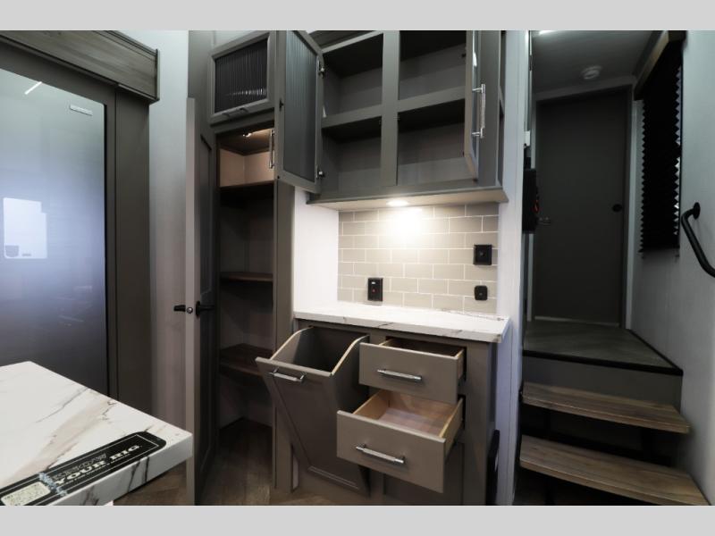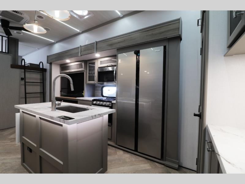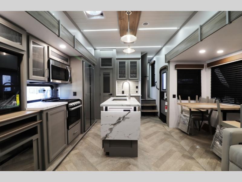 Inside the gourmet kitchen, you’ll find everything needed for extended travel or full-time living. Solid-surface countertops, residential-style cabinetry, a large refrigerator, high-output range, oven, and deep stainless sink make meal prep simple whether you’re cooking for two or feeding the whole family. The free-standing dinette offers a comfortable dining experience and doubles as a workspace for remote work or homeschooling on the road.