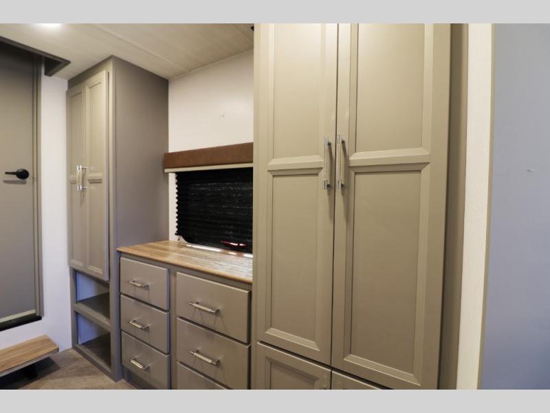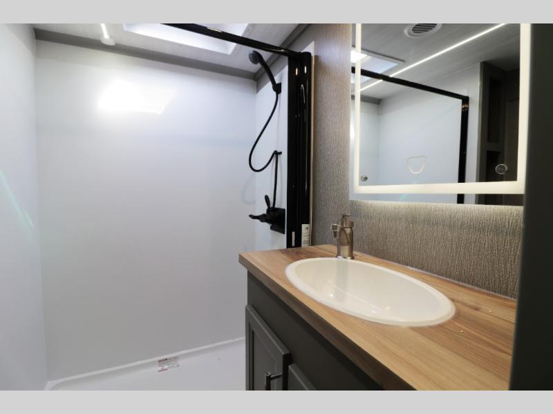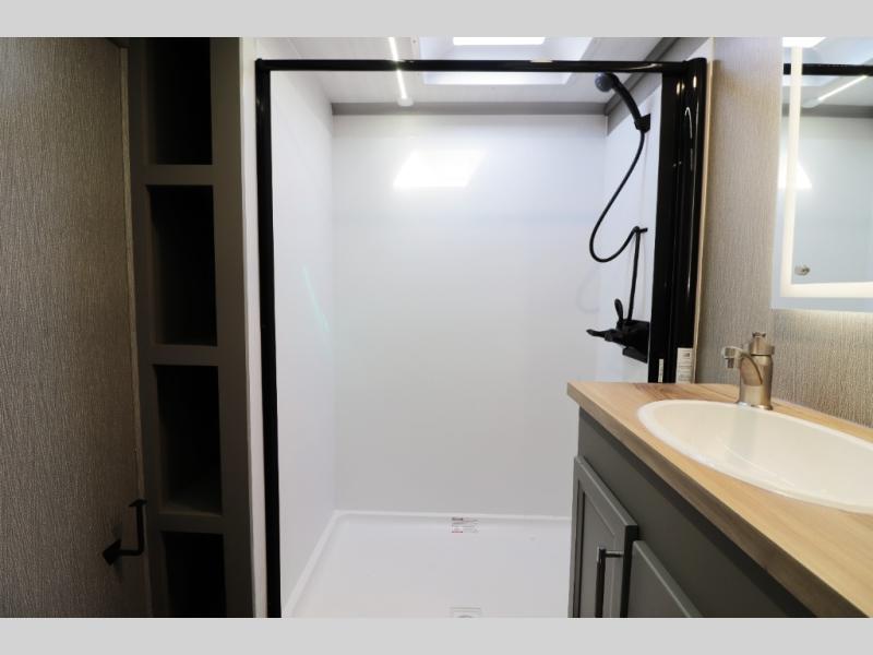 The private master suite is built for true comfort and rest. A residential-style queen or king bed, large wardrobe storage, washer/dryer prep, and premium mattress provide the feel of home no matter where you travel. The spacious bathroom features a large shower with glass doors, modern fixtures, and residential storage, giving you comfort and convenience during extended stays.