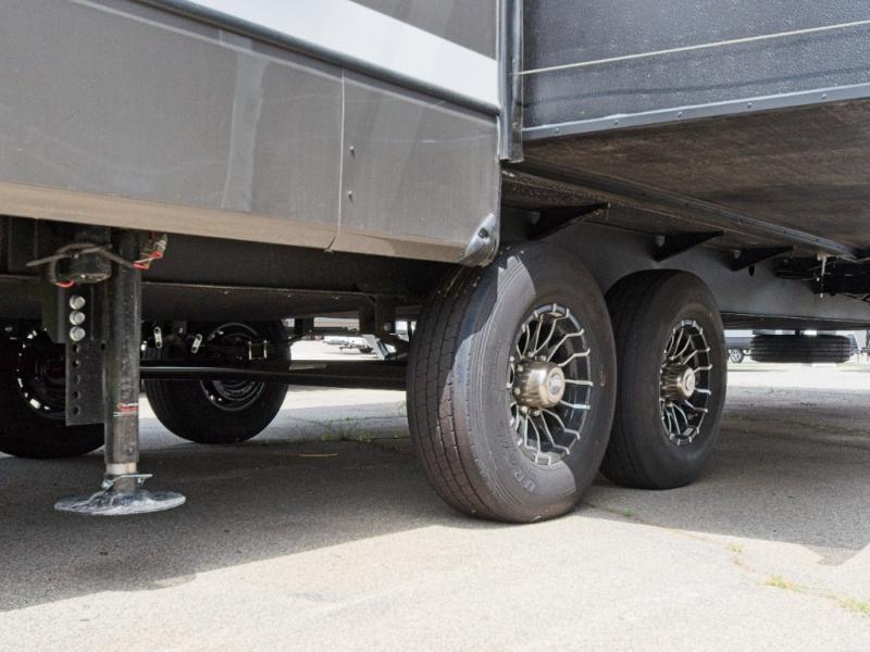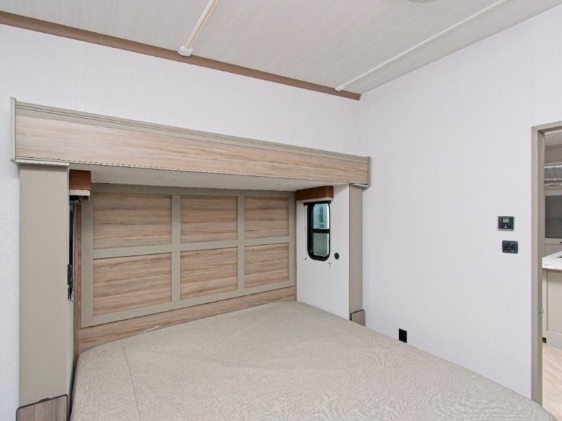 At the front, the private bunkhouse suite features two bunk beds, a built-in desk, a slide-out with TV hookup, and a convenient half bath—ideal for kids or guests. The rear master suite is your personal retreat, complete with a king-size bed, generous storage, and a luxurious full bath with dual sinks.