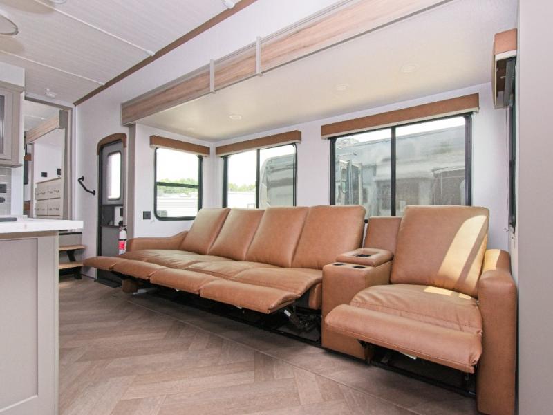Enjoy meals at the booth dinette or upgrade to the optional free-standing table. After dinner, kick back in the full reclining theater seats, perfectly positioned across from the fireplace and 50" HDTV—perfect for relaxing evenings.