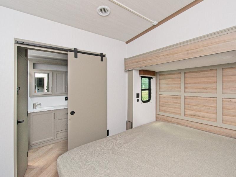 Up front, the private bunkhouse suite includes two bunk beds, a built-in desk, TV hookup, and a half bath, making it ideal for kids or guests. The rear master bedroom features a king-size bed, generous storage, and a full bathroom with dual sinks, so you can unwind in style.