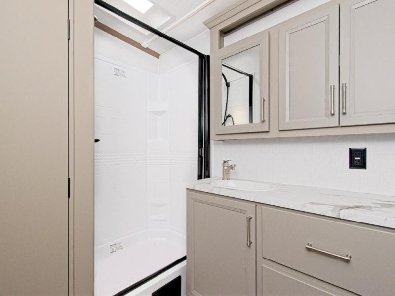 The central kitchen is a chef’s dream, equipped with a three-burner gas range, stainless steel microwave, 16 cu. ft. 12V refrigerator, and a pantry for all your essentials. Whether you’re dining at the booth dinette or opting for the free-standing table, you’ll enjoy every meal in comfort.