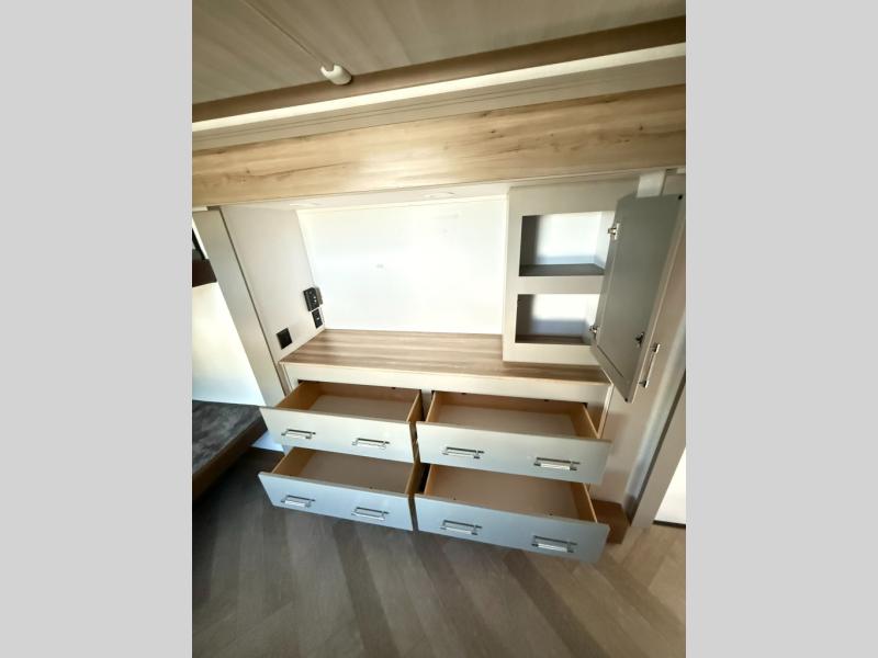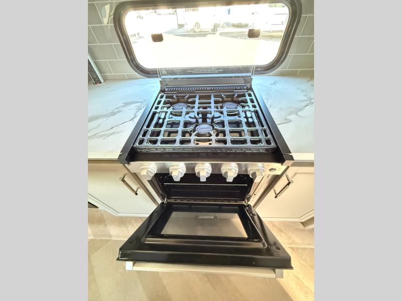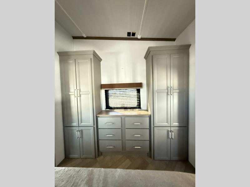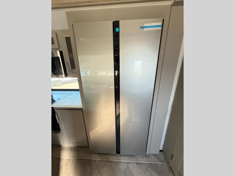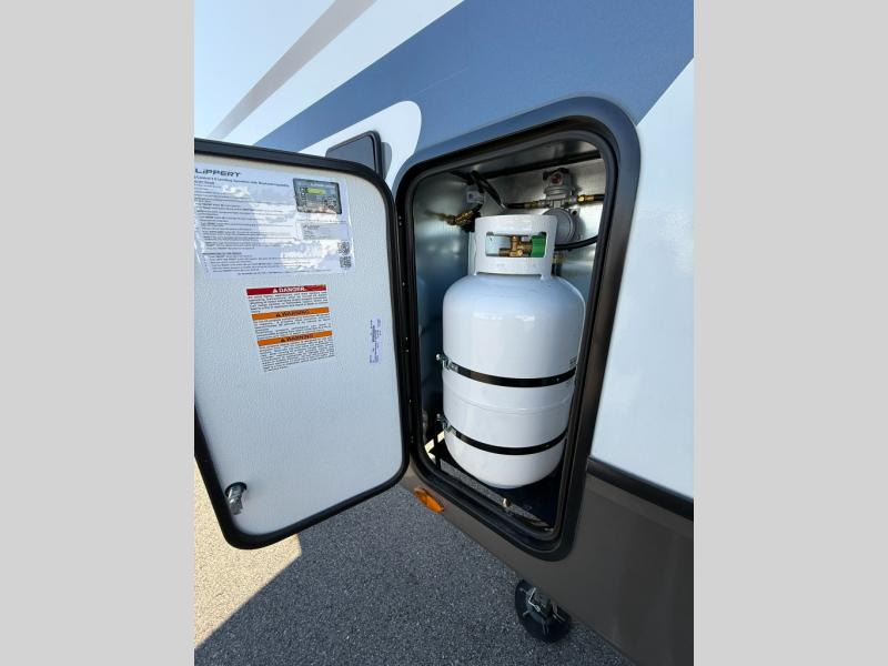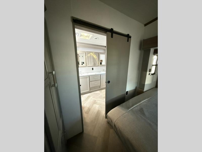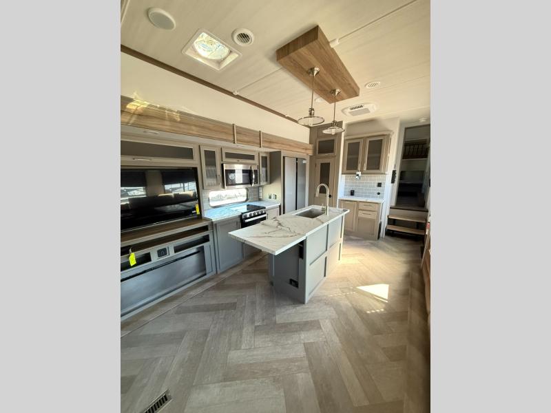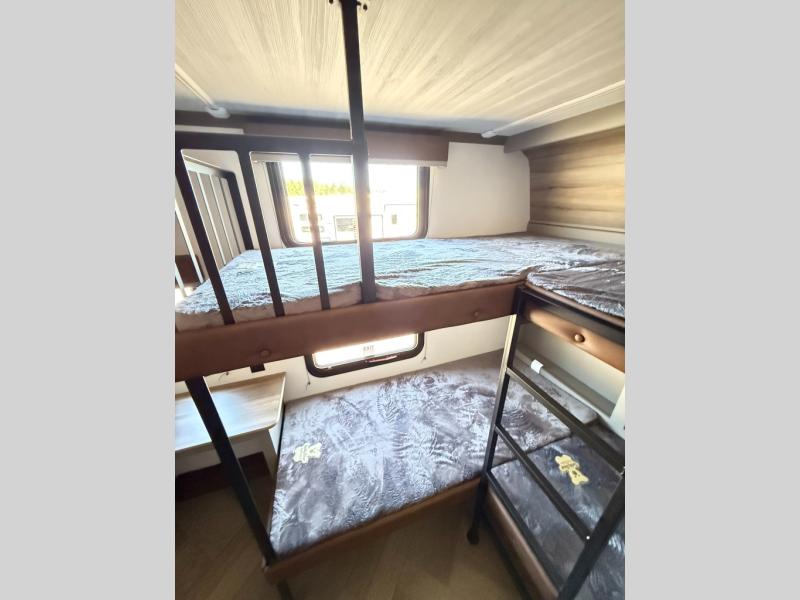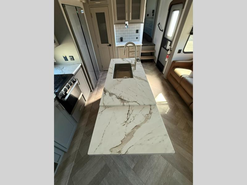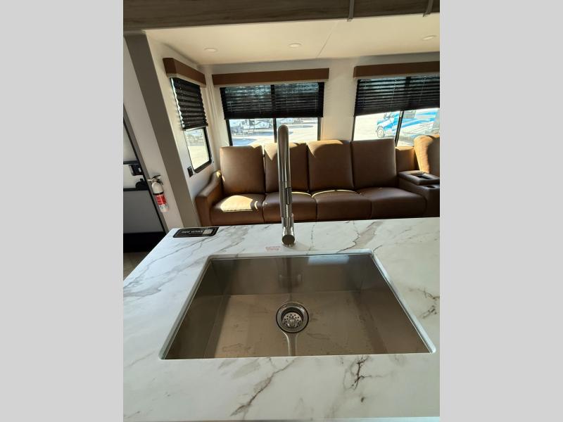 The Sprinter fifth wheels by Keystone feature spacious living areas, plenty of storage, and outstanding towability. Each unit is constructed with 2" aluminum framed and laminated sidewalls, a fully walkable roof, and dual layer insulation to help extend your camping season. The heated pass-through storage includes lockable slam latch baggage doors so you can easily pack your gear, and the one-touch 4-point leveling system features return hookup memory to have you set up in no-time. Head inside to find Congoleum vinyl flooring, Thomas Payne luxury collection furniture, residential style seamless marbled countertops, and an upgraded bedspread to name a few comforts. The Sprinter also includes a Girard tankless on-demand water heater, a central command center, plus a 30k BTU furnace and two A/C units to ensure your comfort!
