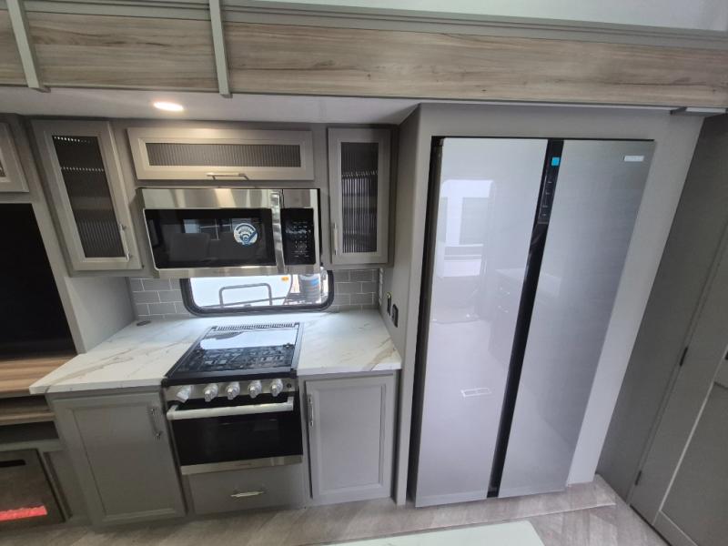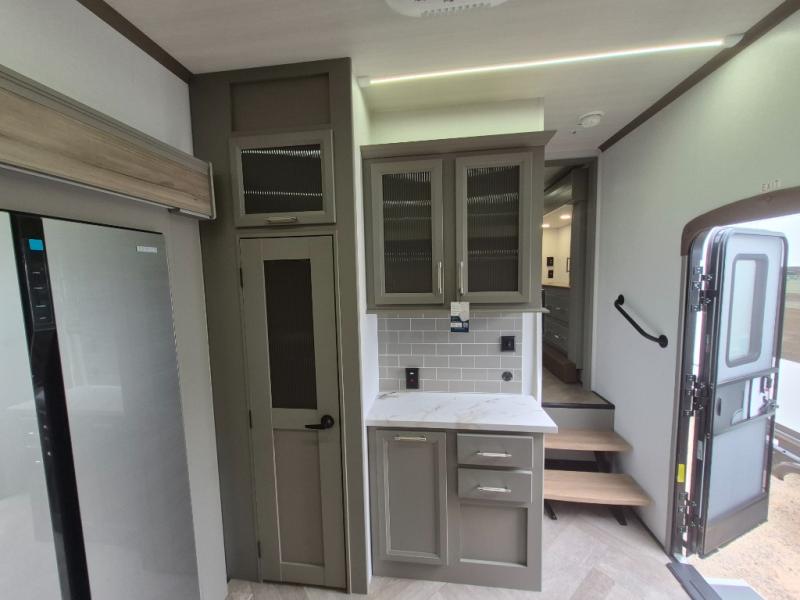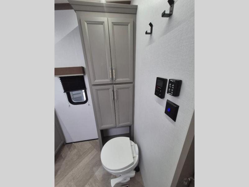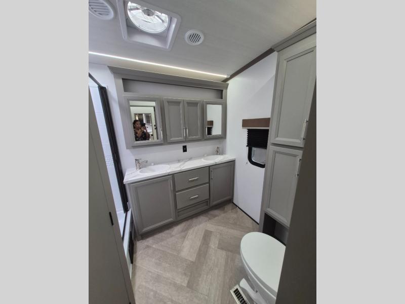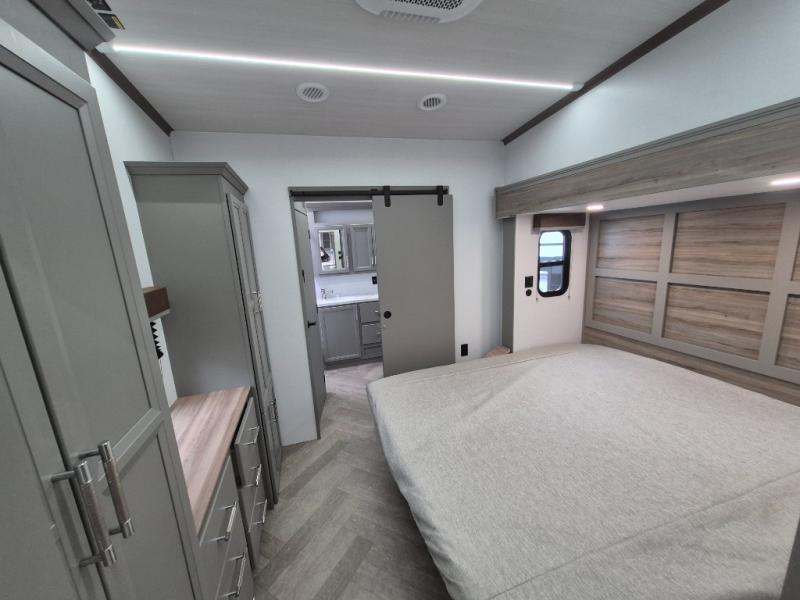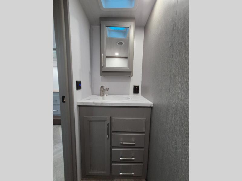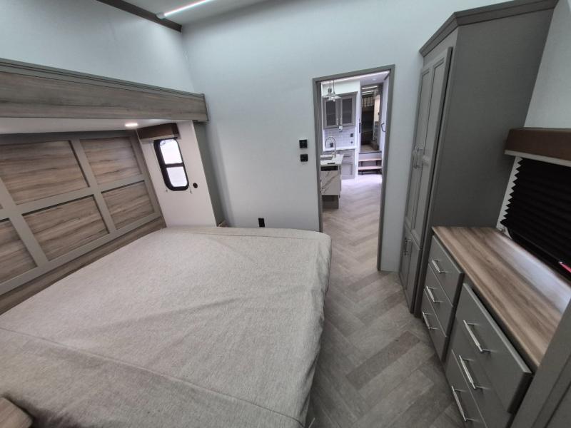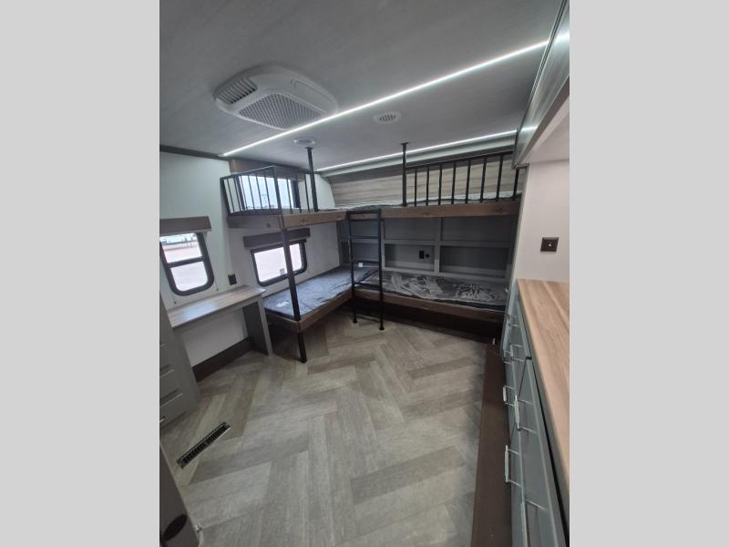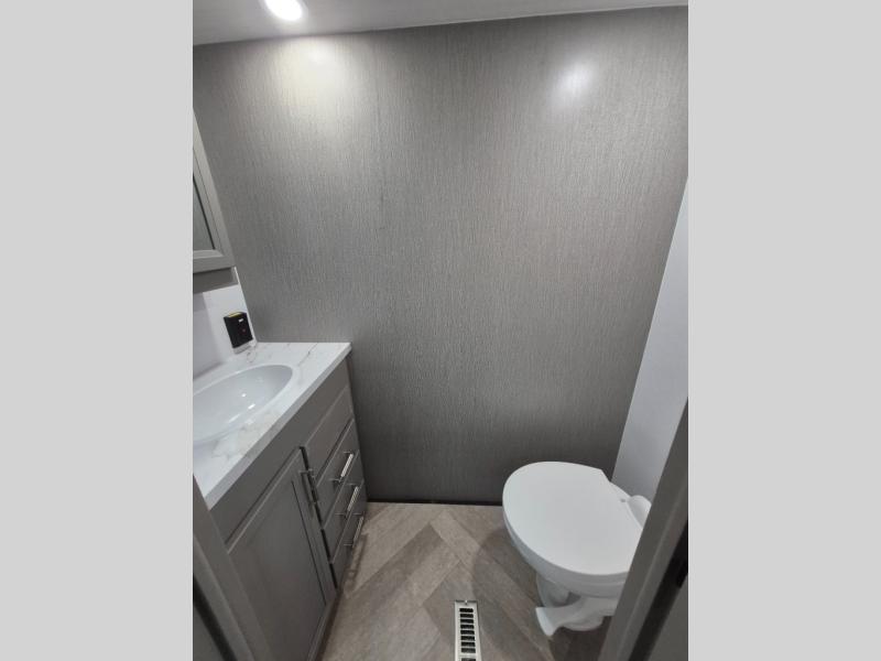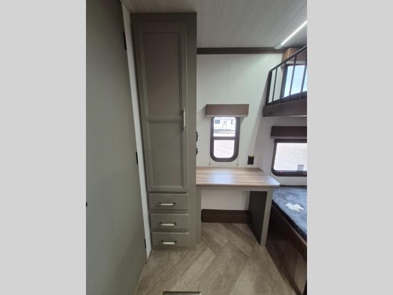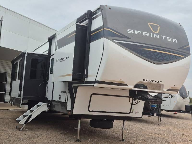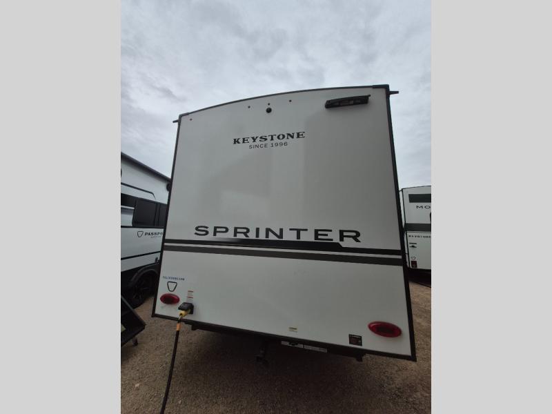 The Sprinter fifth wheels by Keystone feature spacious living areas, plenty of storage, and outstanding towability. Each unit is constructed with 2" aluminum framed and laminated sidewalls, a fully walkable roof, and dual layer insulation to help extend your camping season. The heated pass-through storage includes lockable slam latch baggage doors so you can easily pack your gear, and the one-touch 4-point leveling system features return hookup memory to have you set up in no-time. Head inside to find Congoleum vinyl flooring, Thomas Payne luxury collection furniture, residential style seamless marbled countertops, and an upgraded bedspread to name a few comforts. The Sprinter also includes a Girard tankless on-demand water heater, a central command center, plus a 30k BTU furnace and two A/C units to ensure your comfort!