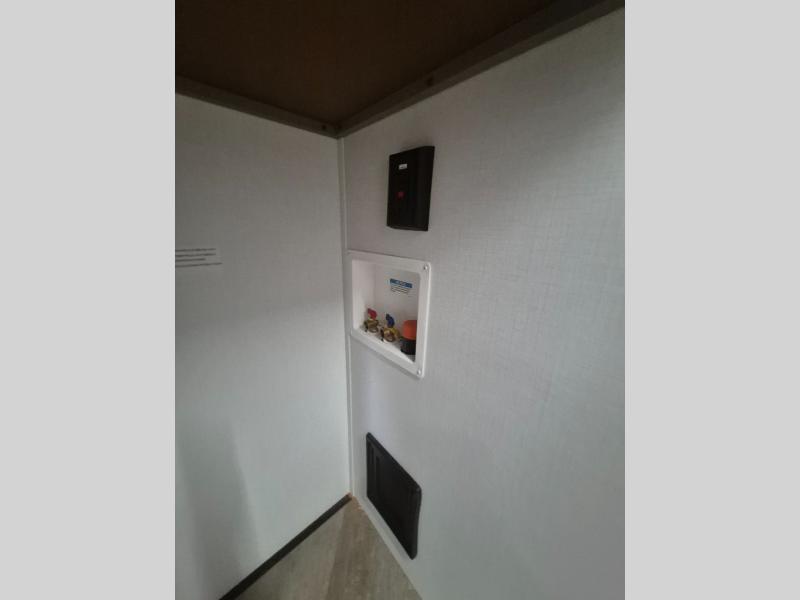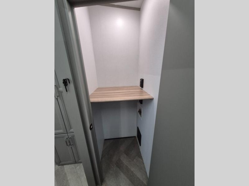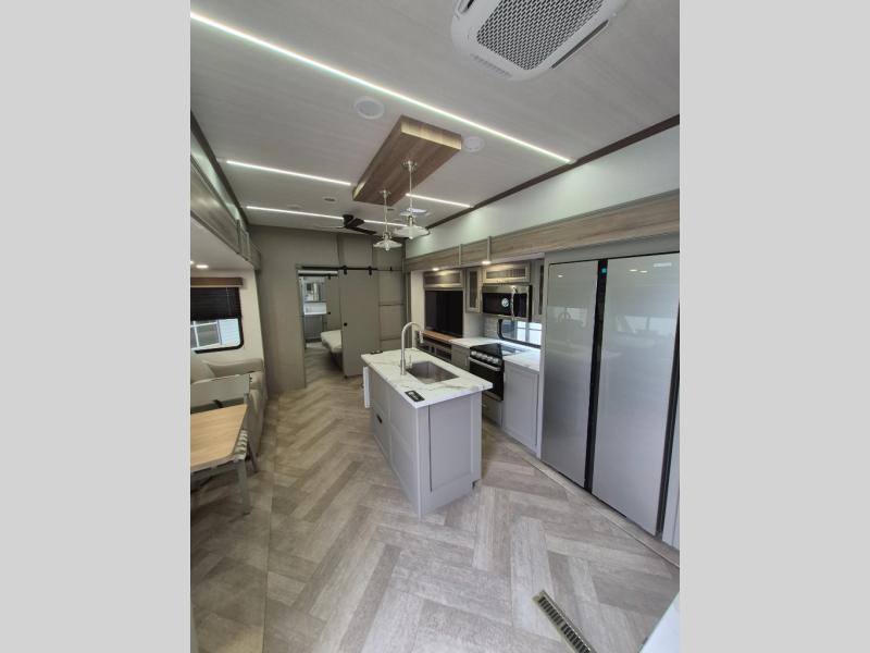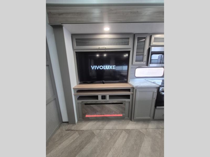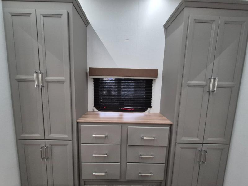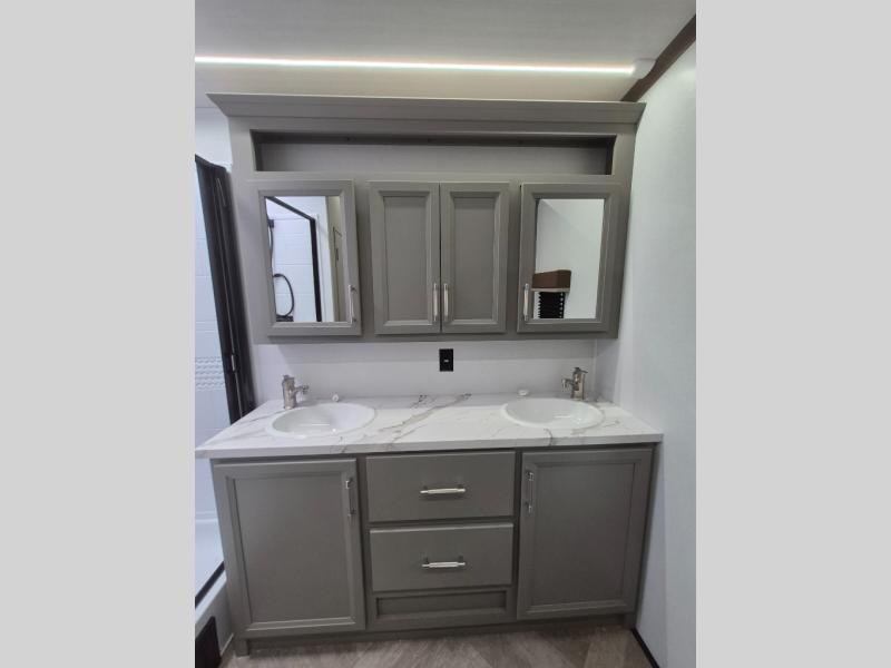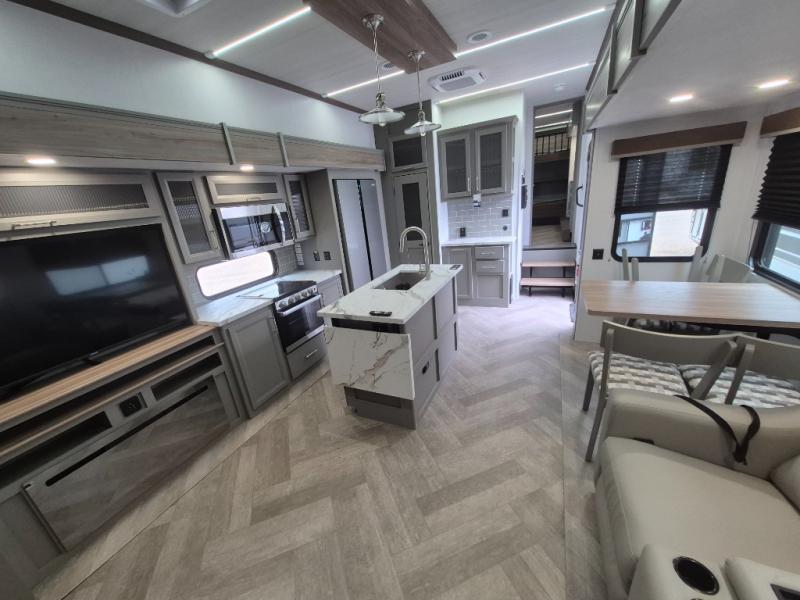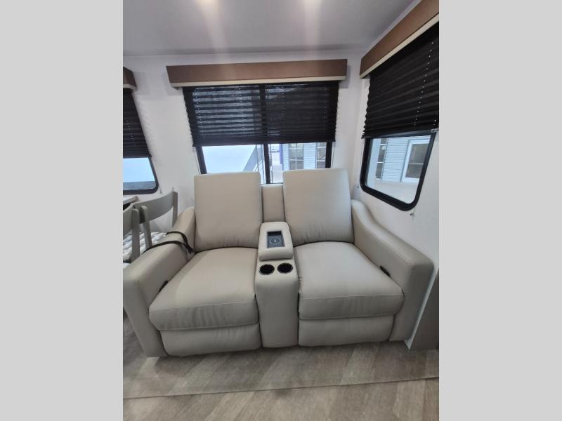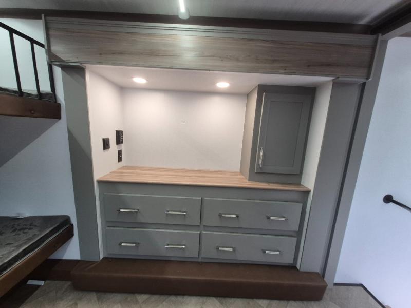 Pack your bags and head to your favorite state park in this four slide out fifth wheel. Up front, the bunkhouse suite includes two bunk beds, a desk, a slide out with a TV hookup, and a half bath for convenience. You'll have the master bedroom all to yourselves with a king bed slide out, plenty of storage, and a full rear bath with dual bath sinks so you both can get ready for bed at once. The chef of your group can make meals on the three burner gas range or in the stainless steel microwave, and food can be stored in the 12V refrigerator and pantry. A booth dinette provides a place to dine, or you can choose the optional free-standing dinette. And the full reclining theater seating across from the fireplace and 50" TV will make movie night cozy!