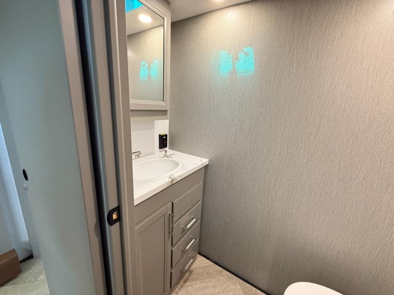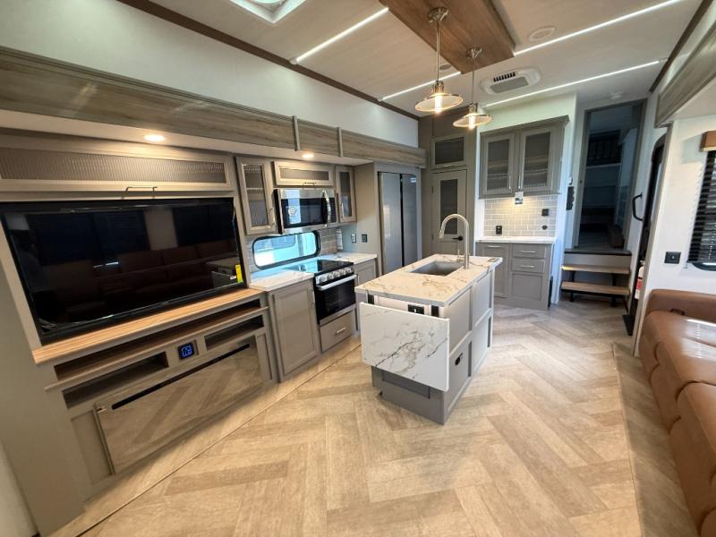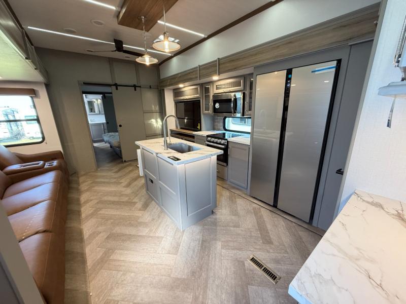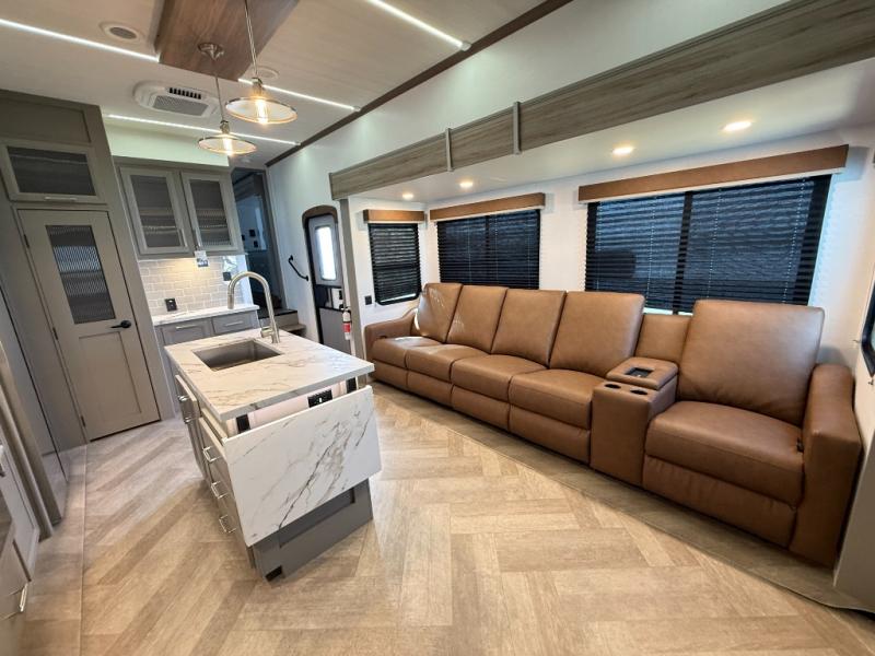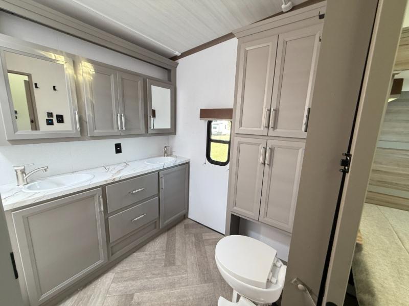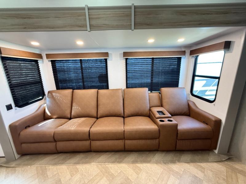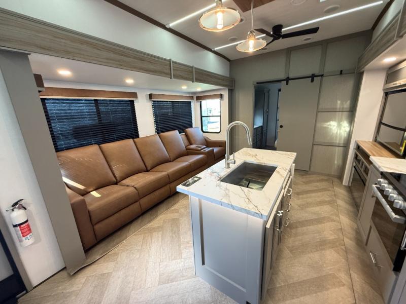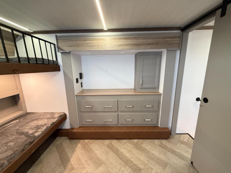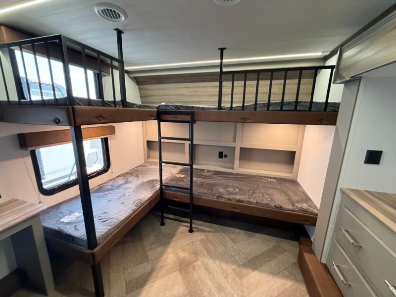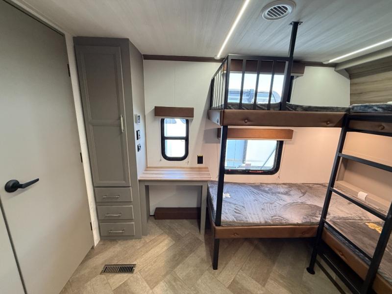 Pack your bags and head to your favorite state park in this four slide out fifth wheel. Up front, the bunkhouse suite includes two bunk beds, a desk, a slide out with a TV hookup, and a half bath for convenience. You'll have the master bedroom all to yourselves with a king bed slide out, plenty of storage, and a full rear bath with dual bath sinks so you both can get ready for bed at once. The chef of your group can make meals on the three burner gas range or in the stainless steel microwave, and food can be stored in the 12V refrigerator and pantry. A booth dinette provides a place to dine, or you can choose the optional free-standing dinette. And the full reclining theater seating across from the fireplace and 50" TV will make movie night cozy!