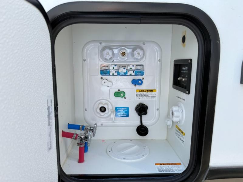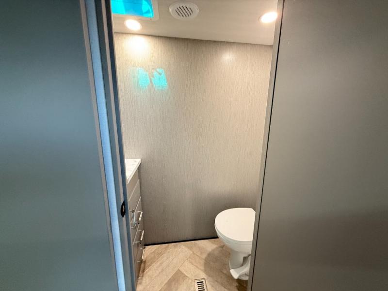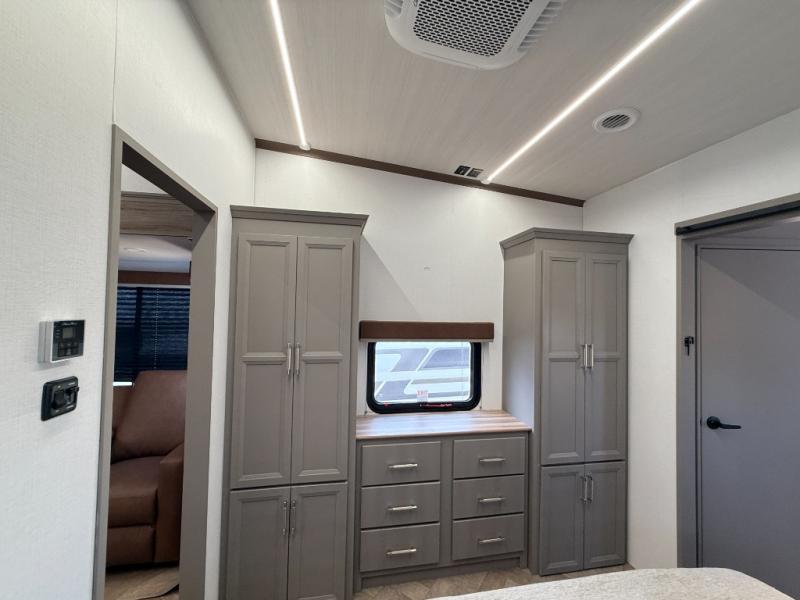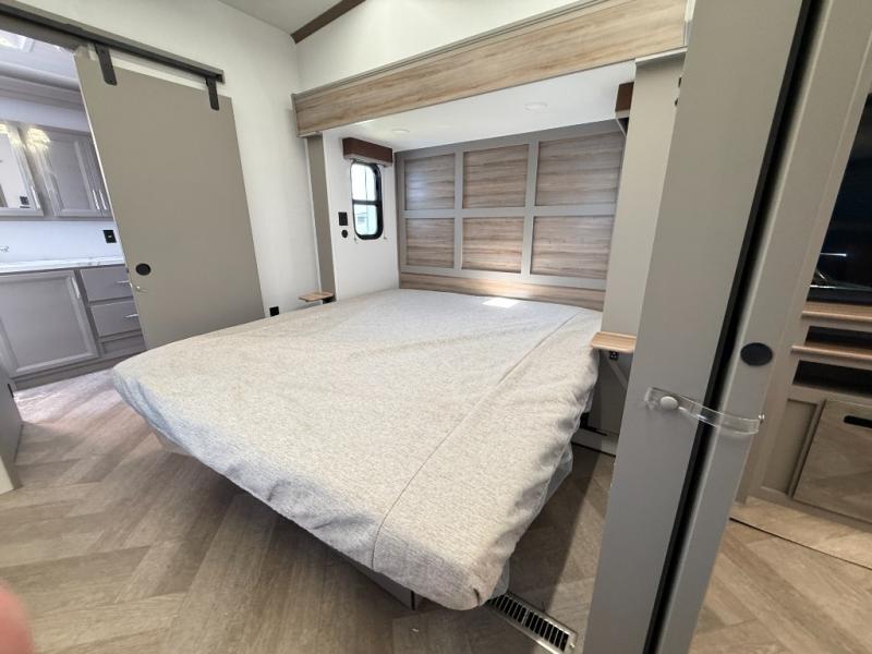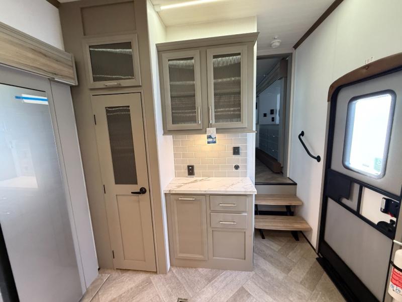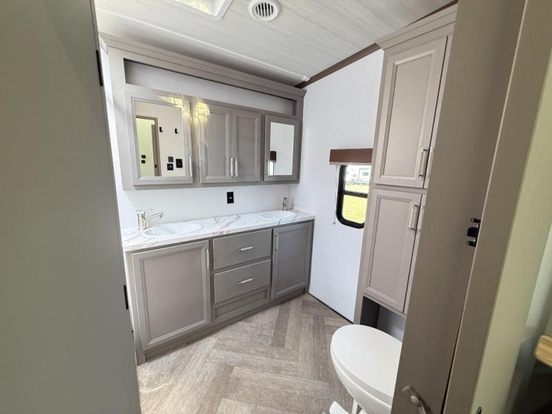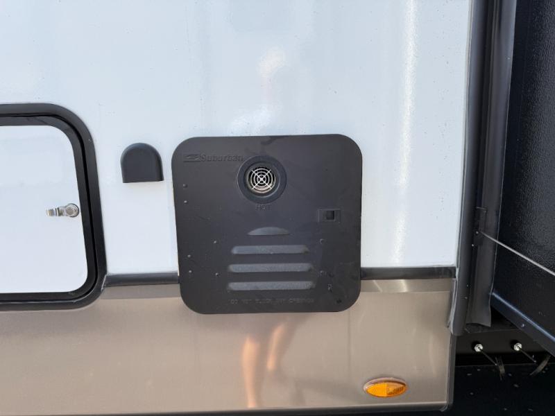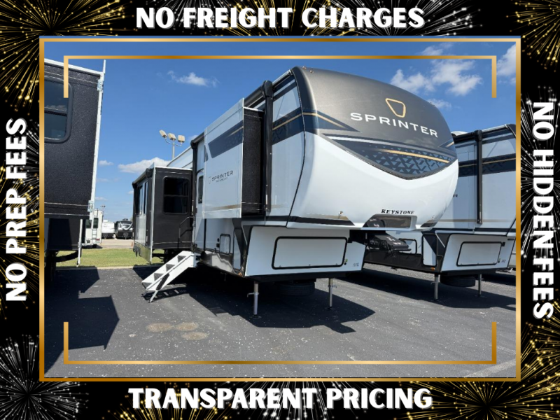 The Sprinter fifth wheels by Keystone feature spacious living areas, plenty of storage, and outstanding towability. Each unit is constructed with 2" aluminum framed and laminated sidewalls, a fully walkable roof, and dual layer insulation to help extend your camping season. The heated pass-through storage includes lockable slam latch baggage doors so you can easily pack your gear, and the one-touch 4-point leveling system features return hookup memory to have you set up in no-time. Head inside to find Congoleum vinyl flooring, Thomas Payne luxury collection furniture, residential style seamless marbled countertops, and an upgraded bedspread to name a few comforts. The Sprinter also includes a Girard tankless on-demand water heater, a central command center, plus a 30k BTU furnace and two A/C units to ensure your comfort!