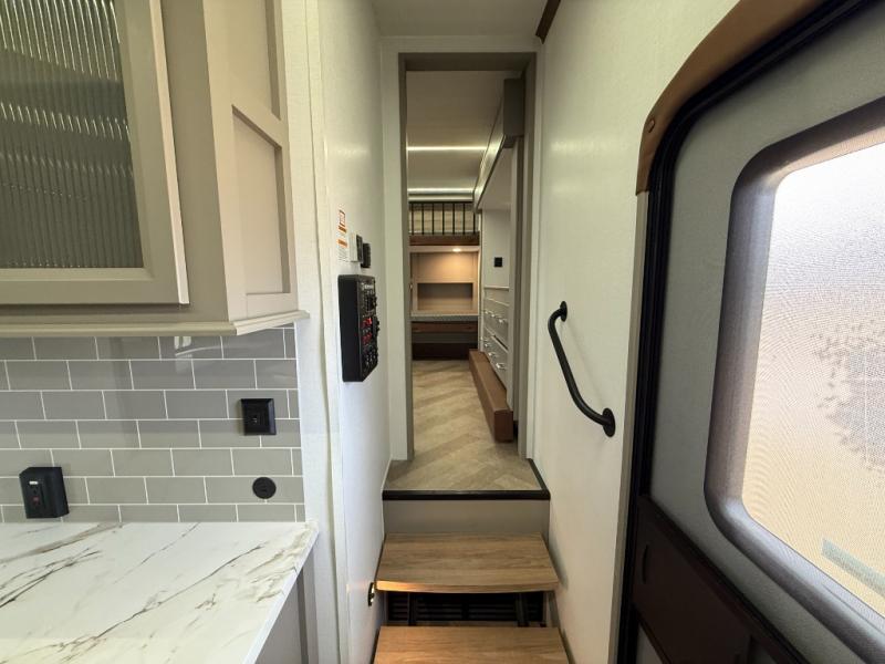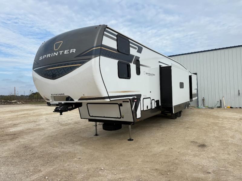 The Sprinter fifth wheels by Keystone feature spacious living areas, plenty of storage, and outstanding towability. Each unit is constructed with 2" aluminum framed and laminated sidewalls, a fully walkable roof, and dual layer insulation to help extend your camping season. The heated pass-through storage includes lockable slam latch baggage doors so you can easily pack your gear, and the one-touch 4-point leveling system features return hookup memory to have you set up in no-time. Head inside to find Congoleum vinyl flooring, Thomas Payne luxury collection furniture, residential style seamless marbled countertops, and an upgraded bedspread to name a few comforts. The Sprinter also includes a Girard tankless on-demand water heater, a central command center, plus a 30k BTU furnace and two A/C units to ensure your comfort!