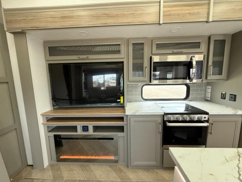 Pack your bags and head to your favorite state park in this four slide out fifth wheel. Up front, the bunkhouse suite includes two bunk beds, a desk, a slide out with a TV hookup, and a half bath for convenience. You'll have the master bedroom all to yourselves with a king bed slide out, plenty of storage, and a full rear bath with dual bath sinks so you both can get ready for bed at once. The chef of your group can make meals on the three burner gas range or in the stainless steel microwave, and food can be stored in the 12V refrigerator and pantry. A booth dinette provides a place to dine, or you can choose the optional free-standing dinette. And the full reclining theater seating across from the fireplace and 50" TV will make movie night cozy!