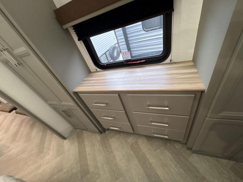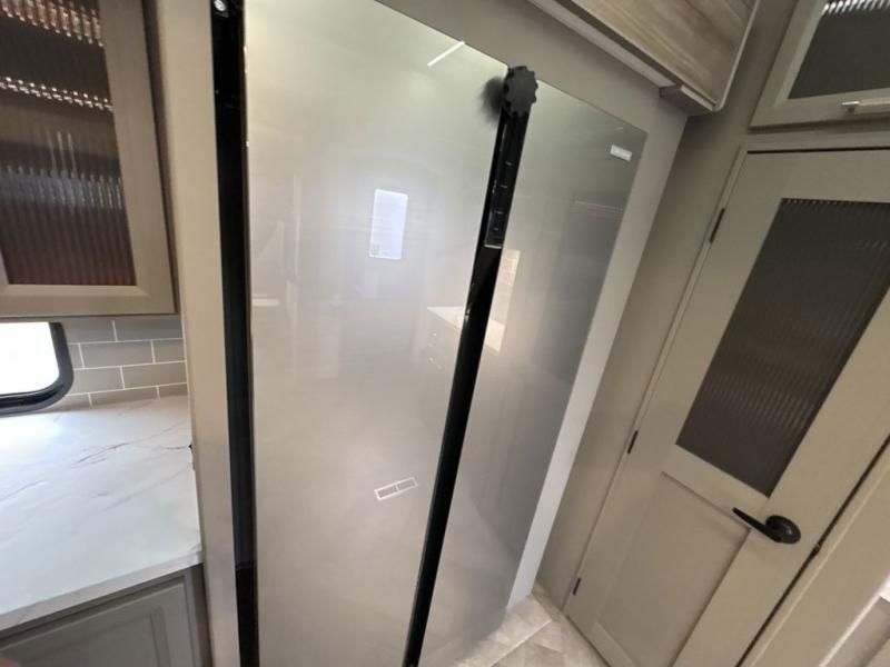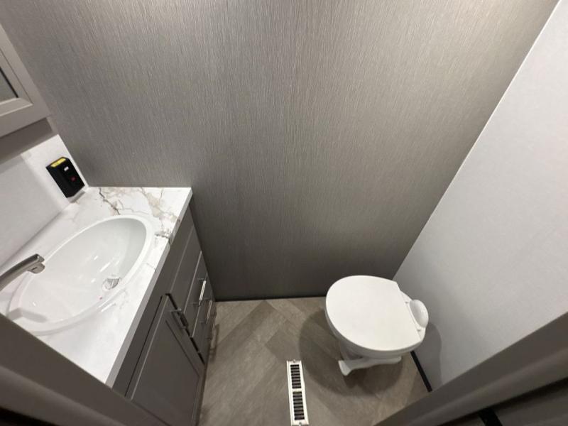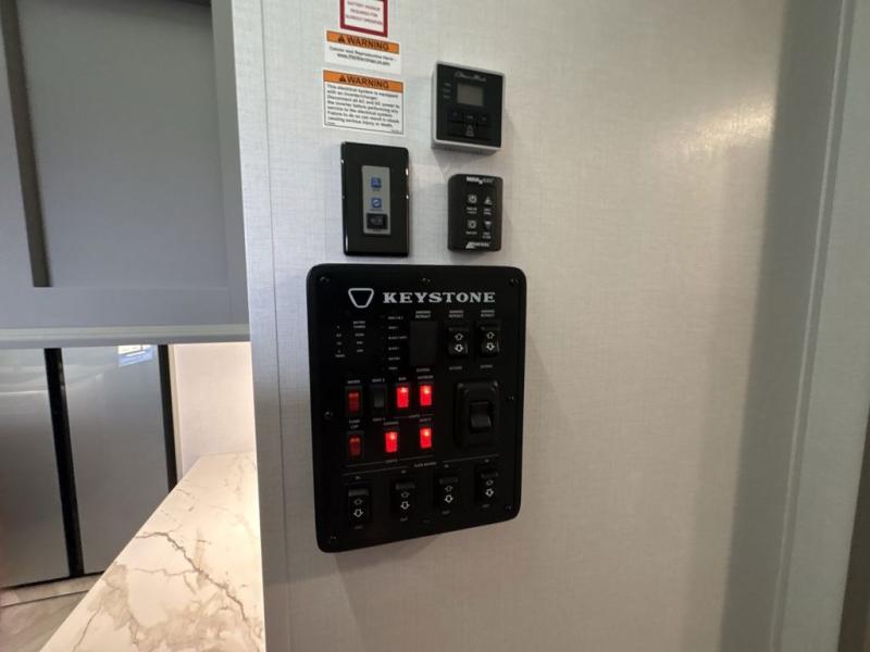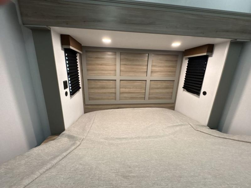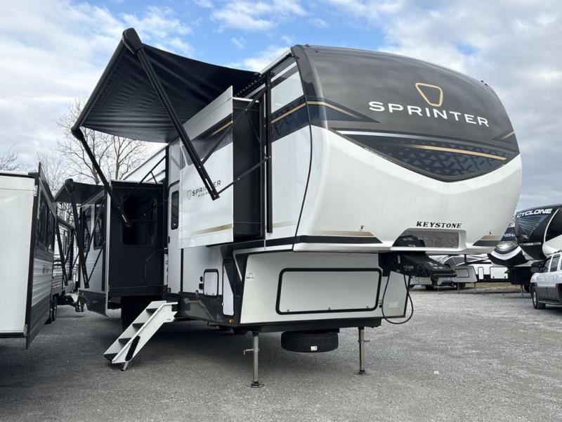 The Sprinter fifth wheels by Keystone feature spacious living areas, plenty of storage, and outstanding towability. Each unit is constructed with 2" aluminum framed and laminated sidewalls, a fully walkable roof, and dual layer insulation to help extend your camping season. The heated pass-through storage includes lockable slam latch baggage doors so you can easily pack your gear, and the one-touch 4-point leveling system features return hookup memory to have you set up in no-time. Head inside to find Congoleum vinyl flooring, Thomas Payne luxury collection furniture, residential style seamless marbled countertops, and an upgraded bedspread to name a few comforts. The Sprinter also includes a Girard tankless on-demand water heater, a central command center, plus a 30k BTU furnace and two A/C units to ensure your comfort!