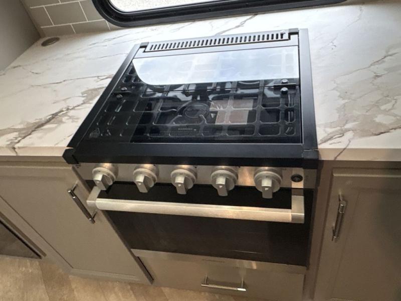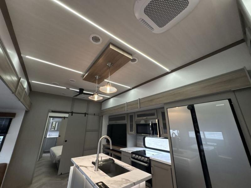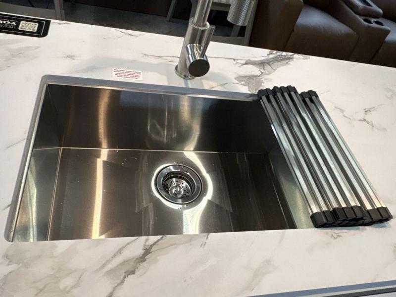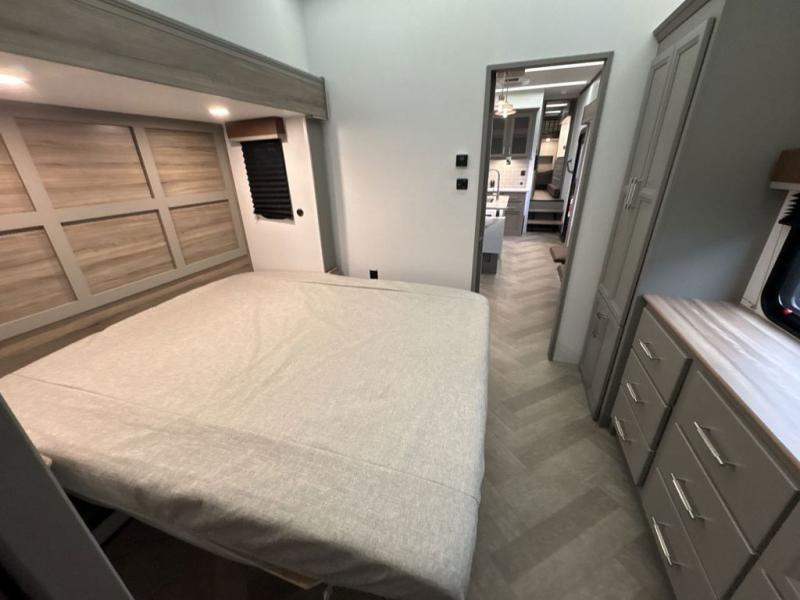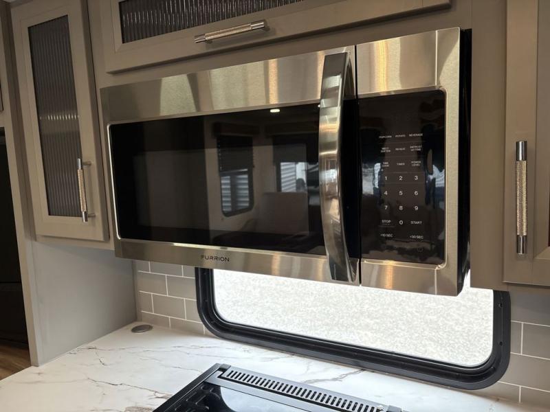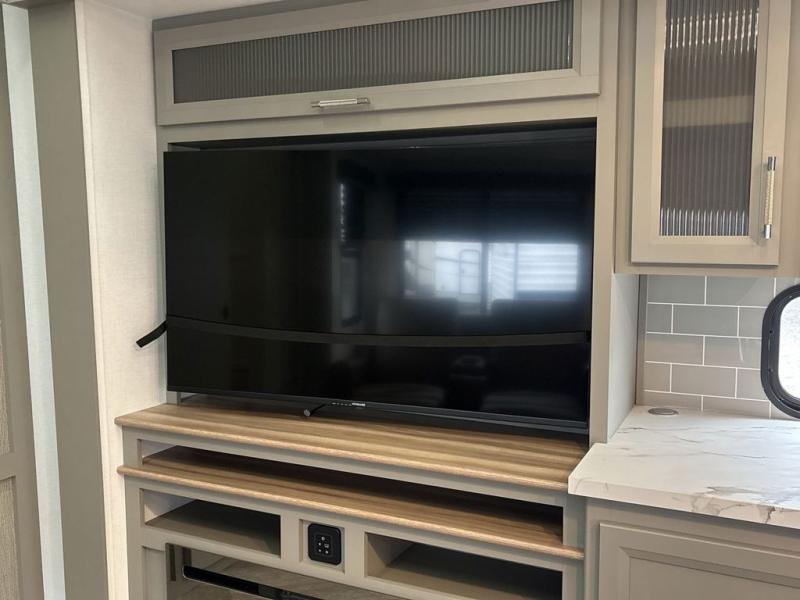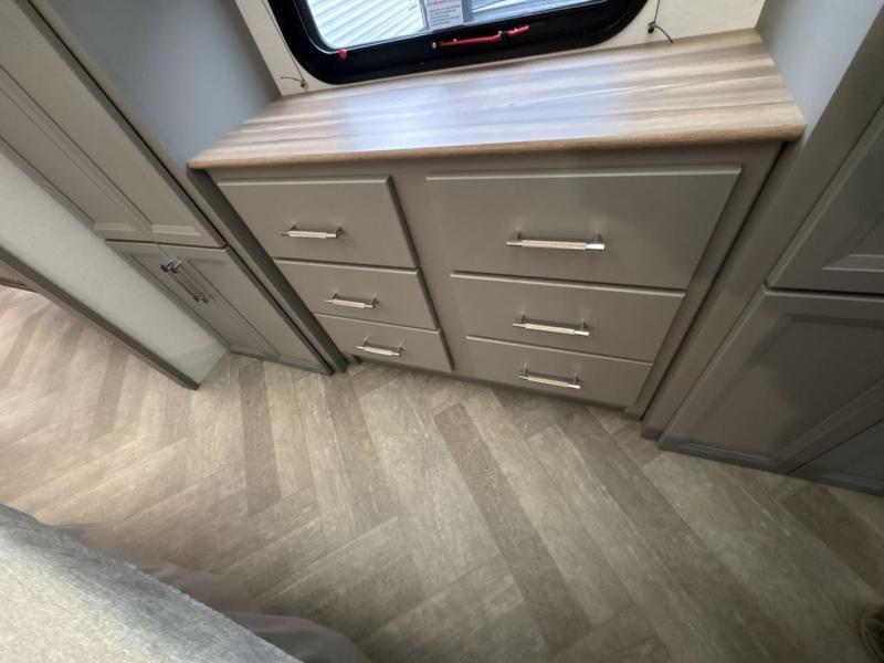 The Sprinter fifth wheels by Keystone feature spacious living areas, plenty of storage, and outstanding towability. Each unit is constructed with 2" aluminum framed and laminated sidewalls, a fully walkable roof, and dual layer insulation to help extend your camping season. The heated pass-through storage includes lockable slam latch baggage doors so you can easily pack your gear, and the one-touch 4-point leveling system features return hookup memory to have you set up in no-time. Head inside to find Congoleum vinyl flooring, Thomas Payne luxury collection furniture, residential style seamless marbled countertops, and an upgraded bedspread to name a few comforts. The Sprinter also includes a Girard tankless on-demand water heater, a central command center, plus a 30k BTU furnace and two A/C units to ensure your comfort!