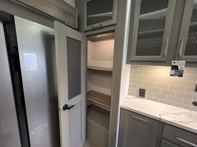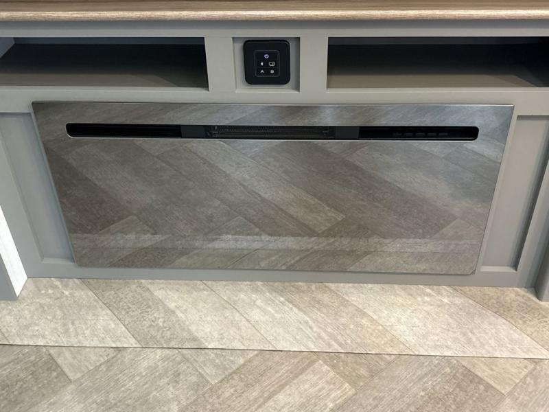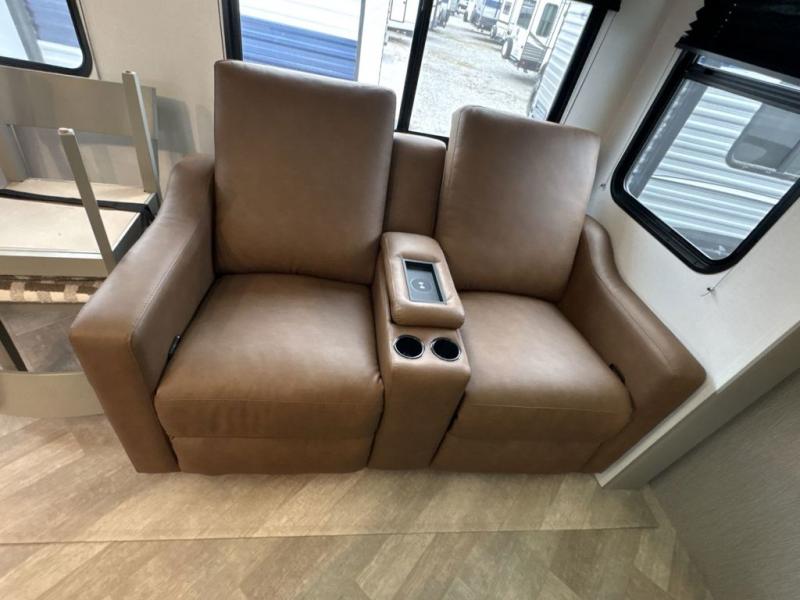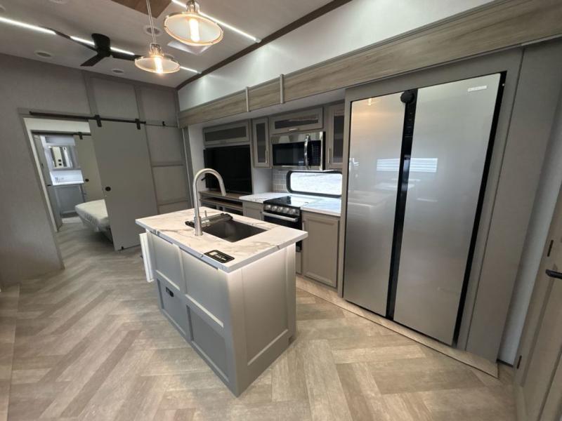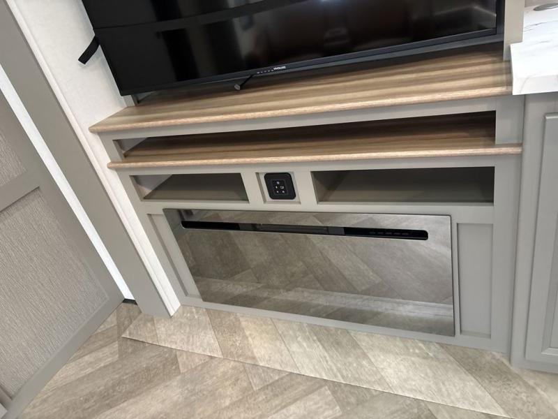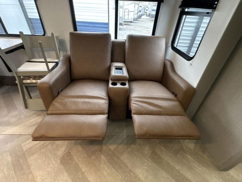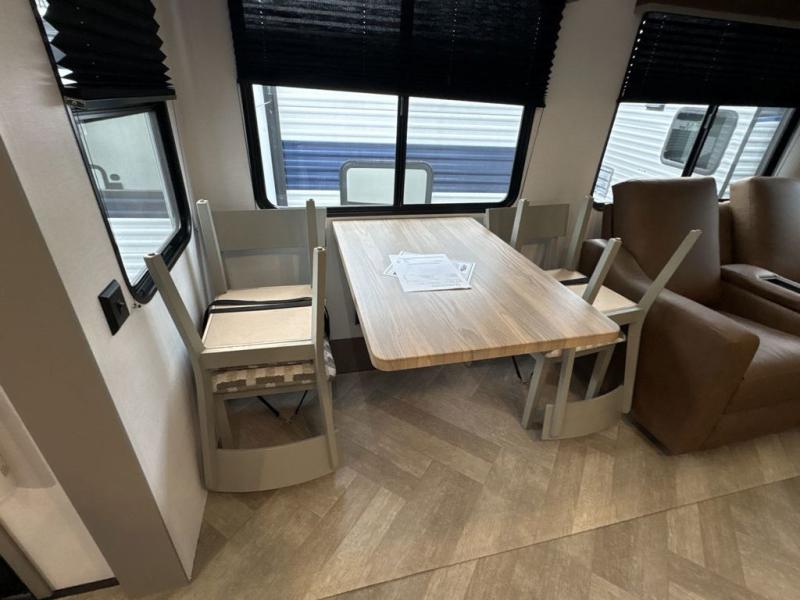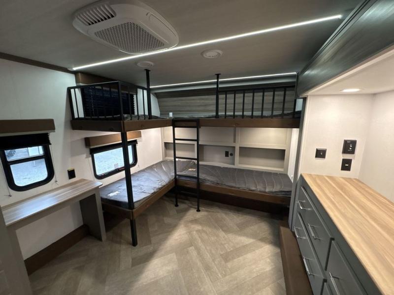 Pack your bags and head to your favorite state park in this four slide out fifth wheel. Up front, the bunkhouse suite includes two bunk beds, a desk, a slide out with a TV hookup, and a half bath for convenience. You'll have the master bedroom all to yourselves with a king bed slide out, plenty of storage, and a full rear bath with dual bath sinks so you both can get ready for bed at once. The chef of your group can make meals on the three burner gas range or in the stainless steel microwave, and food can be stored in the 12V refrigerator and pantry. A booth dinette provides a place to dine, or you can choose the optional free-standing dinette. And the full reclining theater seating across from the fireplace and 50" TV will make movie night cozy!