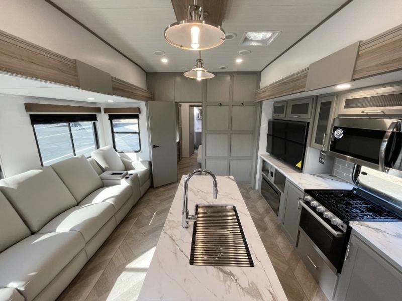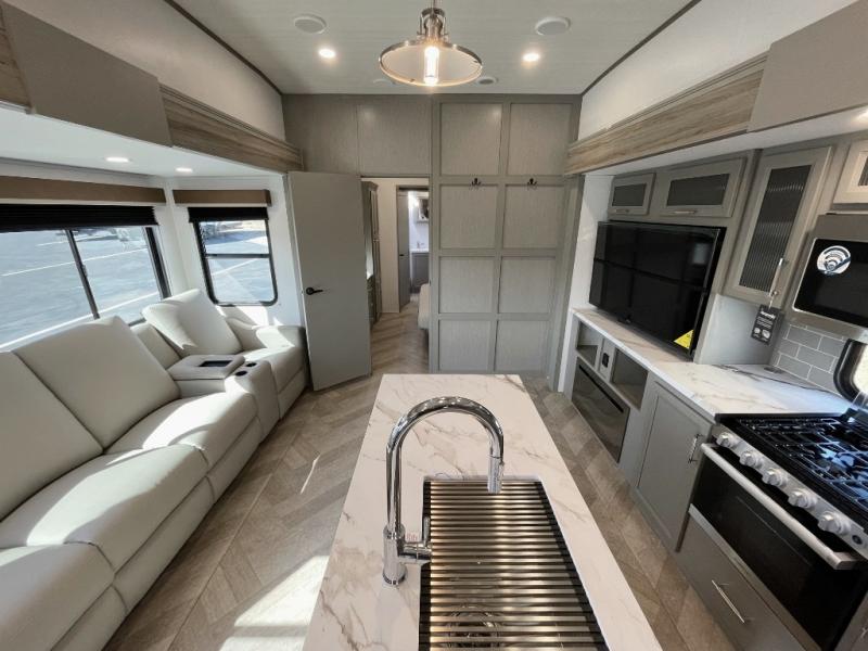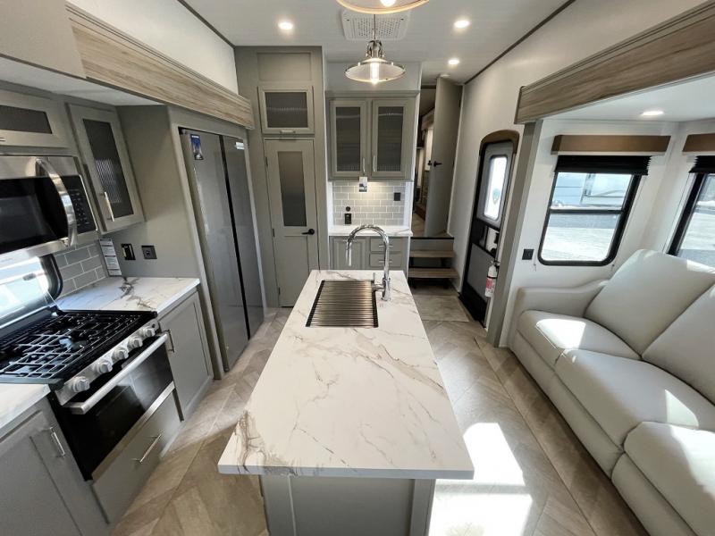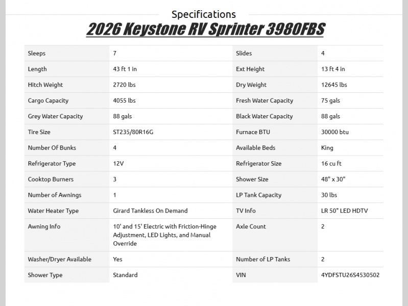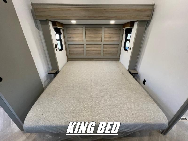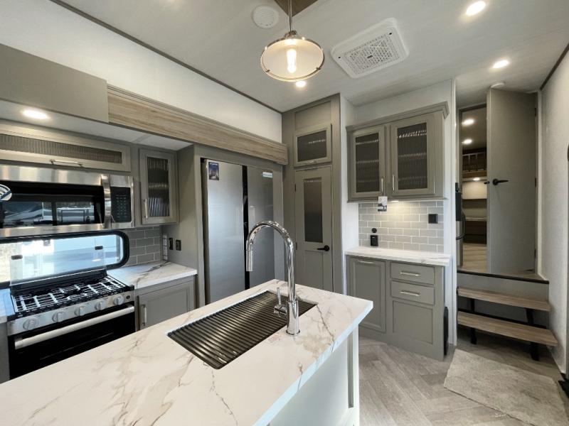 The Sprinter fifth wheels by Keystone feature spacious living areas, plenty of storage, and outstanding towability. Each unit is constructed with 2" thick double welded aluminum frame construction, a fully walkable roof and slide out roof, and dual layer insulation to help extend your camping season. The heated pass-through storage includes lockable slam latch baggage doors so you can easily pack your gear, and the one-touch 4-point leveling system features return hookup memory to have you set up in no-time. Head inside to find DynaSpan Marine Grade floor decking, Thomas Payne luxury collection furniture and residential style seamless marbled countertops to name a few comforts. The Sprinter also includes a Suburban tankless on-demand water heater, black out aluminum wheels, plus a 30k BTU furnace to ensure your comfort!