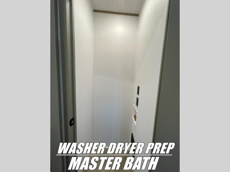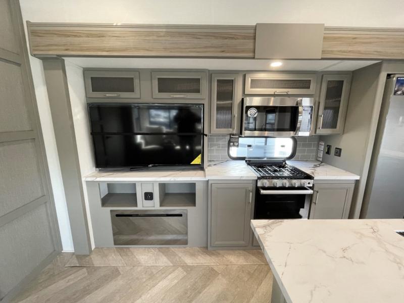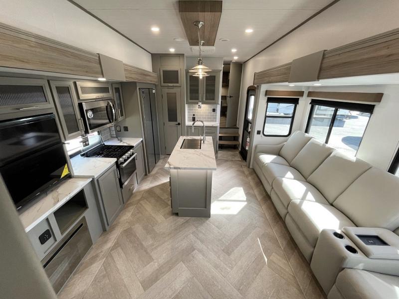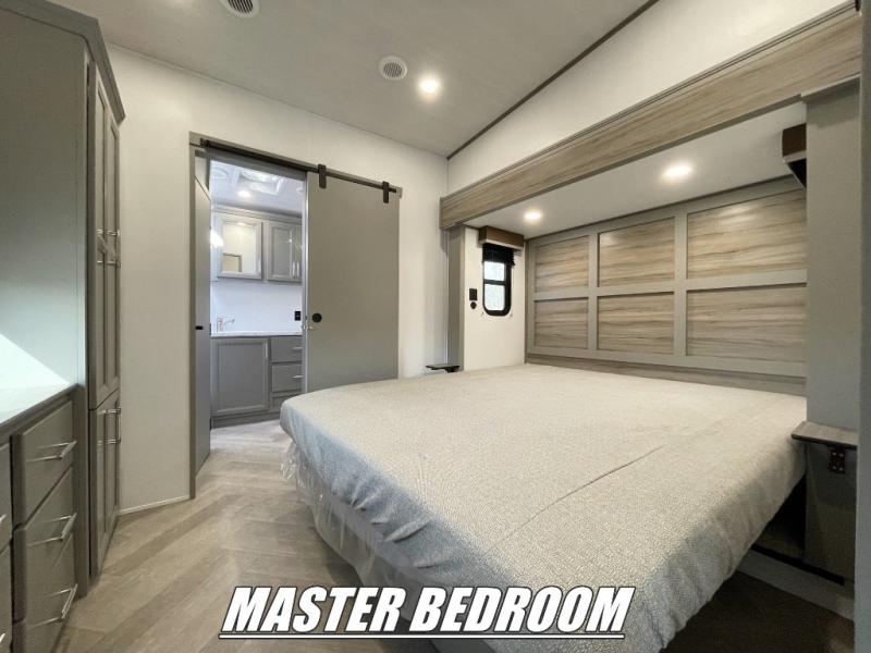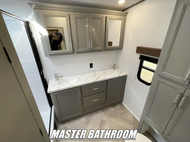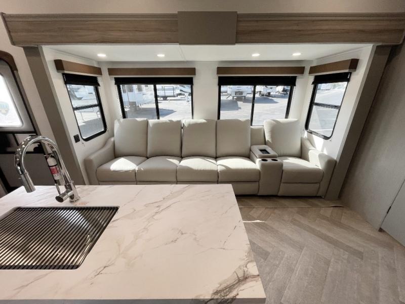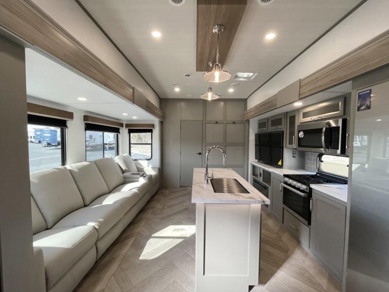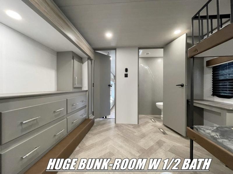 Pack your bags and head to your favorite state park in this four slide out fifth wheel. Up front, the bunkhouse suite includes two bunk beds, a desk, a slide out with a TV hookup, and a half bath for convenience. You'll have the master bedroom all to yourselves with a king bed slide out, plenty of storage, and a full rear bath with dual bath sinks so you both can get ready for bed at once. The chef of your group can make meals on the three burner gas range or in the oversized 30" microwave, and food can be stored in the 12V refrigerator and pantry. A booth dinette provides a place to dine, or you can choose the optional free-standing dinette. And the full reclining theater seating across from the fireplace and 50" TV will make movie night cozy!