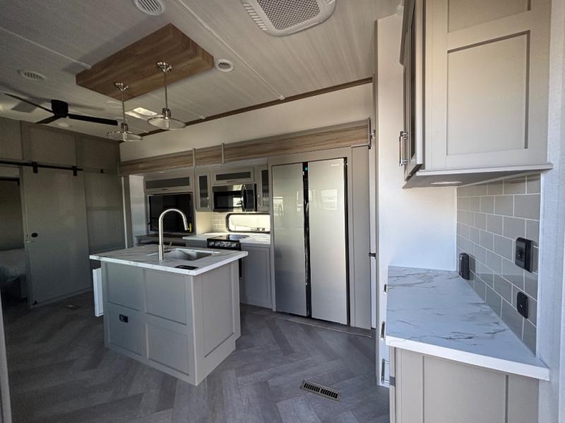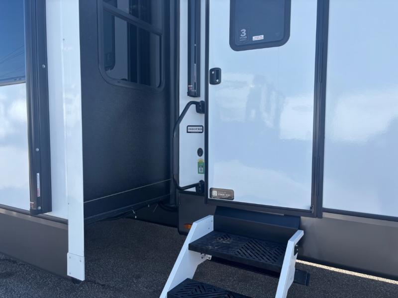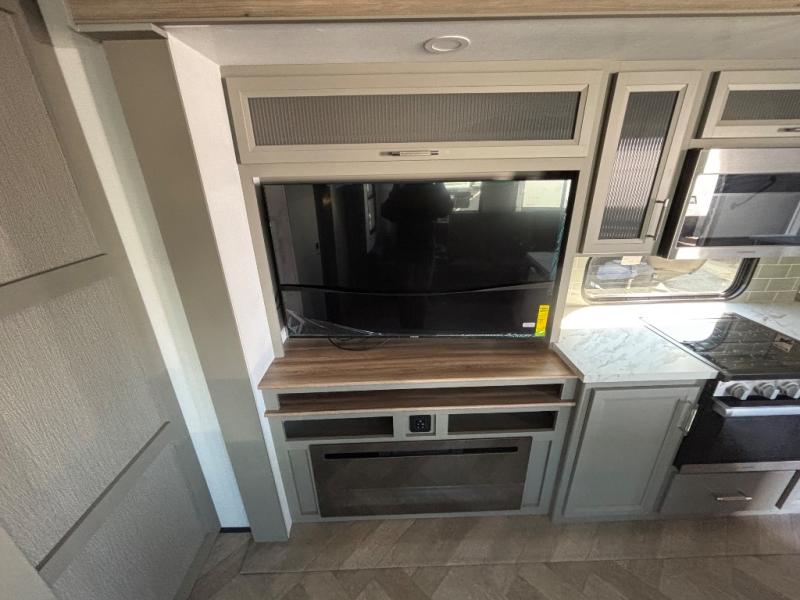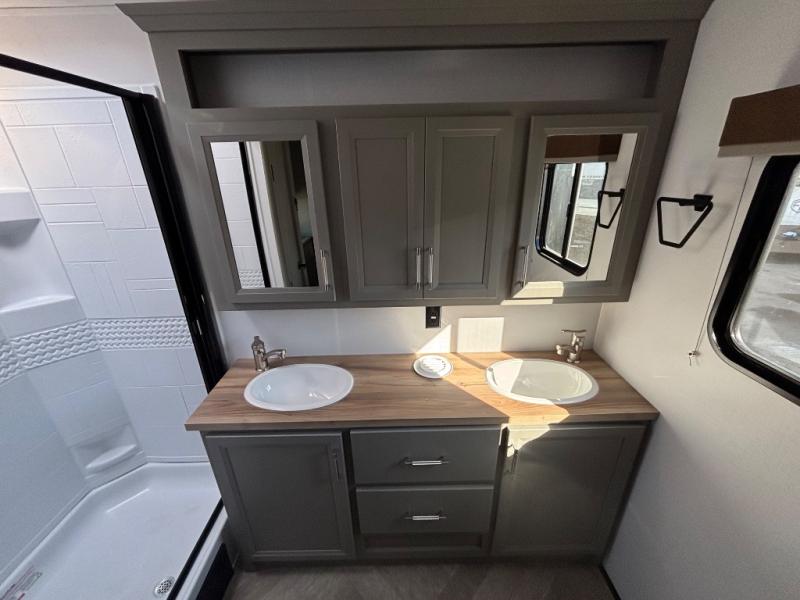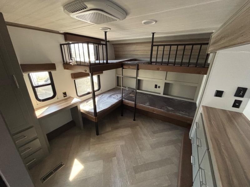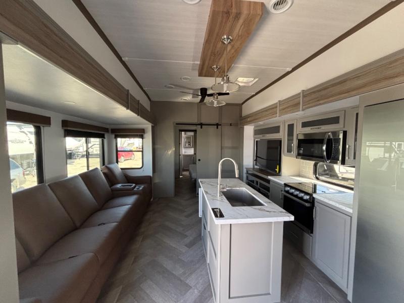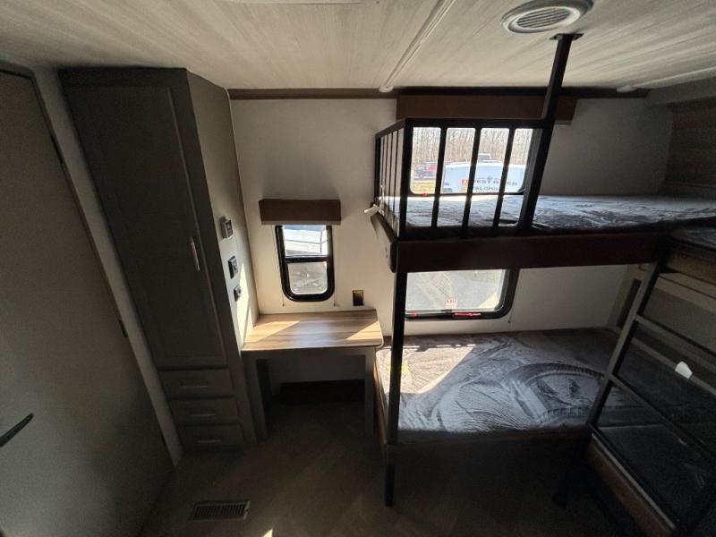Pack your bags and head to your favorite state park in this four slide out fifth wheel. Up front, the bunkhouse suite includes two bunk beds, a desk, a slide out with a TV hookup, and a half bath for convenience. You'll have the master bedroom all to yourselves with a king bed slide out, plenty of storage, and a full rear bath with dual bath sinks so you both can get ready for bed at once. The chef of your group can make meals on the three burner gas range or in the oversized 30" microwave, and food can be stored in the 12V refrigerator and pantry. A booth dinette provides a place to dine, or you can choose the optional free-standing dinette. And the full reclining theater seating across from the fireplace and 50" TV will make movie night cozy!