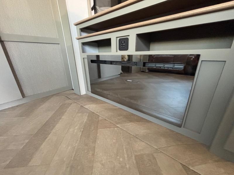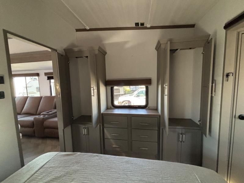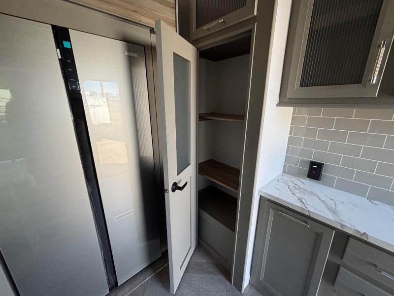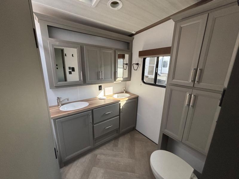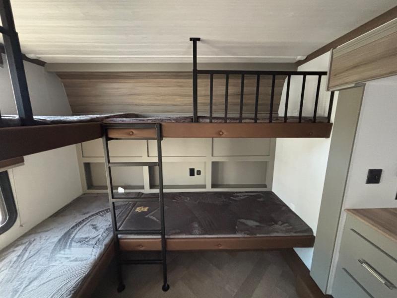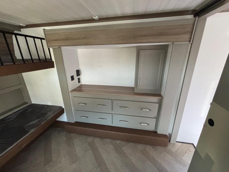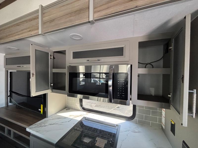 Pack your bags and head to your favorite state park in this four slide out fifth wheel. Up front, the bunkhouse suite includes two bunk beds, a desk, a slide out with a TV hookup, and a half bath for convenience. You'll have the master bedroom all to yourselves with a king bed slide out, plenty of storage, and a full rear bath with dual bath sinks so you both can get ready for bed at once. The chef of your group can make meals on the three burner gas range or in the oversized 30" microwave, and food can be stored in the 12V refrigerator and pantry. A booth dinette provides a place to dine, or you can choose the optional free-standing dinette. And the full reclining theater seating across from the fireplace and 50" TV will make movie night cozy!