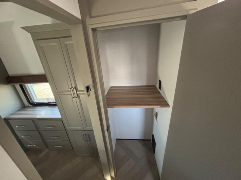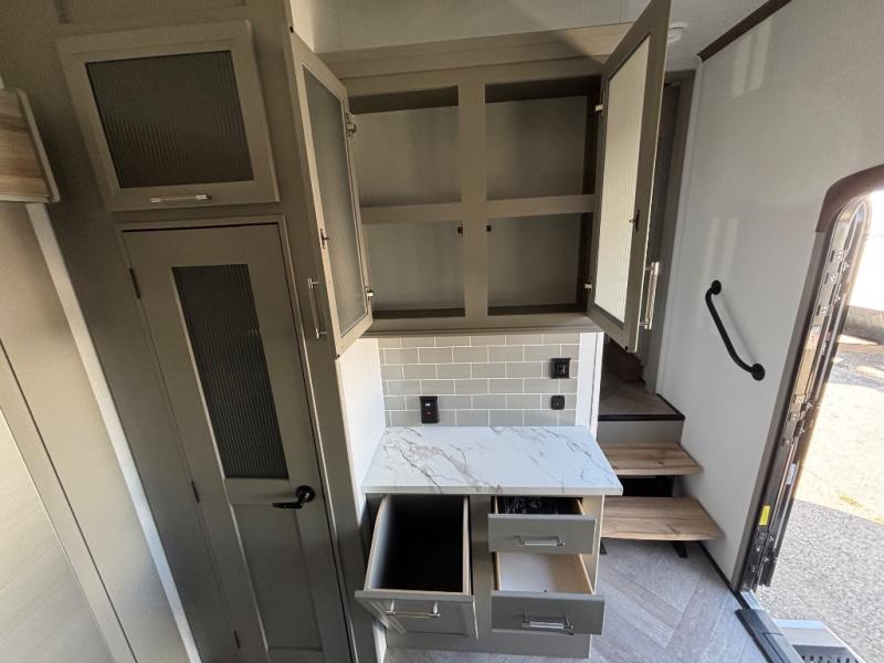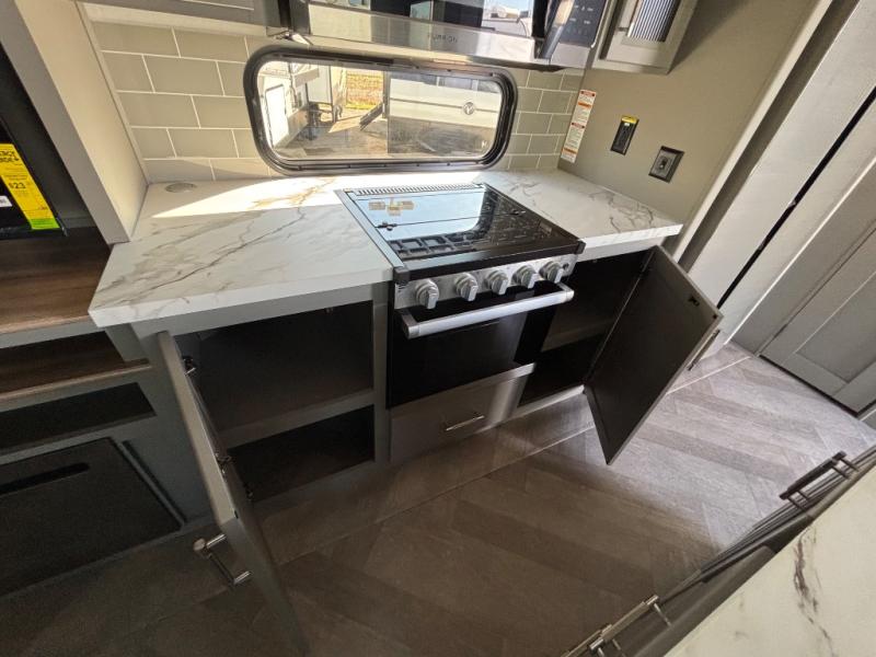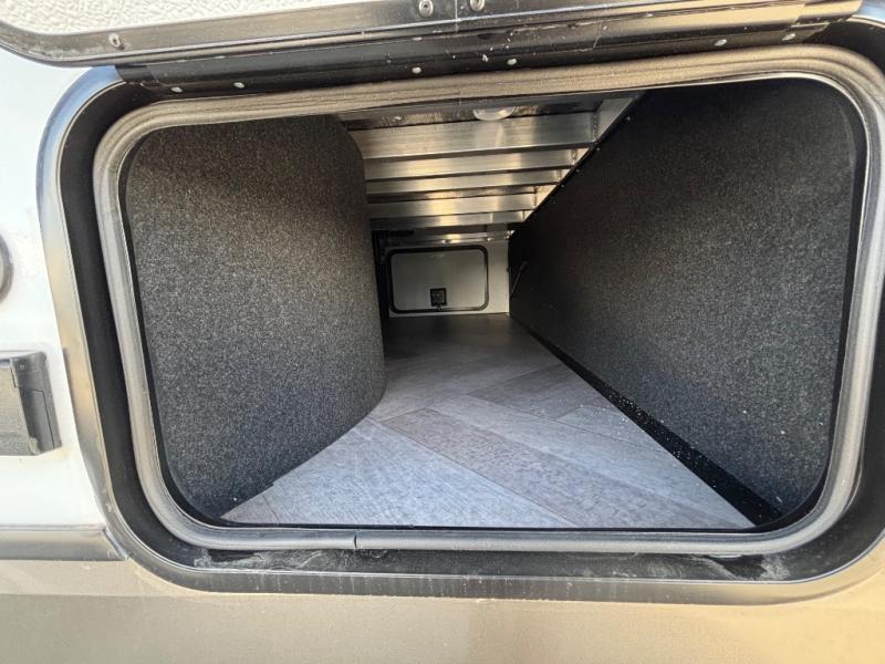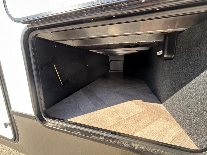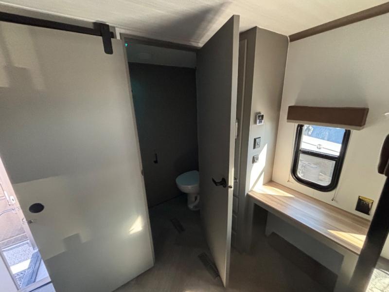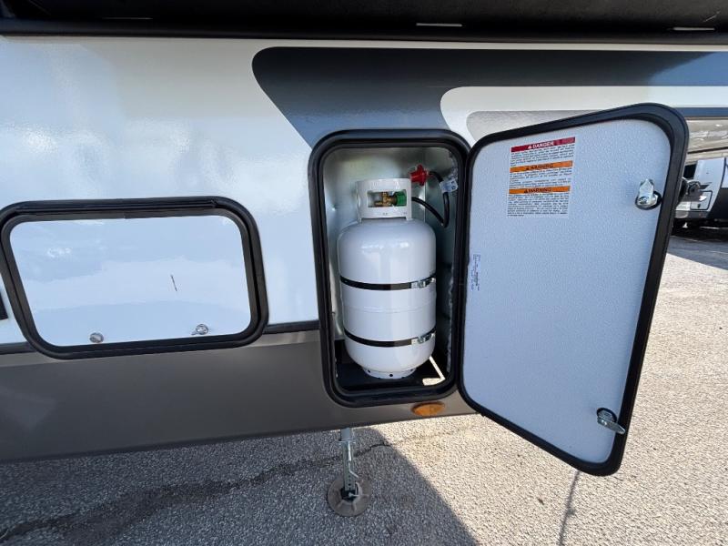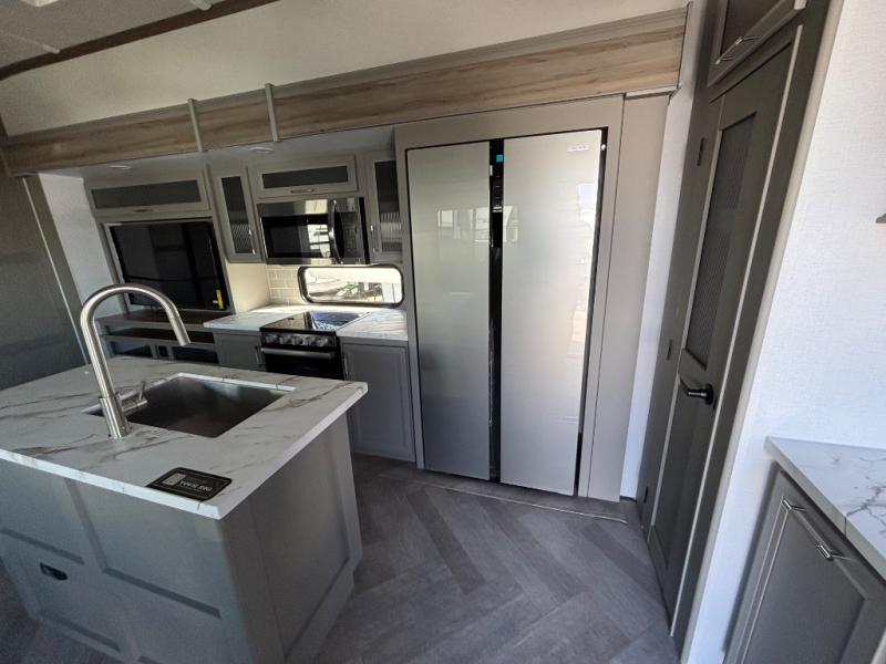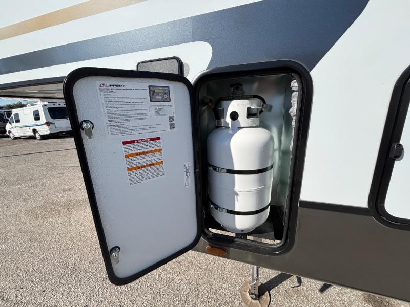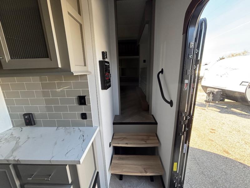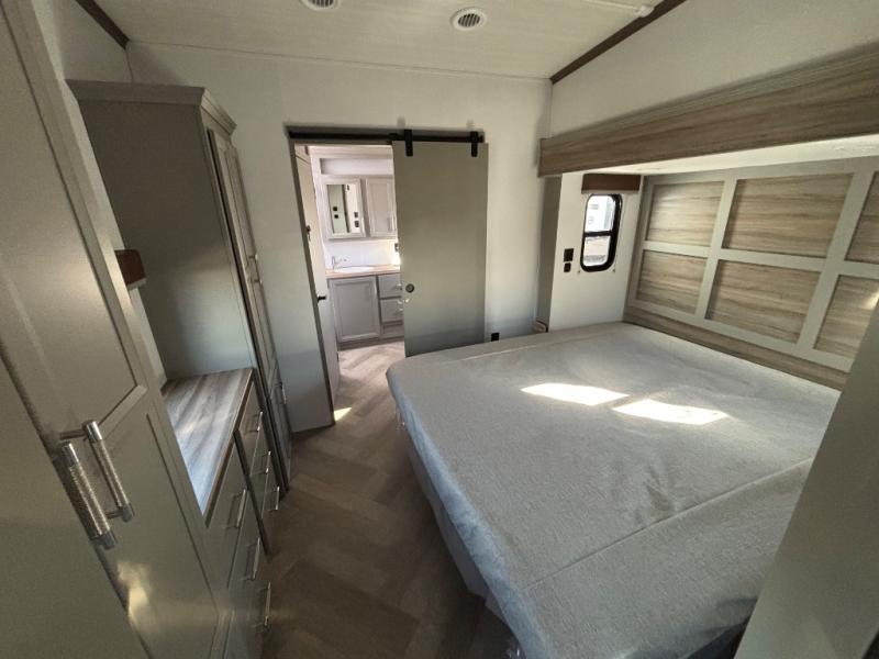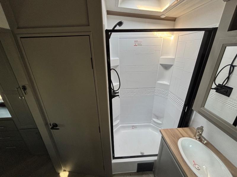 The Sprinter fifth wheels by Keystone feature spacious living areas, plenty of storage, and outstanding towability. Each unit is constructed with 2" thick double welded aluminum frame construction, a fully walkable roof and slide out roof, and dual layer insulation to help extend your camping season. The heated pass-through storage includes lockable slam latch baggage doors so you can easily pack your gear, and the one-touch 4-point leveling system features return hookup memory to have you set up in no-time. Head inside to find DynaSpan Marine Grade floor decking, Thomas Payne luxury collection furniture and residential style seamless marbled countertops to name a few comforts. The Sprinter also includes a Suburban tankless on-demand water heater, black out aluminum wheels, plus a 30k BTU furnace to ensure your comfort!