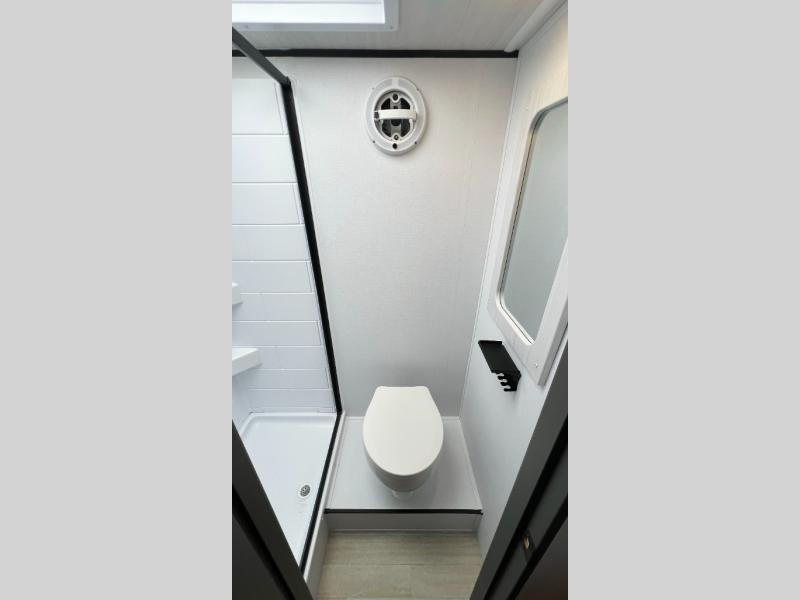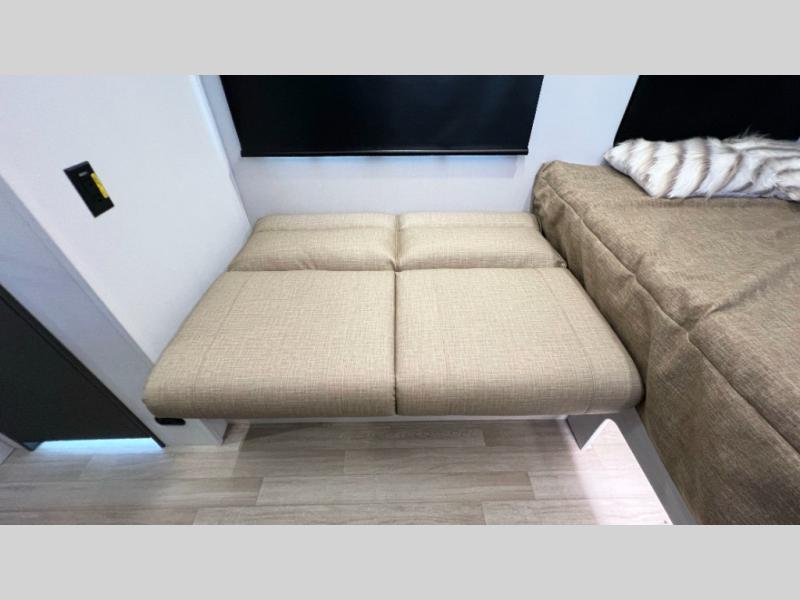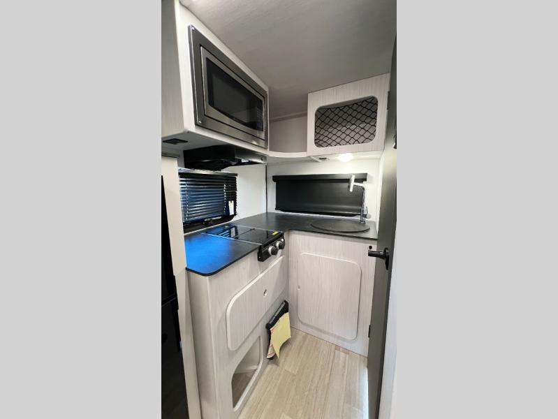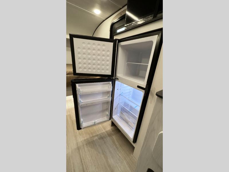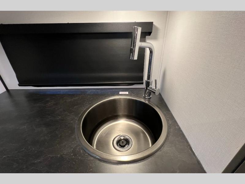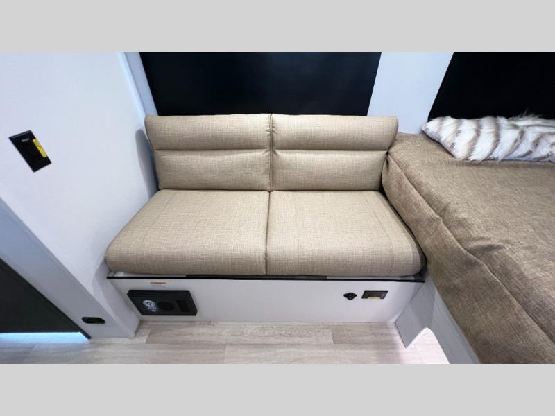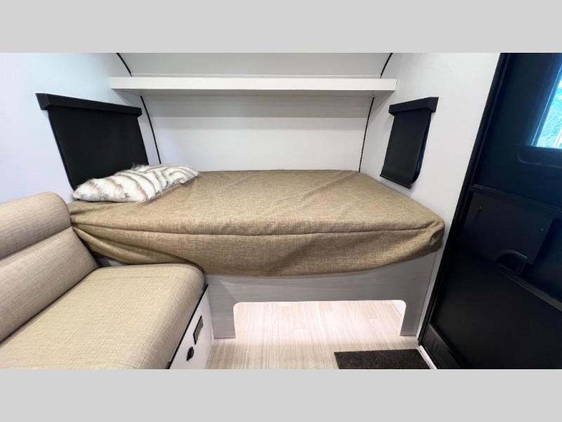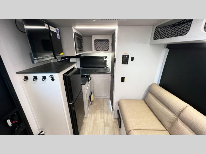 Once you step inside this compact travel trailer, you’re immediately welcomed by a cozy 50" x 80" bed positioned at the front, perfect for a restful night's sleep. At the center, a versatile jack knife sofa provides additional seating and can be easily converted into extra sleeping space if needed. Toward the rear, the corner kitchen is fully equipped with everything you need, including a sleek stainless steel sink, a two-burner cooktop, and a 4-cubic-foot refrigerator ideal for preparing meals on the go. In the opposite rear corner, the bathroom features an upgraded Oxygenics Fury showerhead, delivering a more powerful and comfortable shower experience to complete this well-designed and efficient living space.