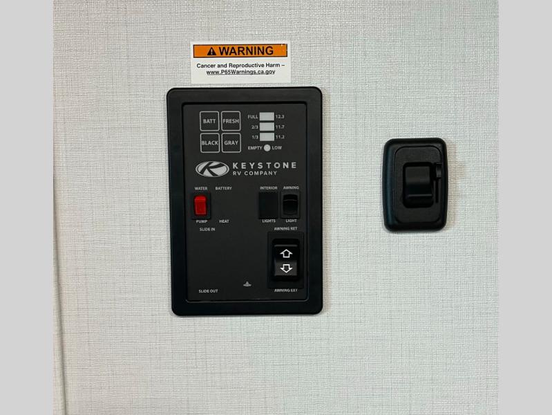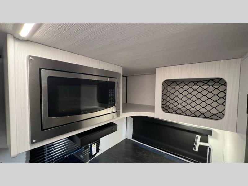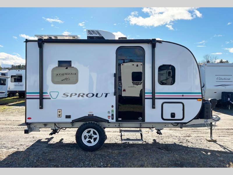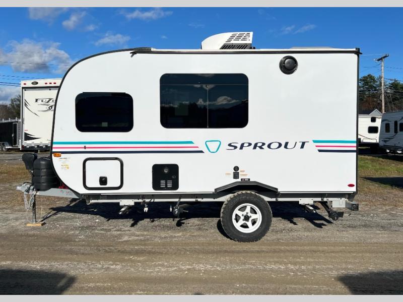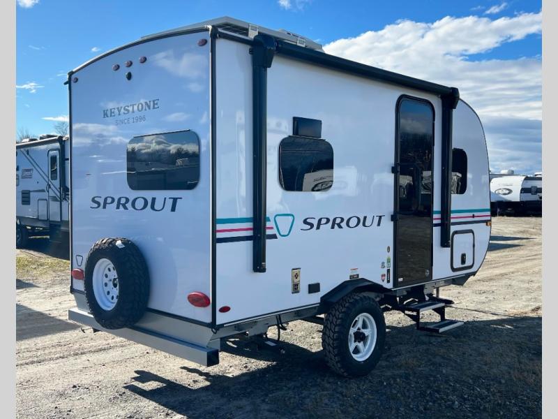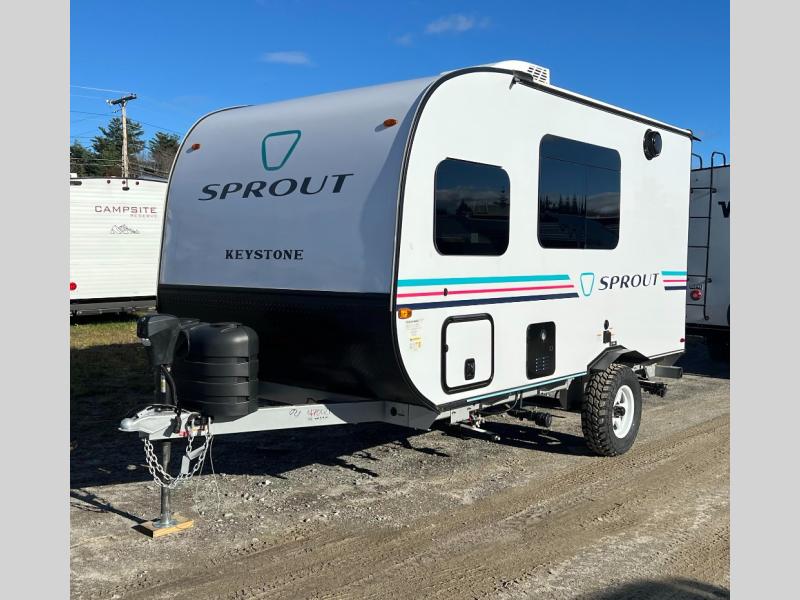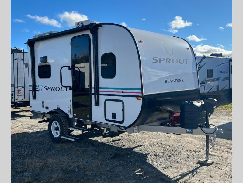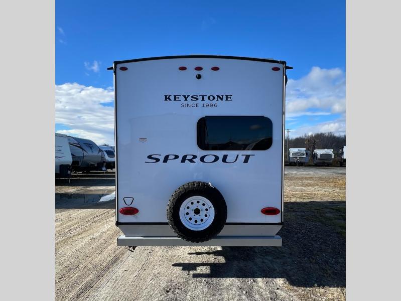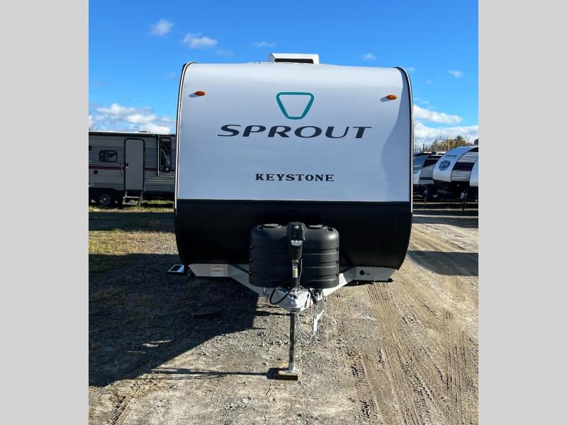 The Sprout travel trailers by Keystone are premium single-axle units that are sure to make an impression at the campground. Each one is built with .040 smooth front medal, one piece heated and enclosed underbelly, power tongue jack. There are also tinted safety glass windows, quick drop stabilizer jacks, and an exterior shower with hot and cold water. Inside, you will enjoy blackout night shades and a 78" interior height, along with an ultra-bright LED light strip and solid surface countertops in the kitchen. The 13,500 BTU A/C and 20,000 BTU furnace will keep you comfortable, and the Suburban tankless water heater is a convenience you won't want to camp without!