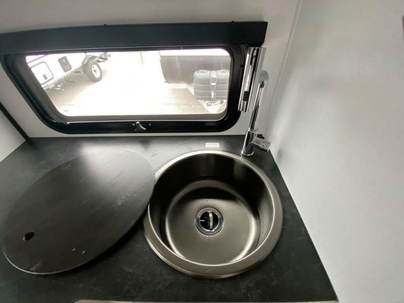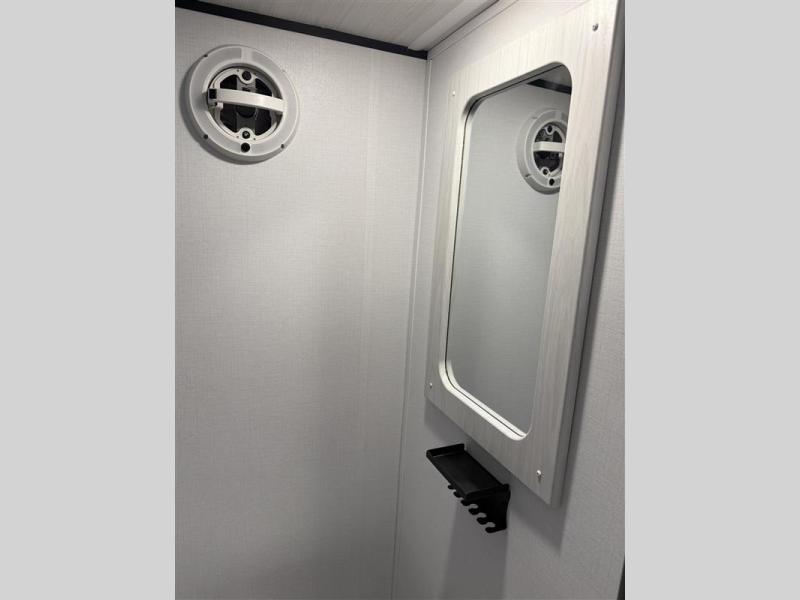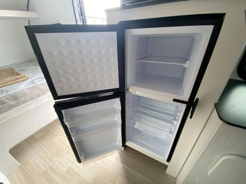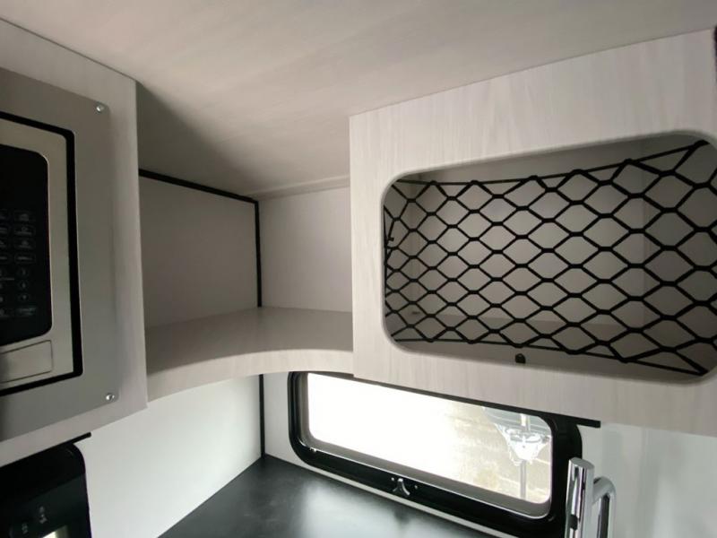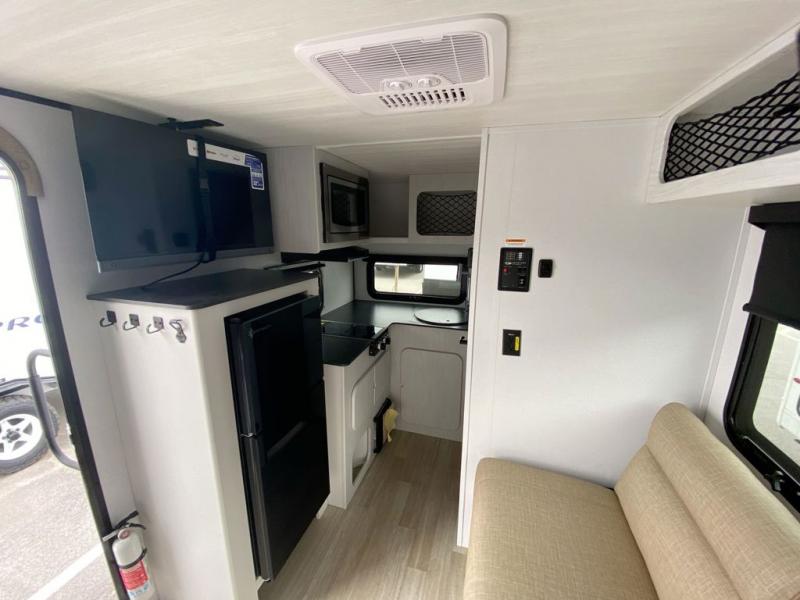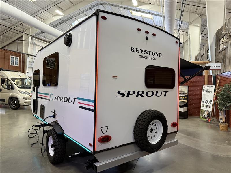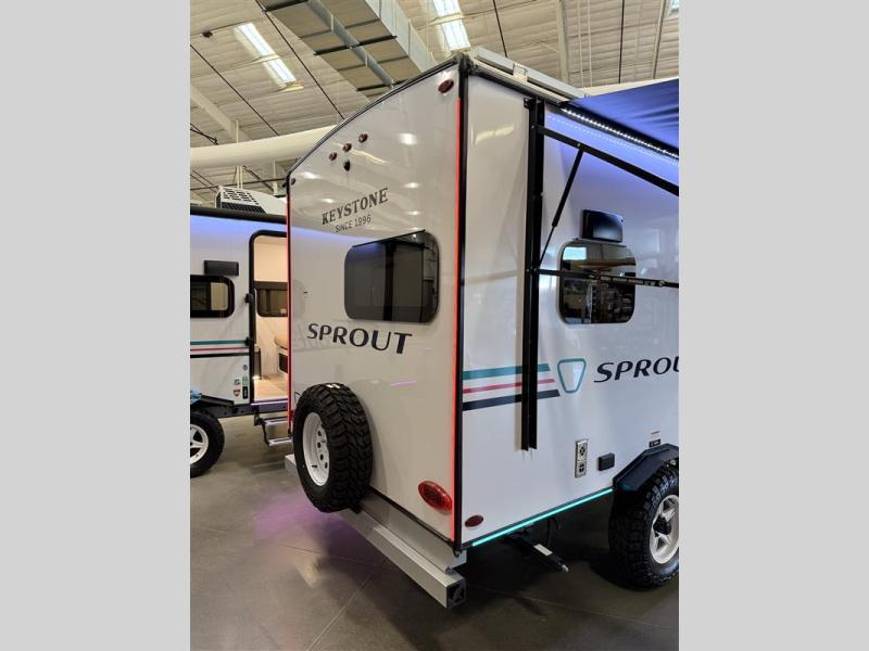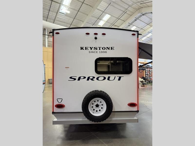The Sprout travel trailers by Keystone are premium single-axle units that are sure to make an impression at the campground. Each one is built with .040 smooth front medal, one piece heated and enclosed underbelly, power tongue jack. There are also tinted safety glass windows, quick drop stabilizer jacks, and an exterior shower with hot and cold water. Inside, you will enjoy blackout night shades and a 78" interior height, along with an ultra-bright LED light strip and solid surface countertops in the kitchen. The 13,500 BTU A/C and 20,000 BTU furnace will keep you comfortable, and the Suburban tankless water heater is a convenience you won't want to camp without!